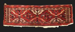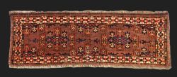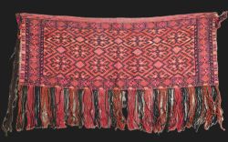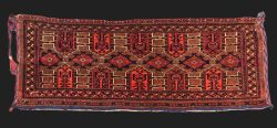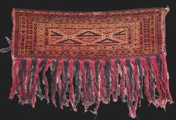 Size: 4ft 3in x 2ft 8in (130 x 81cm). Antique Tekke Turkmen 'Kizil' chuval with a traditional banded design in mixed techniques. Circa 1880. Chuval are storage bags used by the Turkmen nomads for the storage of personal items inside the yurt and also for the transport of goods on the backs of camels or horses. They were usually woven in pairs. 'kizil' translates to red; these chuval are associated with weddings and formed part of the brides dowry, they were prized possessions and passed down through the family. This example is of classic design with very fine decorated bands in pile and flatweave on a madder red ground. These are considered to be the finest knotting of all Tekke weavings. At some time in it's history the back has been removed. The chuval face is in fair condition with light even wear, there are some small historic areas of staining from tribal use. Stock Number: D-0996. All of our prices include FREE WORLD WIDE EXPRESS DELIVERY by DHL. To purchase any item please click on the payment link. We are also happy to accept most payment methods including American Express, bank transfers, debit & credit cards. To purchase by card over the telephone, please contact us on 01608 652111 or 0044 1608 652111 from outside the UK. Internal Ref: D-0996