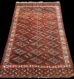 Size: 10ft 7in x 5ft 8in (322 x 173cm). Antique Yomut Turkmen main carpet with the ‘Dyrnak’ gul design and superb large elem panels at both ends. Circa 1870. The carpet has a rich brown ground colour with some very nice blues, ivory and shades of madder red. The carpet has a well drawn curl leaf border. A feature of the carpet are the very wide elem panels at both ends, these are filled with large bird like designs, possibly eagles. The carpet is in excellent condition with even wear and medium pile. The carpet is suitable for normal domestic use. The carpet has been hand washed and is ready for use. Stock Number: MT-042. All of our prices include FREE WORLD WIDE EXPRESS DELIVERY by DHL. To purchase any item please click on the payment link. We are also happy to accept most payment methods including American Express, bank transfers, debit & credit cards. To purchase by card over the telephone, please contact us on 01608 652111 or 0044 1608 652111 from outside the UK. Internal Ref: MT-042