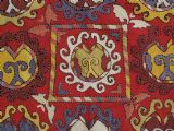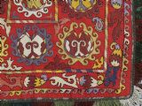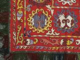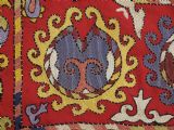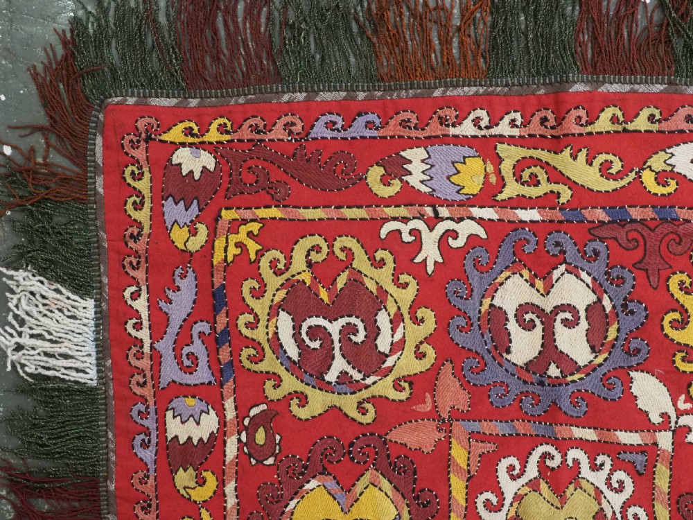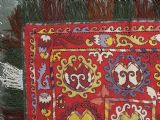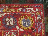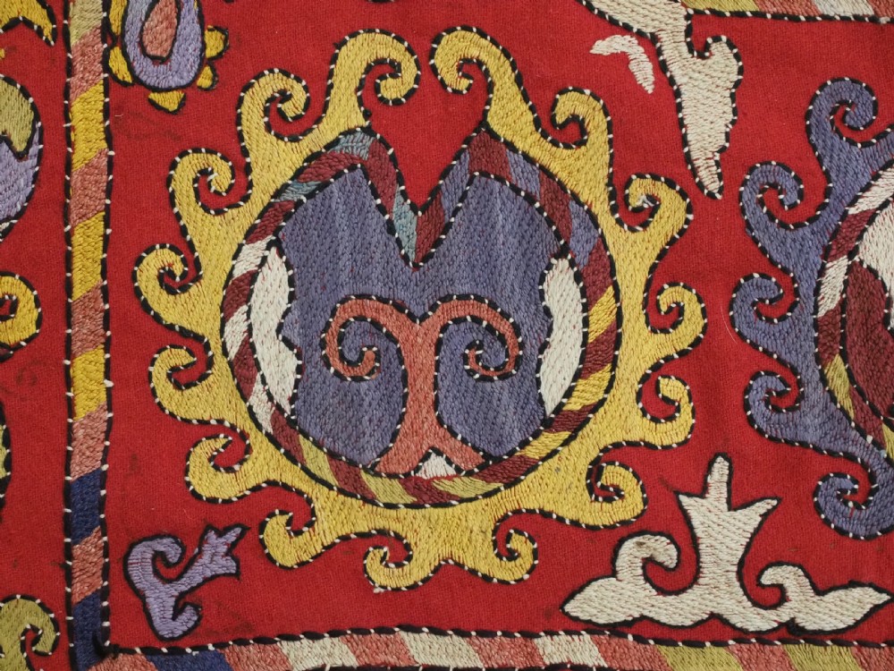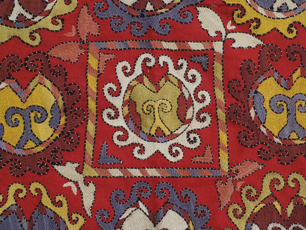 Size: 1ft 8in x 1ft 10in (52 x 57cm) excluding tassels. Antique Uzbek Lakai tribe ilgich, dowry wall hanging for the yurt. Circa 1900. Ilgich are embroidered hangings that usually formed part of a brides dowry; they are talismanic and considered to be protective. This example is embroidered in silk on a red wool ground. The condition is good with some very slight age related wear. The ilgich has been re-backed. Stock Number: T-1606. All of our prices include FREE WORLD WIDE EXPRESS DELIVERY by DHL. To purchase any item please click on the payment link. We are also happy to accept most payment methods including American Express, bank transfers, debit & credit cards. To purchase by card over the telephone, please contact us on 01608 652111 or 0044 1608 652111 from outside the UK. Internal Ref: T-1606