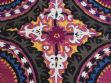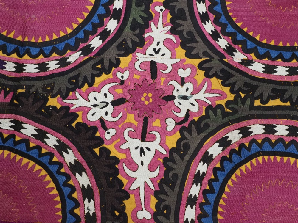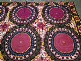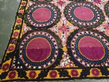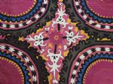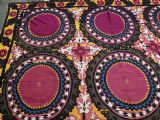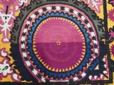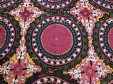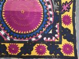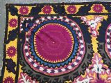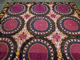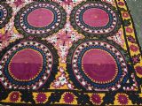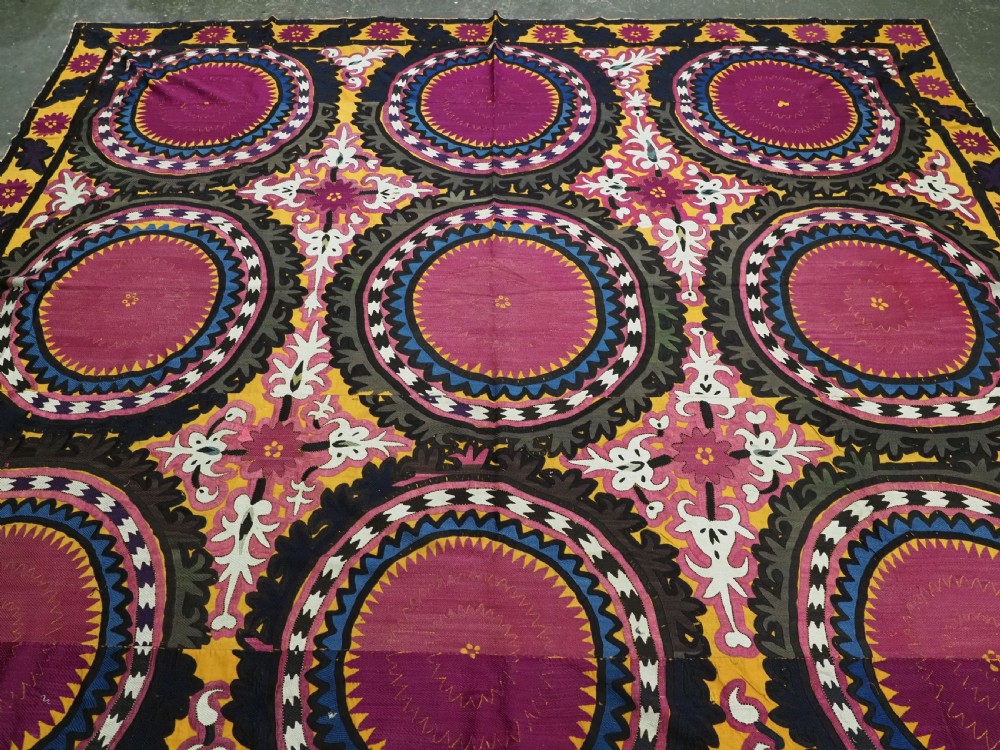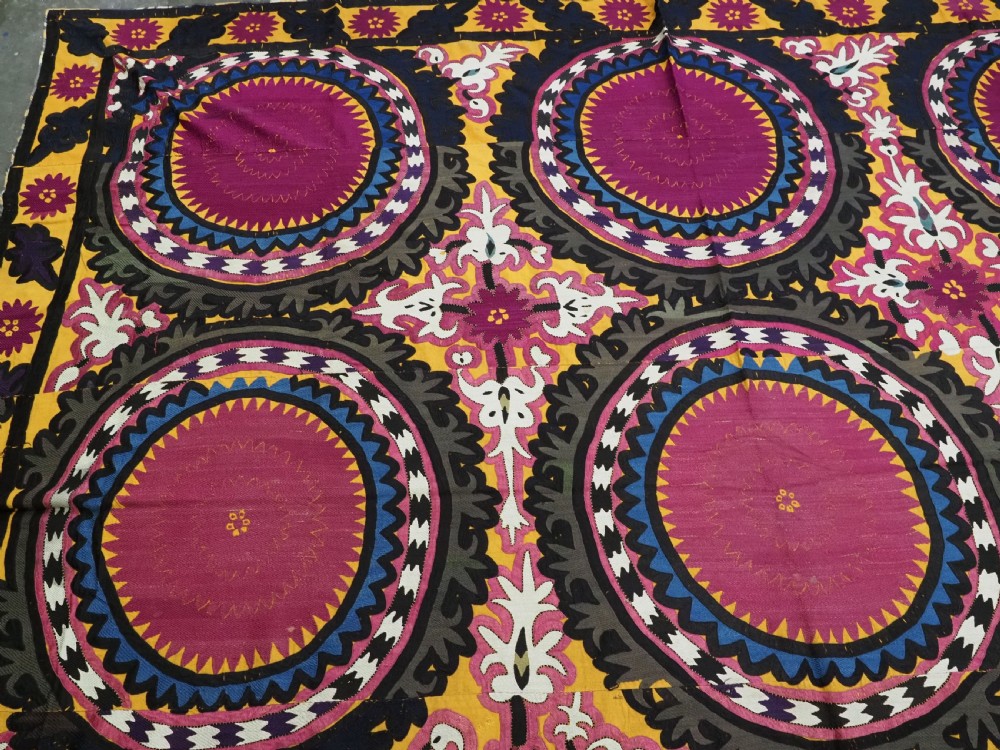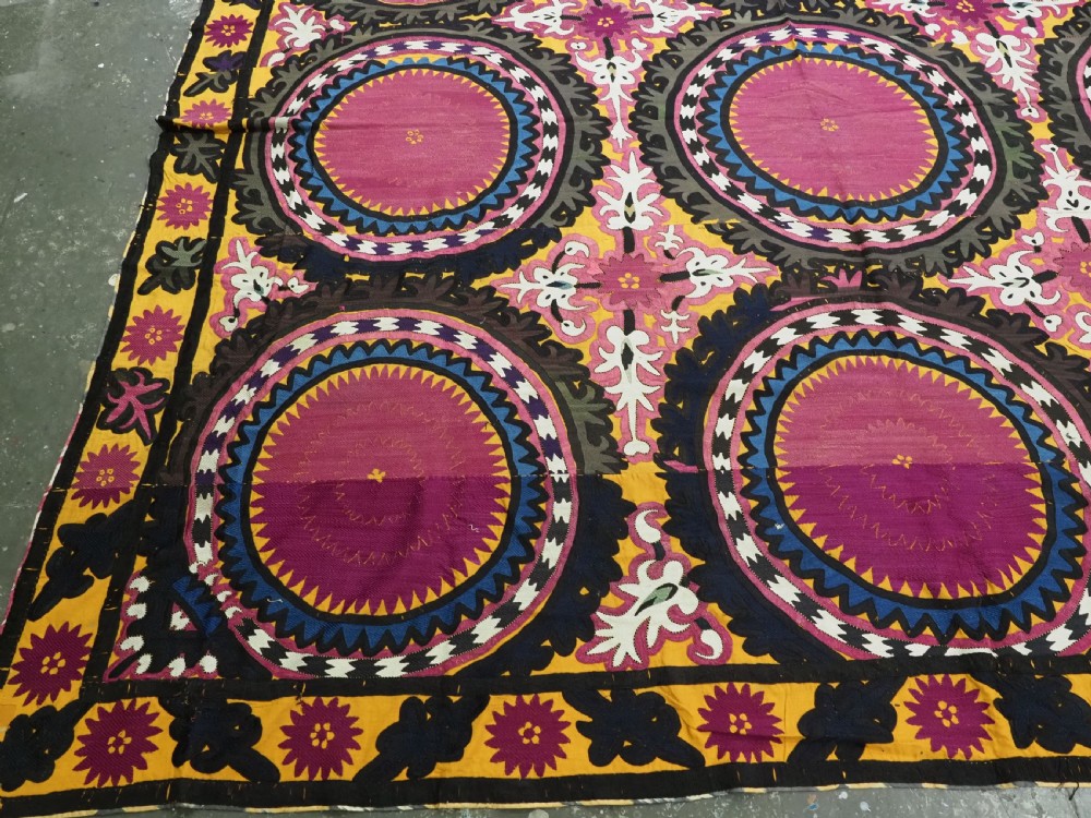 Suzani are silk embroideries that have been woven in Uzbekistan for many hundreds of years, they are treasured family items woven by the ladies of a family usually to celebrate a wedding. They are then used to decorate the inside of the Yurt. They are embroidered in silk on strips of cotton which are then joined together to make the complete item. The suzani is then backed with fine cotton to give it strength and body.