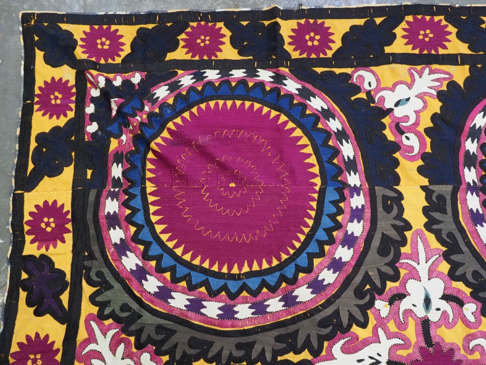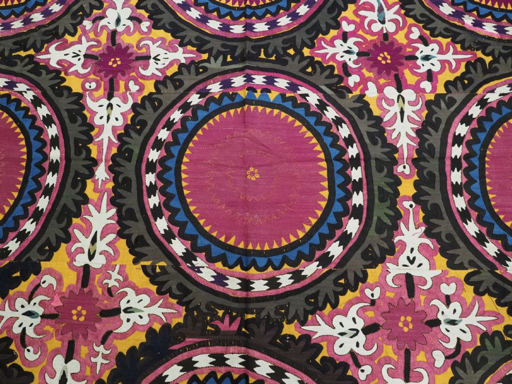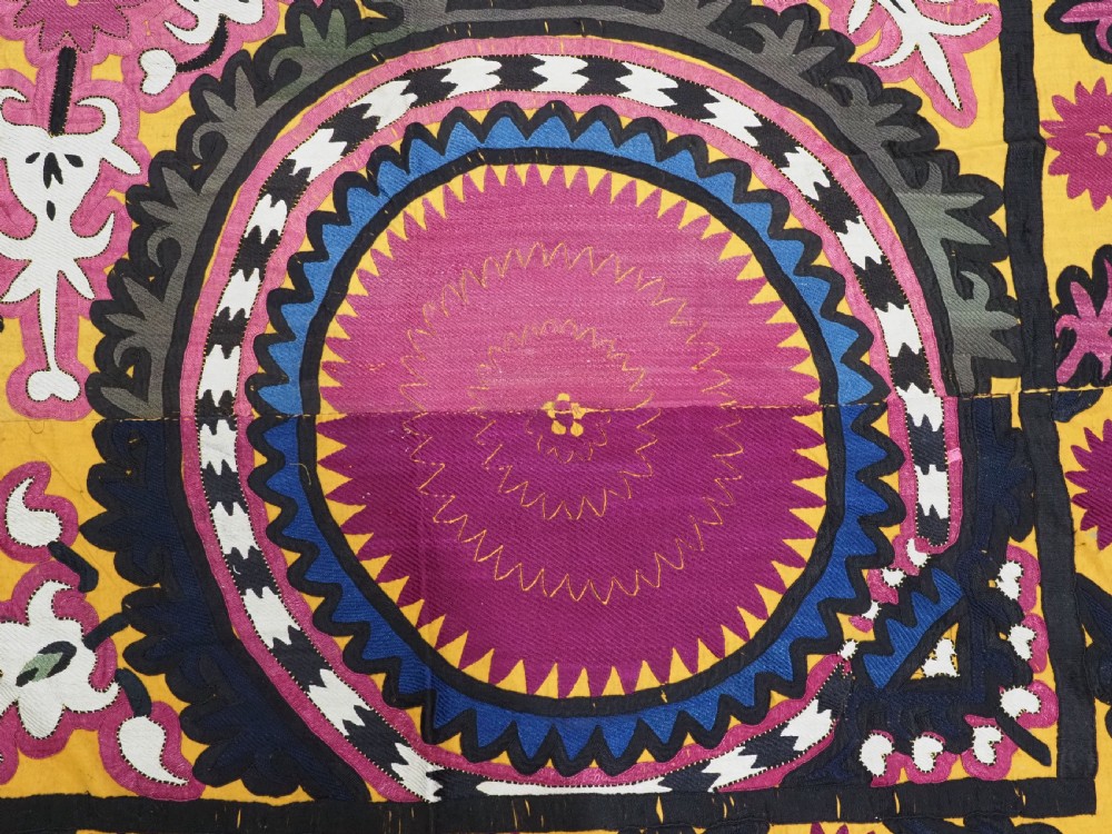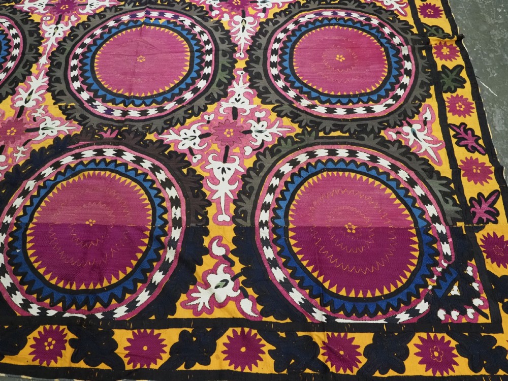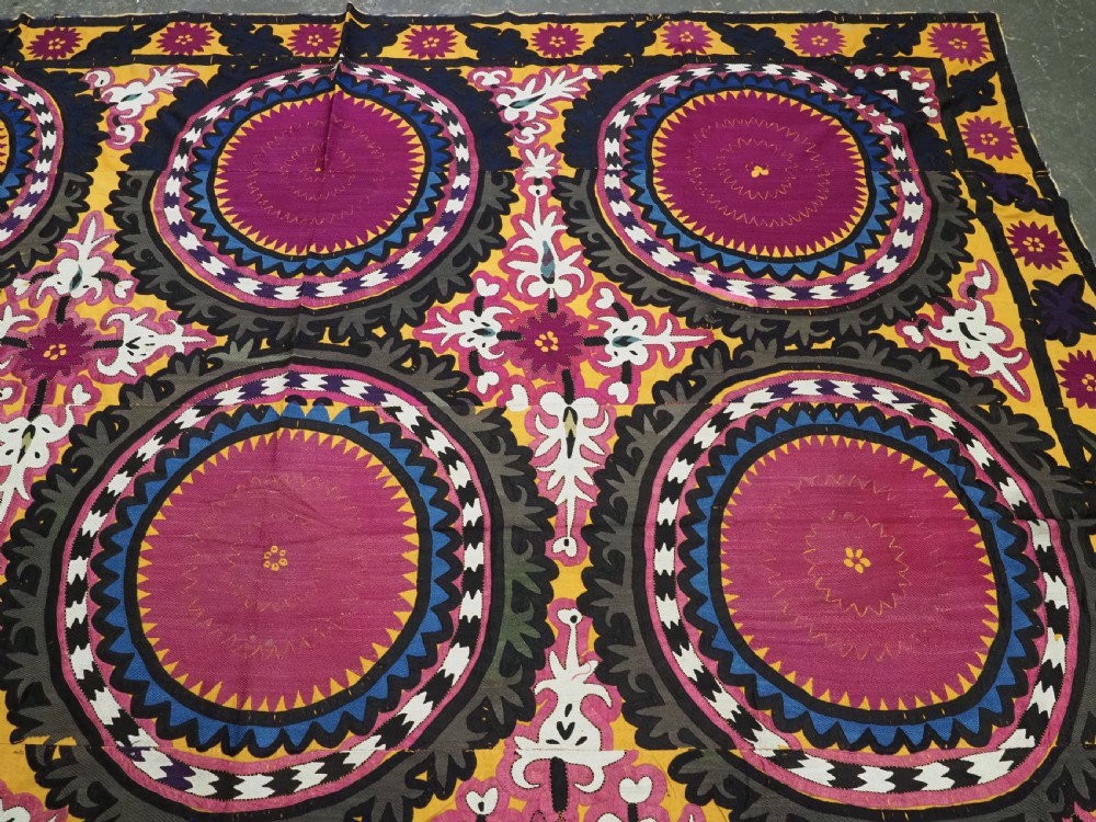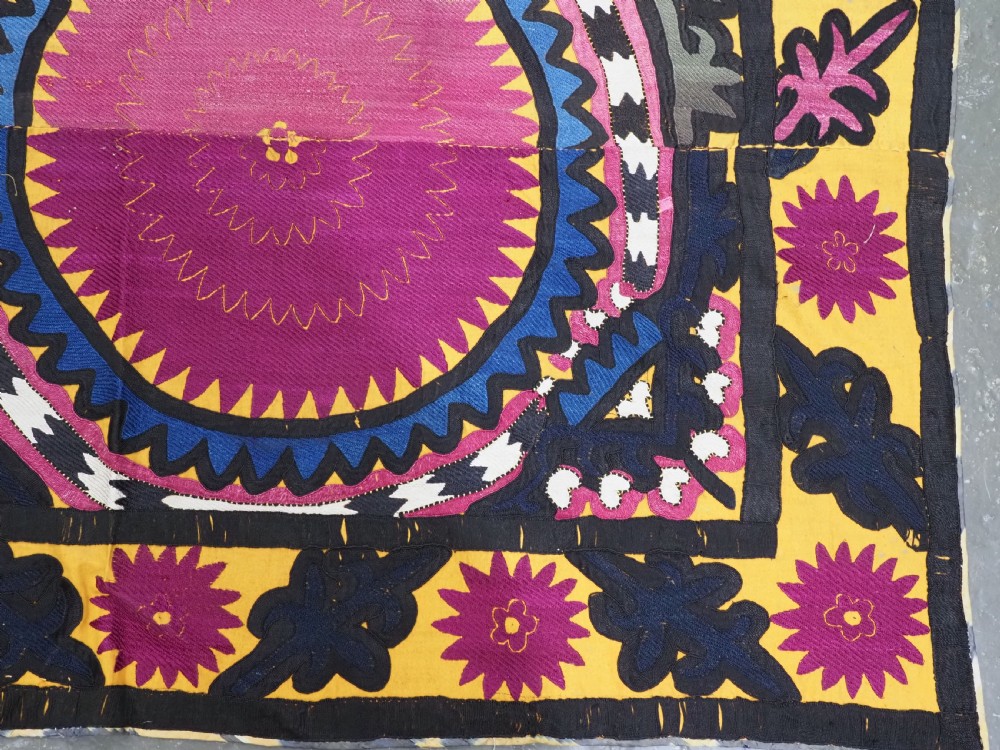 This is an excellent sample of an old Samarkand suzani known as 'bolim posh'. These were used as a canopy over the bride and groom during their wedding ceremony. The large sun disc motifs are said to be rooted in ancient beliefs. Note the use of glowing cochineal dye in the large discs. The silk colours really stand out against the yellow / gold cotton ground.