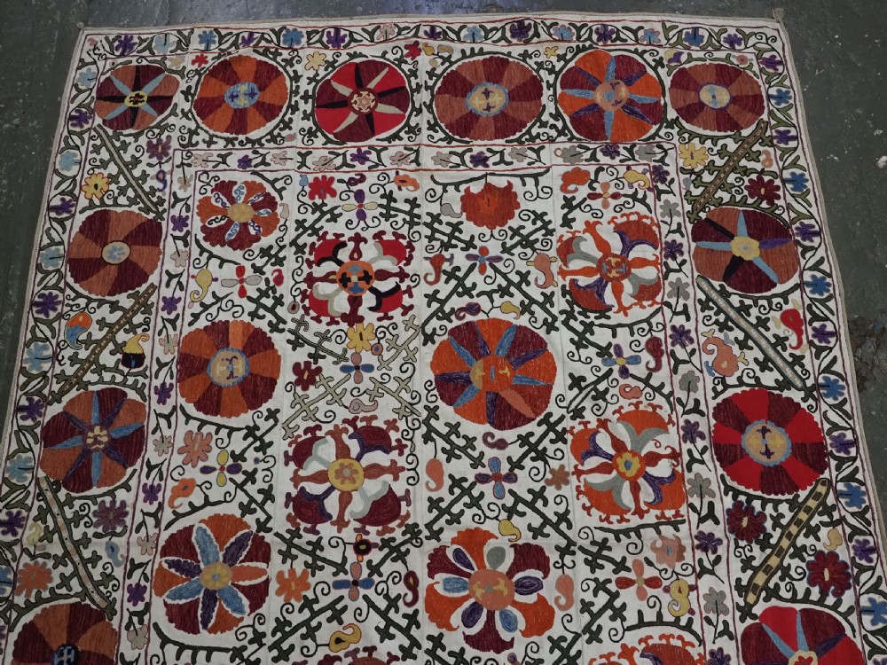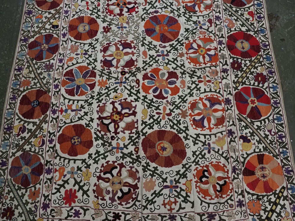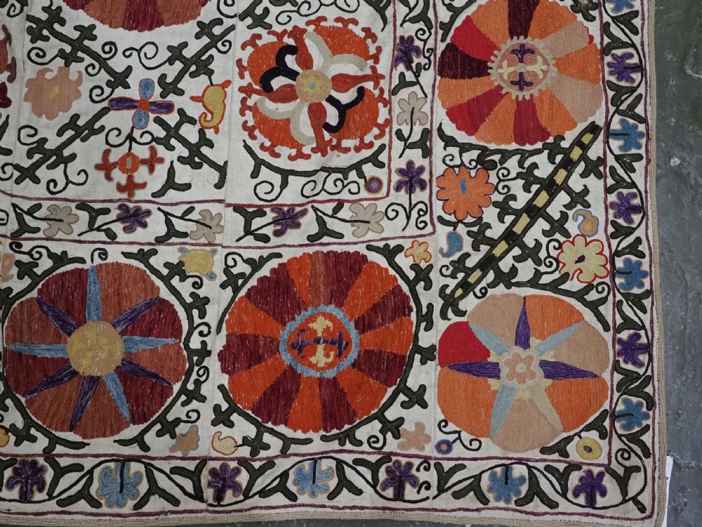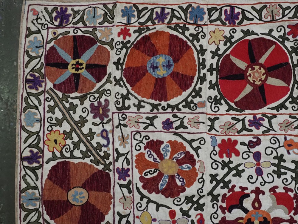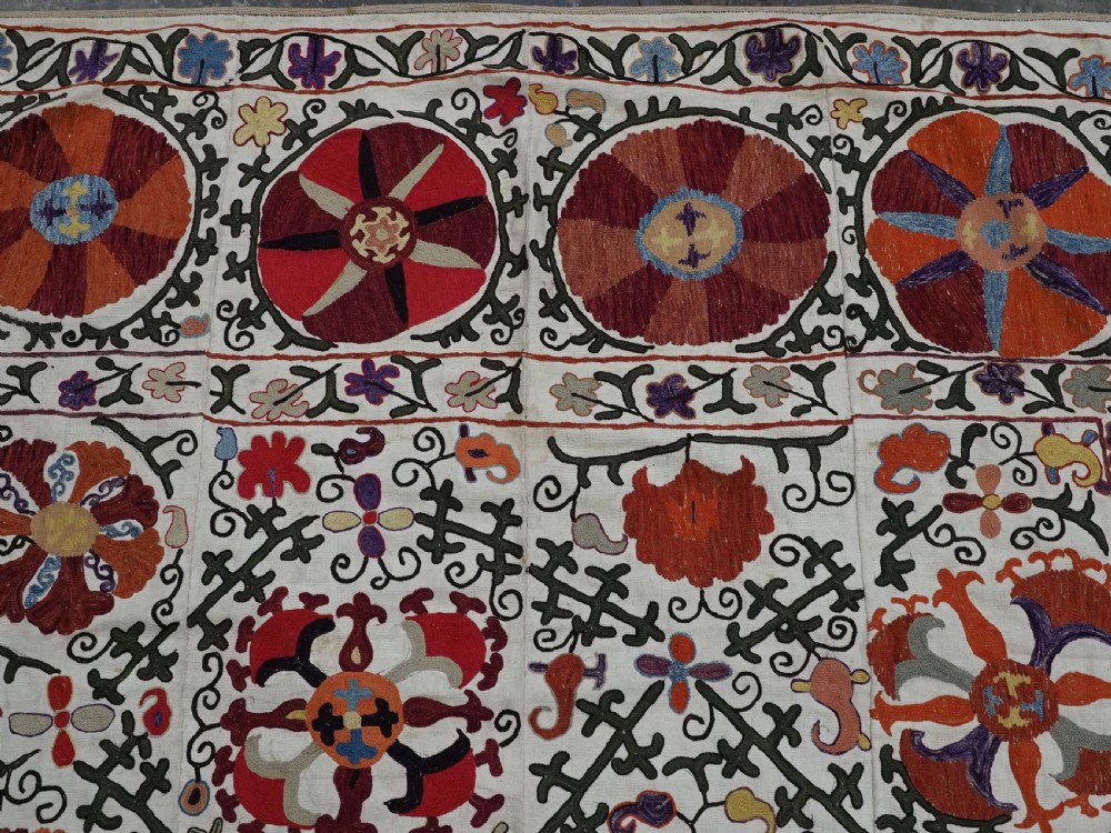 This example is probably from Samarkand and it features large multi coloured solar discs entwined in a green leafy vine. The suzani has been embroidered in six strips, silk twist work on a ivory hand woven linen / cotton ground.