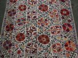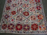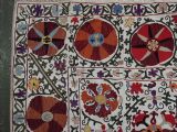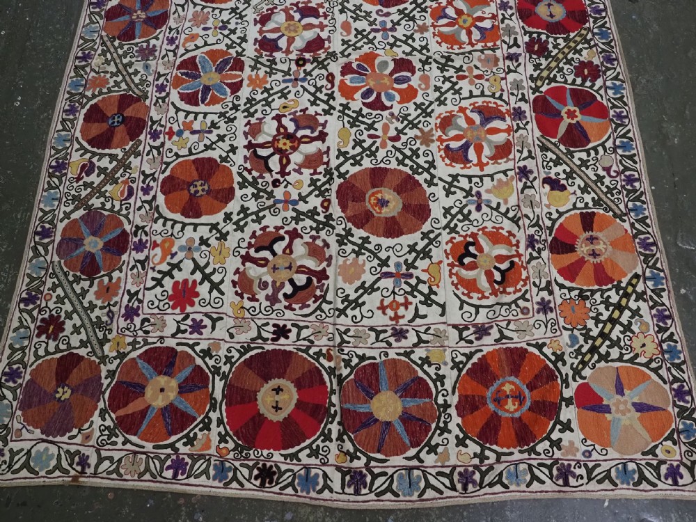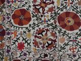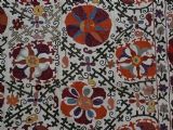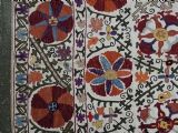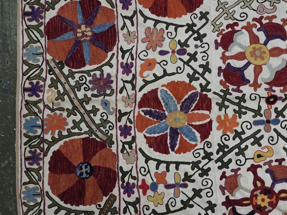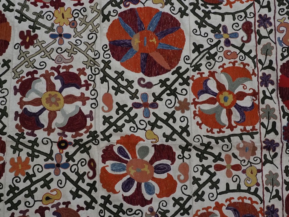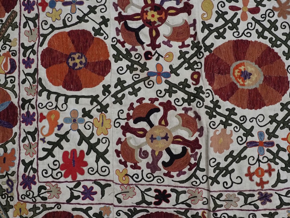 Suzani are silk embroideries that have been woven in Uzbekistan for many hundreds of years, they are treasured family items woven by the ladies of a family usually to celebrate a wedding. They are then used to decorate the inside of the Yurt. They are embroidered in silk on strips of cotton which are then joined together to make the complete item. The suzani is then backed with fine cotton to give it strength and body.
