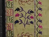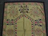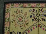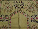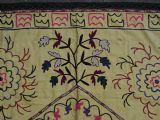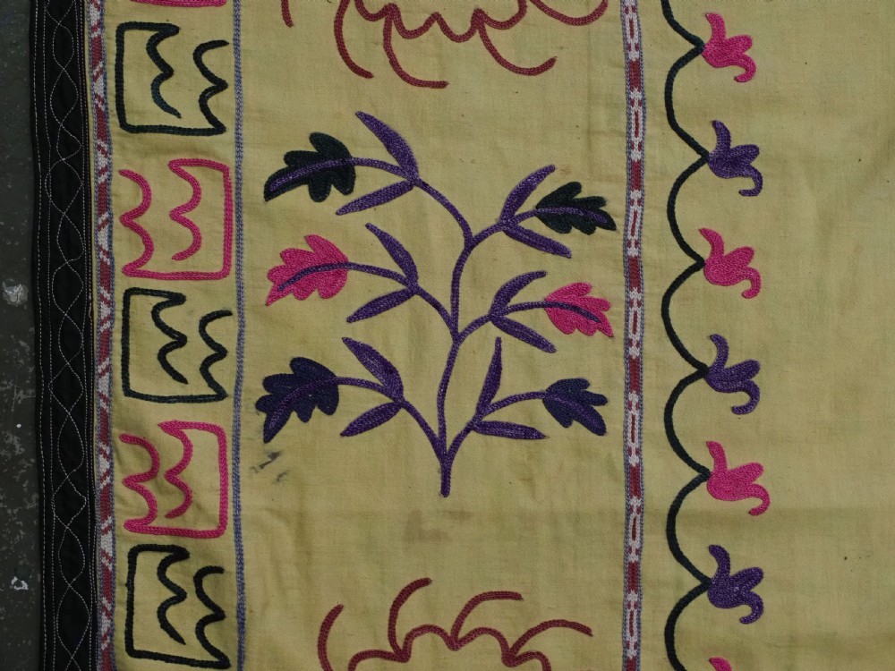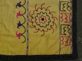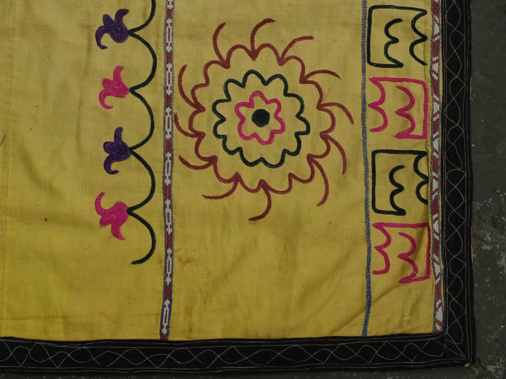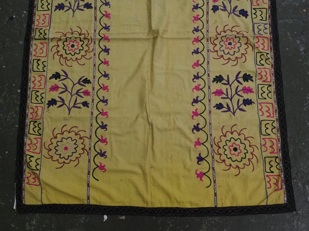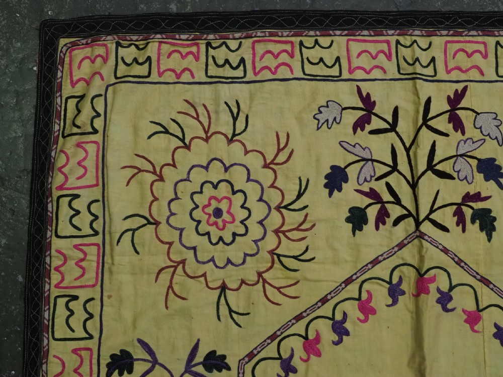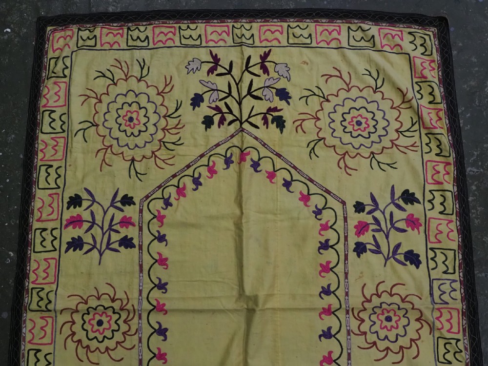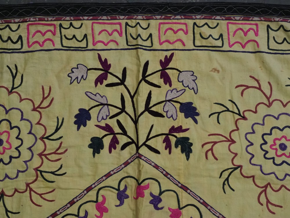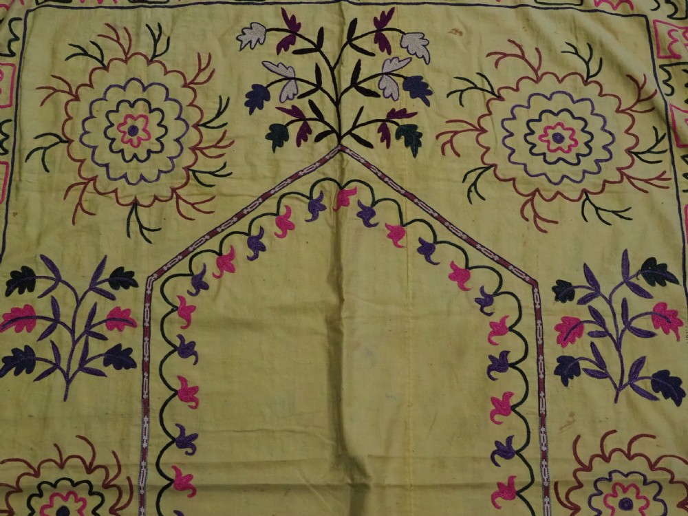 Size: 4ft 3in x 3ft 3in (130 x 100cm). Antique Uzbek suzani of prayer format on a yellow cotton ground. Circa 1920. Suzani are silk embroideries that have been woven in Uzbekistan for many hundreds of years, they are treasured family items woven by the ladies of a family usually to celebrate a wedding. They are then used to decorate the inside of the Yurt. They are often embroidered in silk on strips of cotton which are then joined together to make the complete item. The suzani is then backed with fine cotton to give it strength and body. This example is of prayer format known as 'jo-i-namoz' with six solar discs and floral sprays on a yellow cotton ground, possibly from Sharisabzh in southern Uzbekistan. The condition is good with only very slight wear and no repairs, the yellow cotton ground is slightly faded. The suzani is ready for display. Ref: T-0353. All of our prices include FREE WORLD WIDE EXPRESS DELIVERY by DHL. To purchase any item please click on the payment link. We are also happy to accept most payment methods including American Express, bank transfers, debit & credit cards. To purchase by card over the telephone, please contact us on 01608 652111 or 0044 1608 652111 from outside the UK. Internal Ref: T-0353
