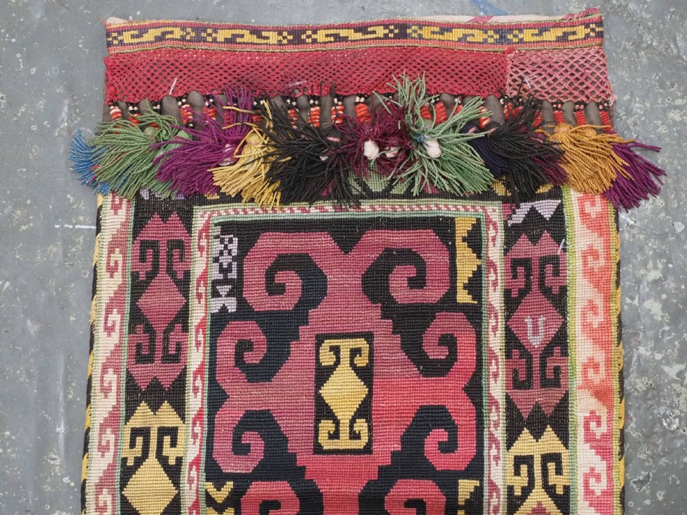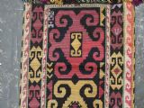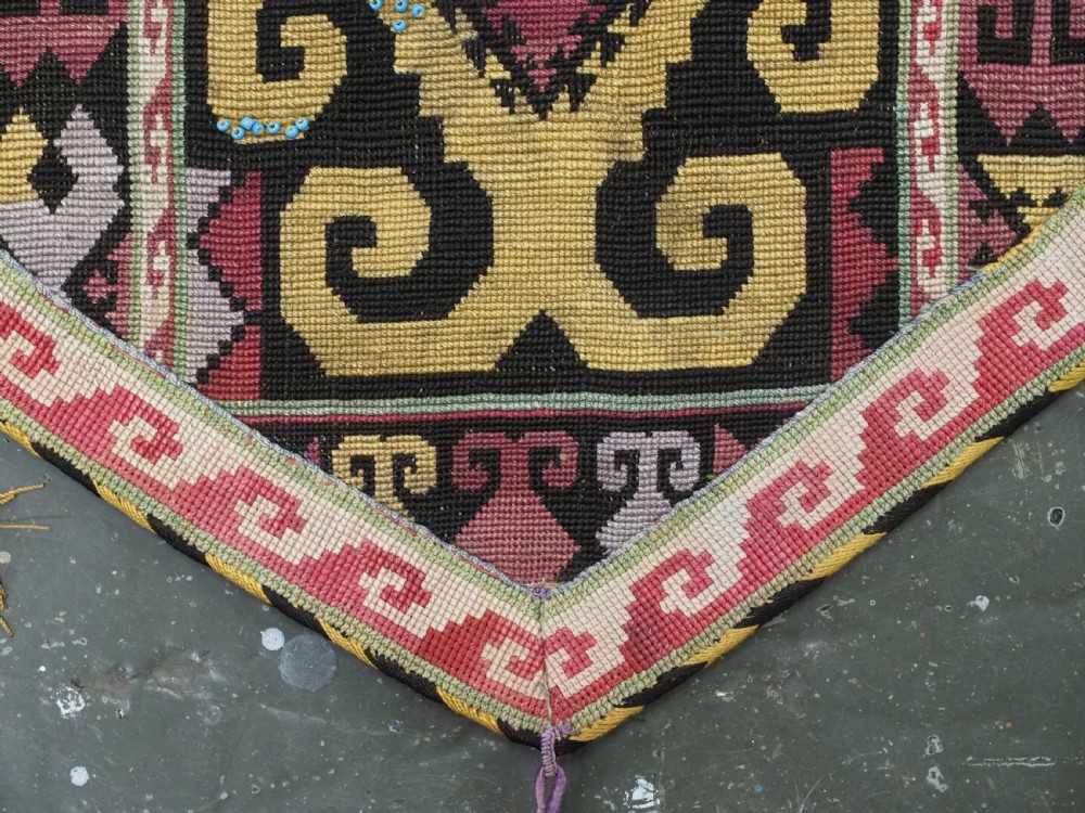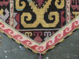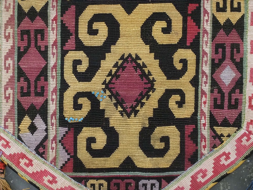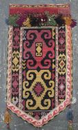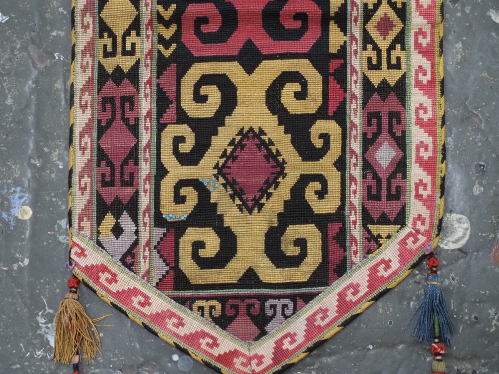 Size: 1ft 10in x 11in (55 x 29cm) excluding tassels. Antique Uzbek Lakai tribe uut kap ilgich, shield wall hangings for the yurt. Circa 1900. Uut kap ilgich are shield shaped hangings that usually formed part of a brides dowry; this example is silk twist embroidery on black wool cloth. The condition is excellent with very slight signs of use. Stock Number: T-0077. All of our prices include FREE WORLD WIDE EXPRESS DELIVERY by DHL. To purchase any item please click on the payment link. We are also happy to accept most payment methods including American Express, bank transfers, debit & credit cards. To purchase by card over the telephone, please contact us on 01608 652111 or 0044 1608 652111 from outside the UK. Internal Ref: T-0077