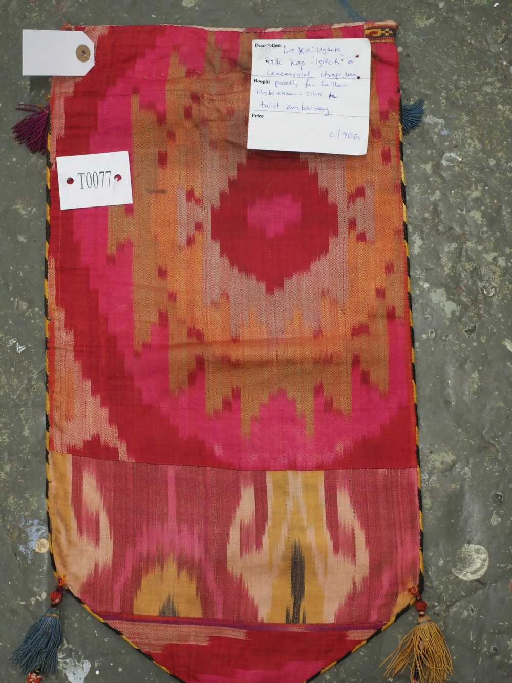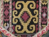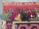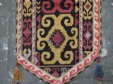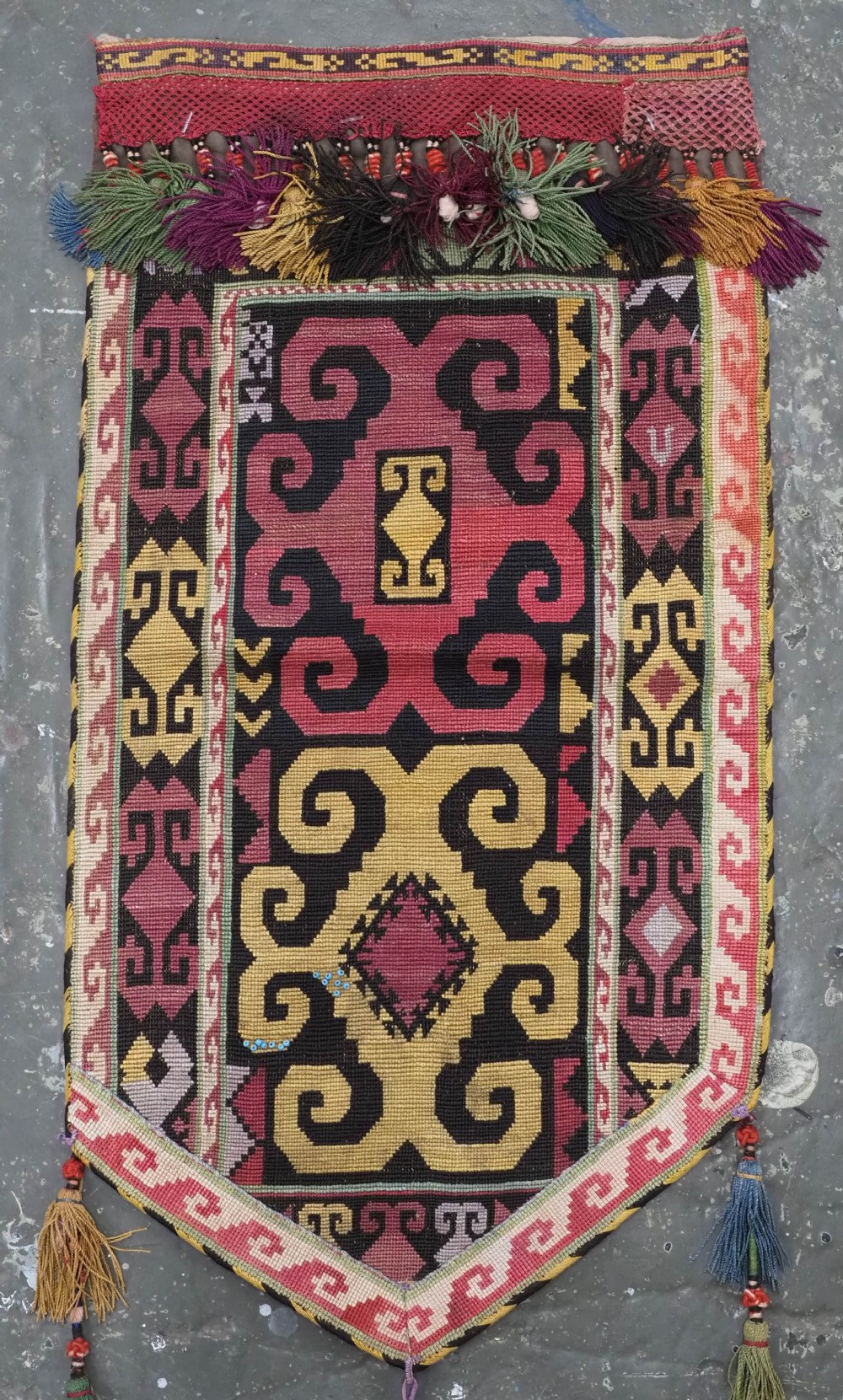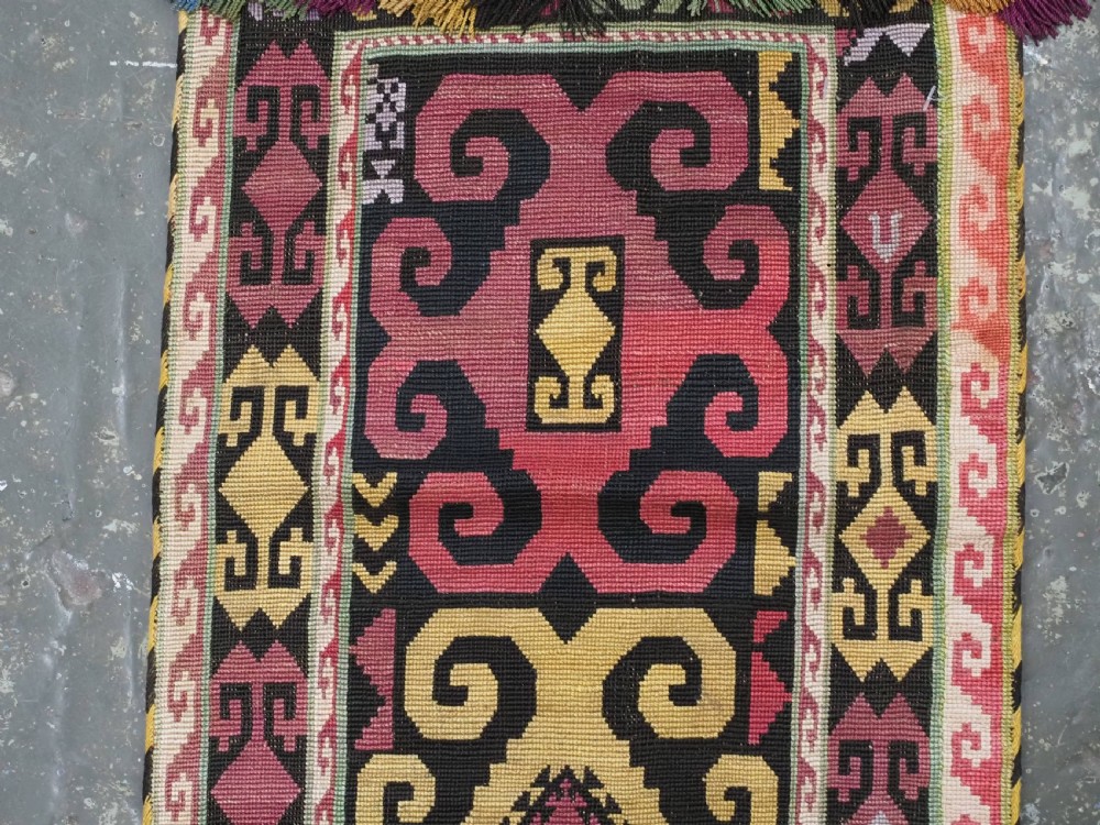 Size: 1ft 10in x 11in (55 x 29cm) excluding tassels. Antique Uzbek Lakai tribe uut kap ilgich, shield wall hangings for the yurt. Circa 1900. Uut kap ilgich are shield shaped hangings that usually formed part of a brides dowry; this example is silk twist embroidery on black wool cloth. The condition is excellent with very slight signs of use. Stock Number: T-0077. All of our prices include FREE WORLD WIDE EXPRESS DELIVERY by DHL. To purchase any item please click on the payment link. We are also happy to accept most payment methods including American Express, bank transfers, debit & credit cards. To purchase by card over the telephone, please contact us on 01608 652111 or 0044 1608 652111 from outside the UK. Internal Ref: T-0077