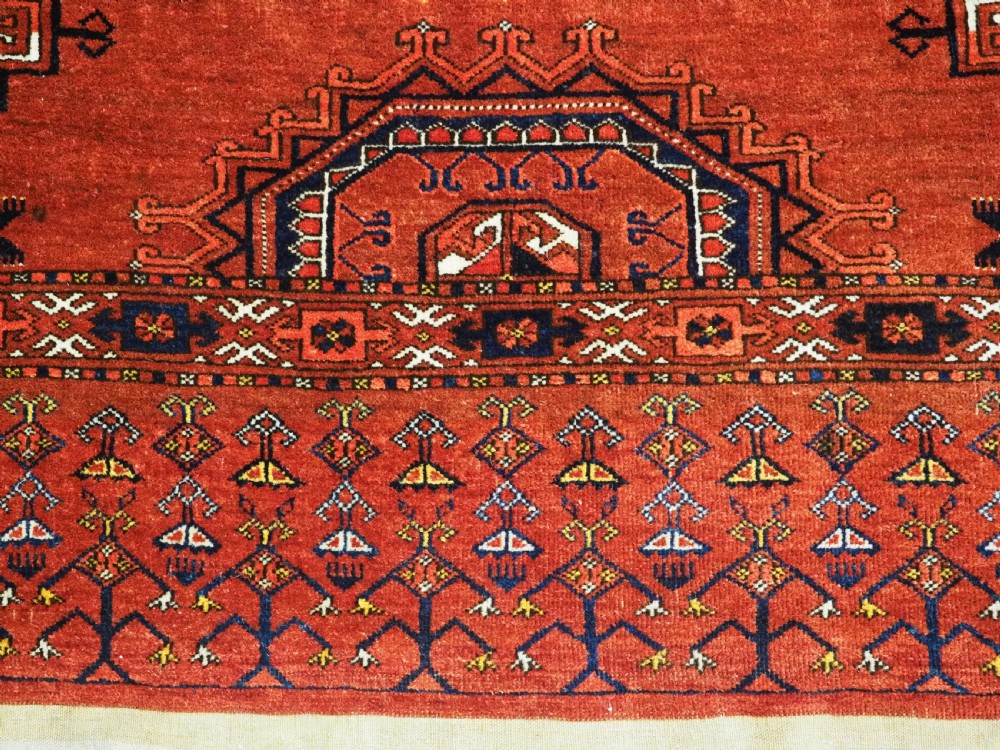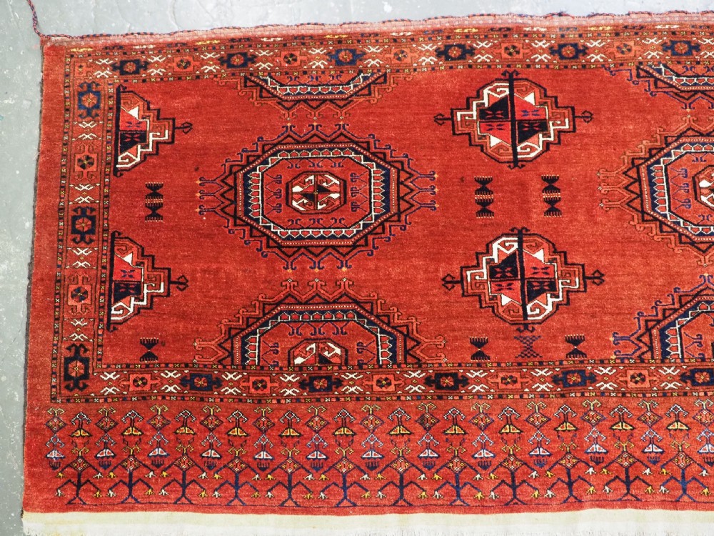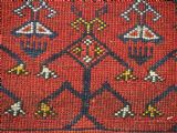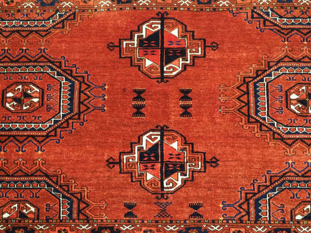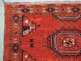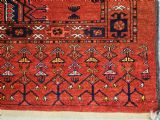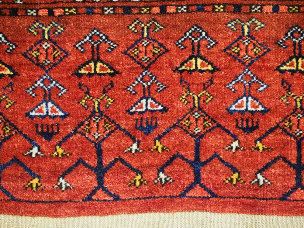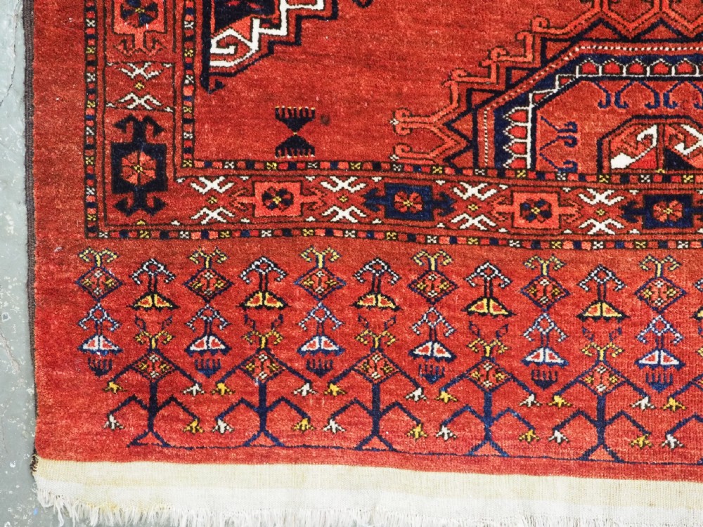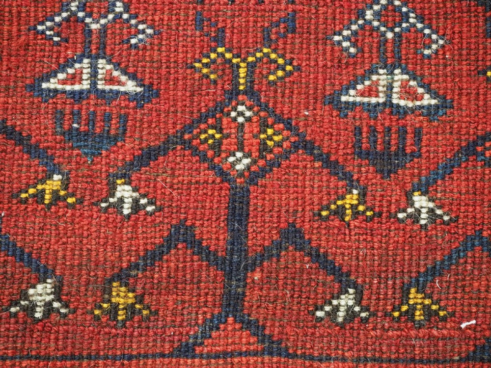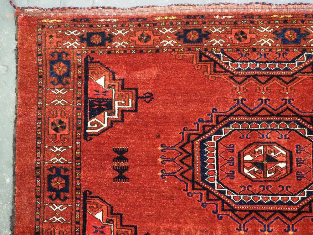 Size: 6ft 8in x 3ft 5in (202 x 105cm). Antique Ersari Turkmen chuval of very large size, with unusual turreted gul design. Late 19th century. This is a most unusual and scarce chuval face, the design features two large complete turreted guls and two complete chuval guls. There are four incomplete turreted guls at the edges of the chuval and four half chuval guls at the sides. The elem is of the small shrub design, or as it is often called 'dancing ladies', this design is found on chuval by both the Ersari and Saryk Turkmen. Note the pairs of small amulets in the field, a sign of purity. The chuval is finely woven with excellent wool, at some time in its history its original plain weave back has been removed, traces can be seen as a kilim at the lower end. Outstanding condition with very slight even wear and full pile. Hand washed and ready for display, this chuval face would make a superb floor rug. AOR-126. All of our prices include FREE WORLD WIDE EXPRESS DELIVERY by DHL. To purchase any item please click on the payment link. We are also happy to accept most payment methods including American Express, bank transfers, debit & credit cards. To purchase by card over the telephone, please contact us on 01608 652111 or 0044 1608 652111 from outside the UK. Internal Ref: AOR-126