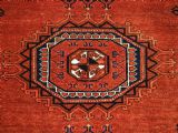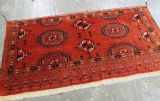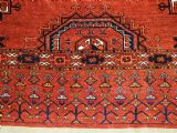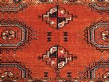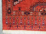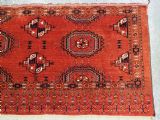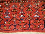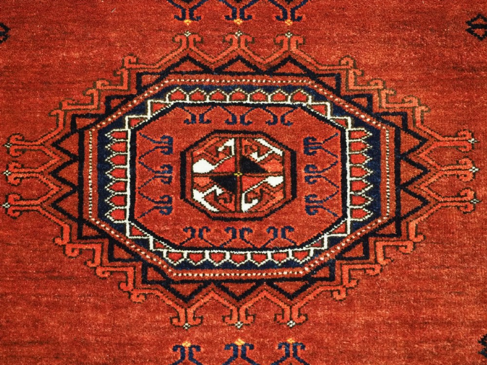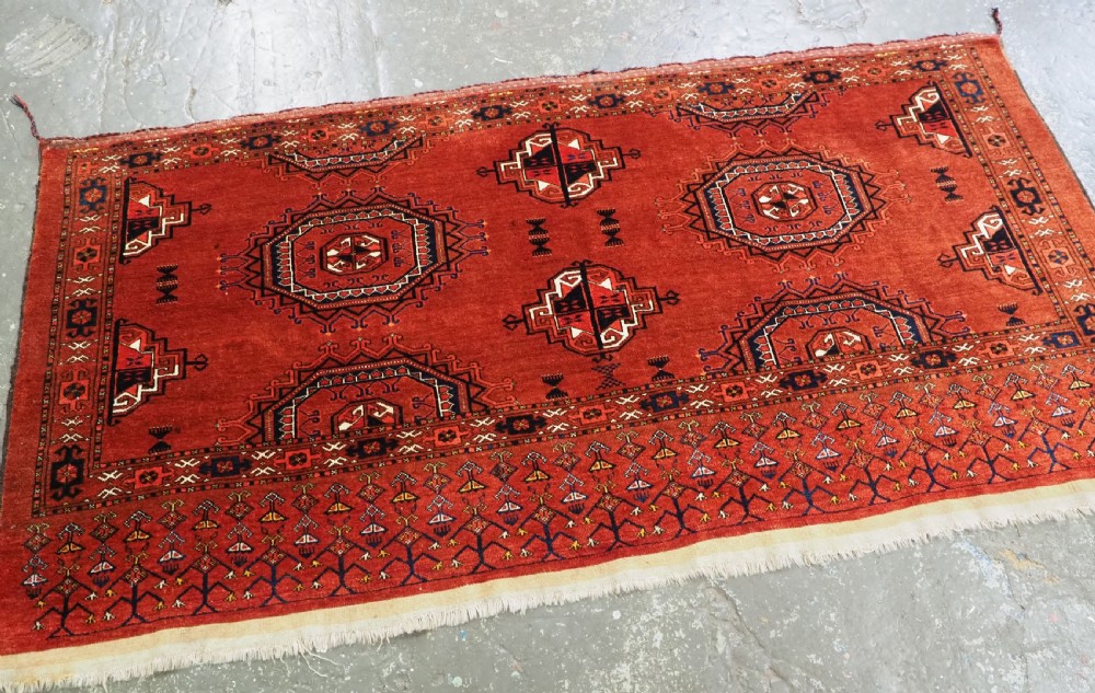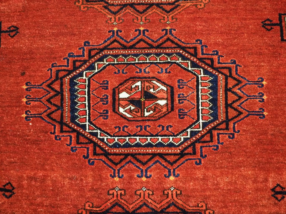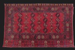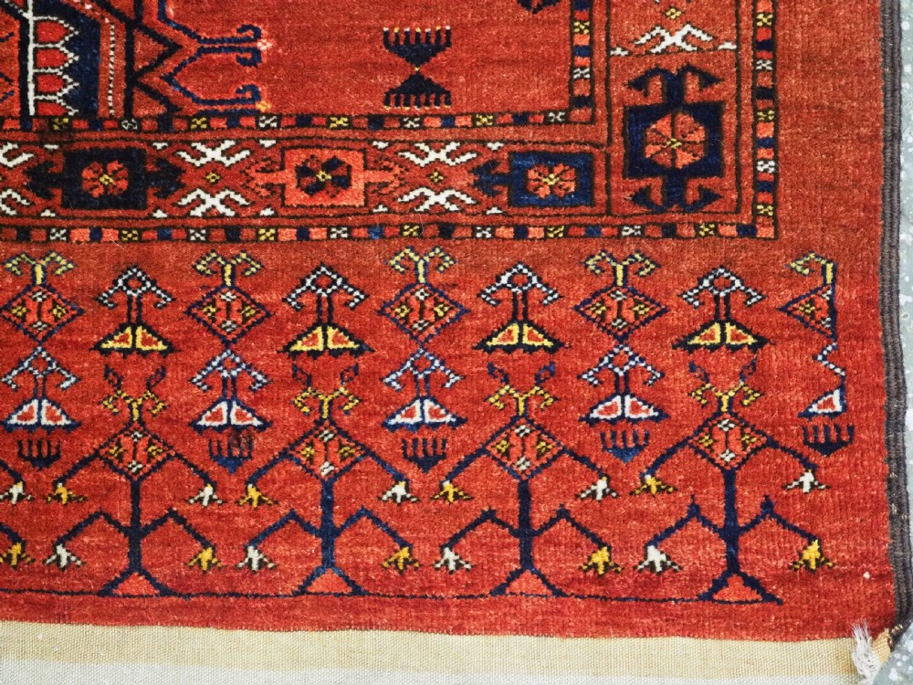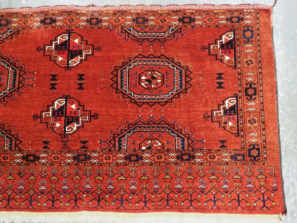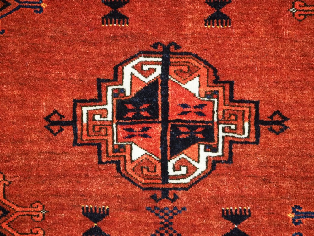 Size: 6ft 8in x 3ft 5in (202 x 105cm). Antique Ersari Turkmen chuval of very large size, with unusual turreted gul design. Late 19th century. This is a most unusual and scarce chuval face, the design features two large complete turreted guls and two complete chuval guls. There are four incomplete turreted guls at the edges of the chuval and four half chuval guls at the sides. The elem is of the small shrub design, or as it is often called 'dancing ladies', this design is found on chuval by both the Ersari and Saryk Turkmen. Note the pairs of small amulets in the field, a sign of purity. The chuval is finely woven with excellent wool, at some time in its history its original plain weave back has been removed, traces can be seen as a kilim at the lower end. Outstanding condition with very slight even wear and full pile. Hand washed and ready for display, this chuval face would make a superb floor rug. AOR-126. All of our prices include FREE WORLD WIDE EXPRESS DELIVERY by DHL. To purchase any item please click on the payment link. We are also happy to accept most payment methods including American Express, bank transfers, debit & credit cards. To purchase by card over the telephone, please contact us on 01608 652111 or 0044 1608 652111 from outside the UK. Internal Ref: AOR-126