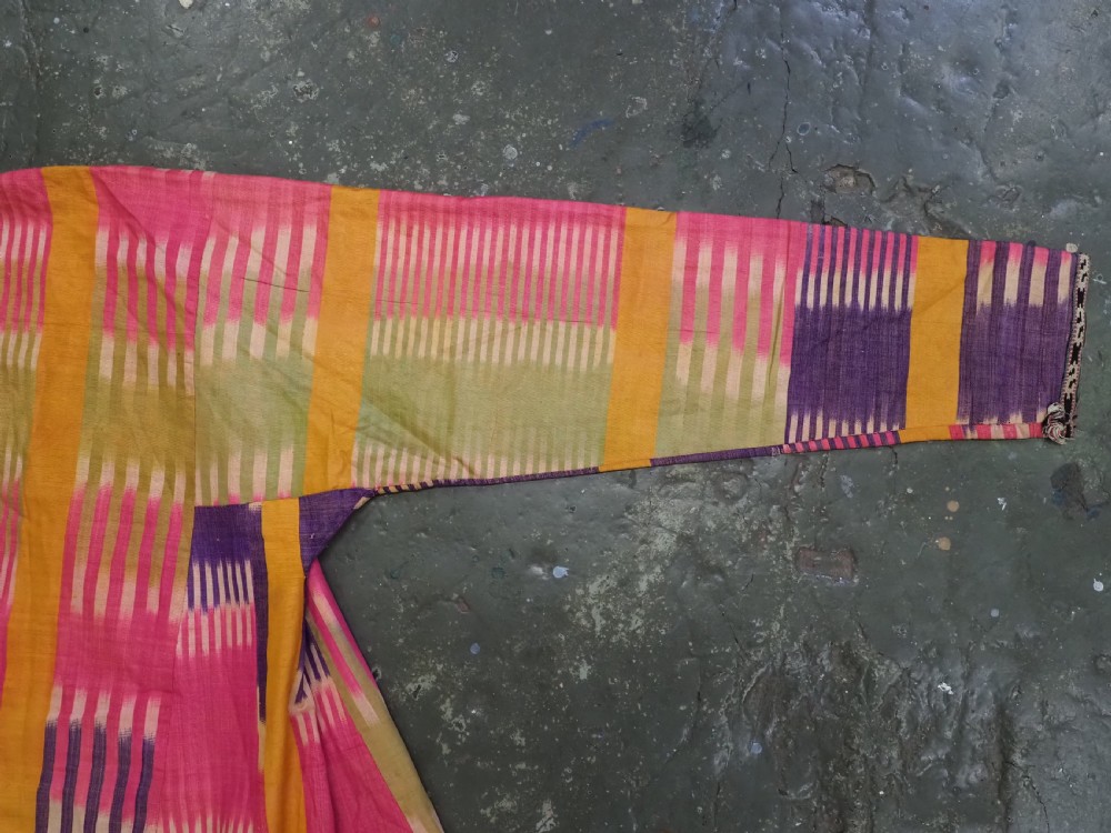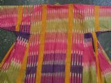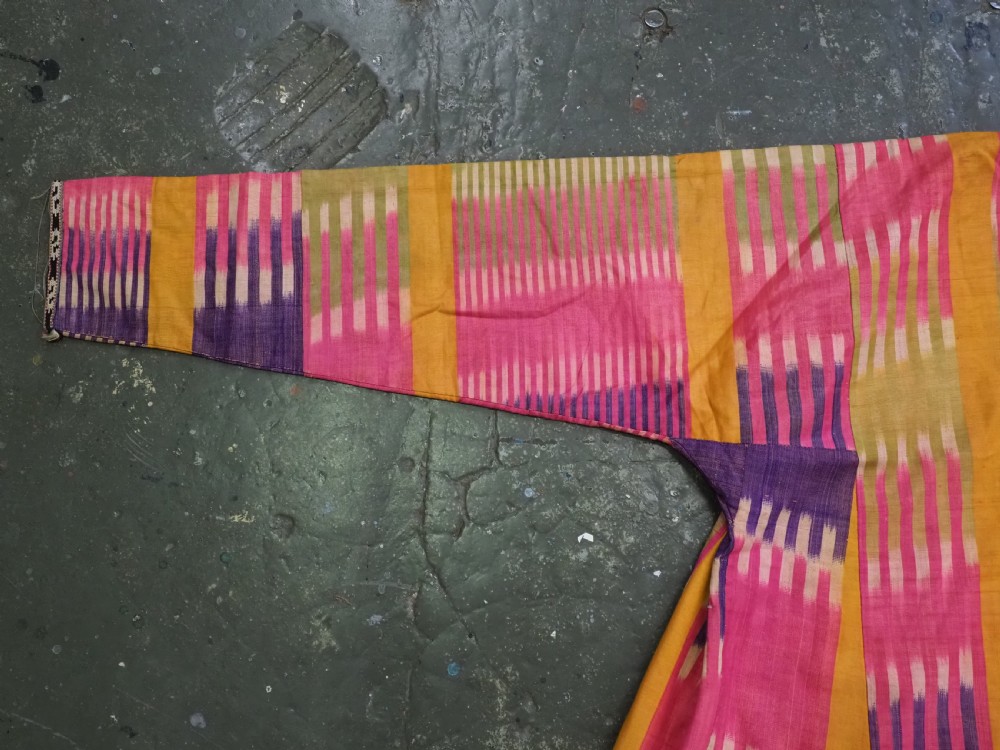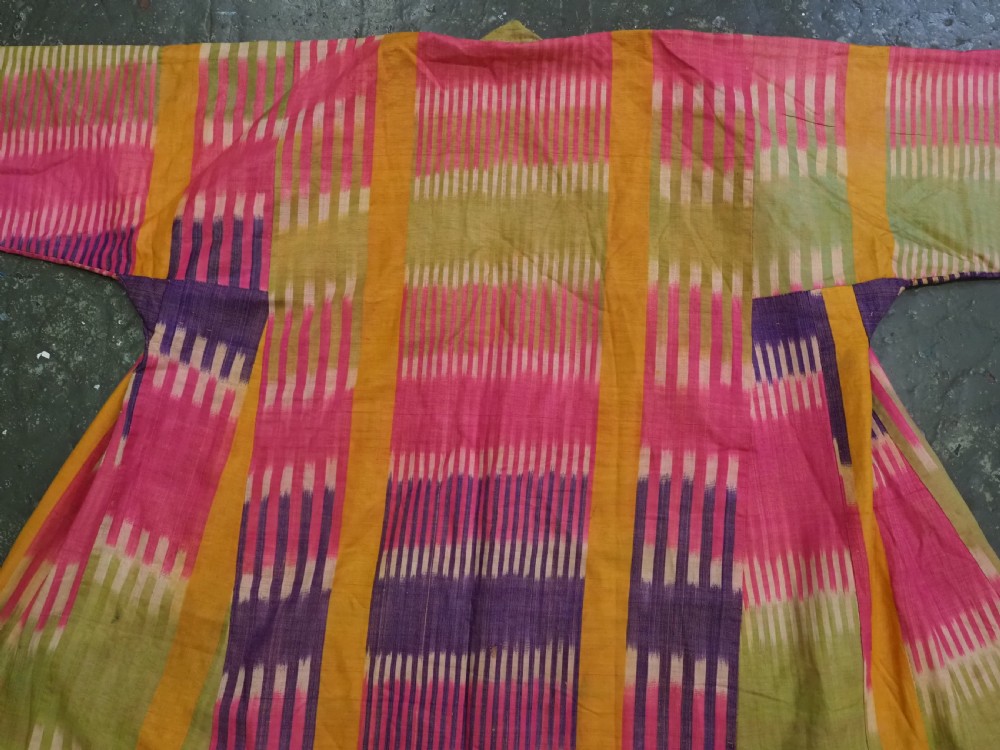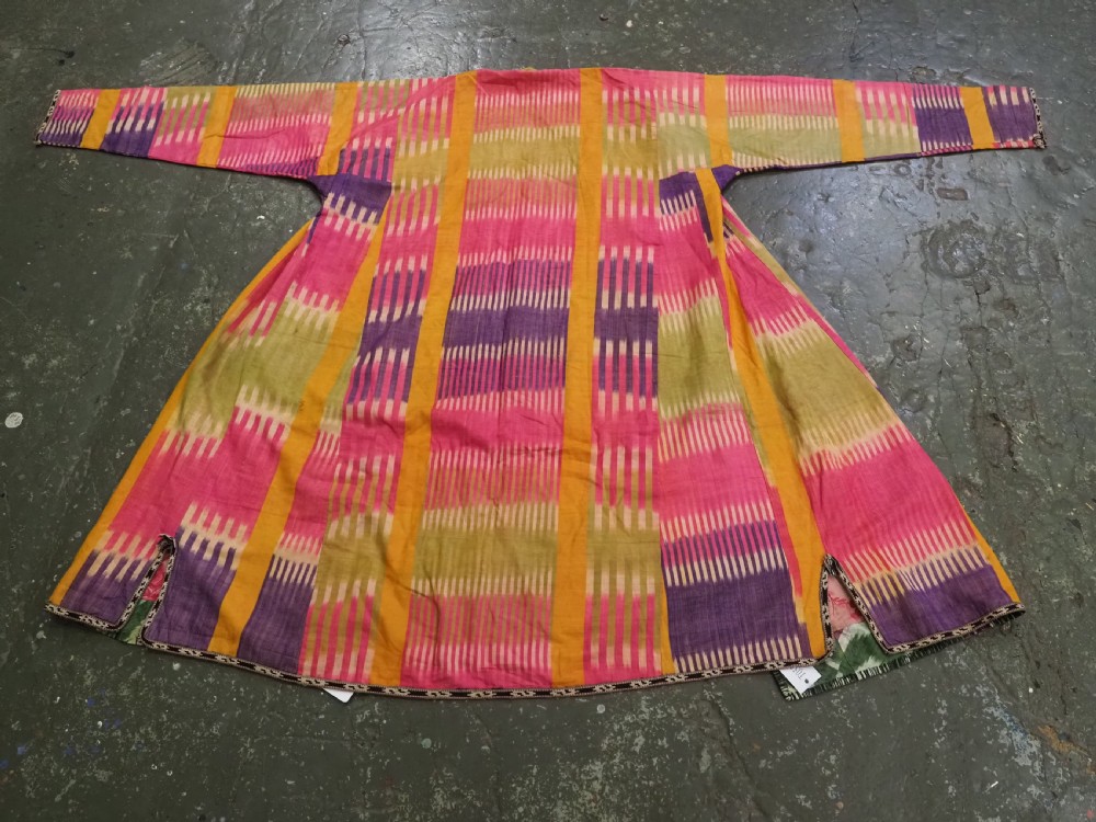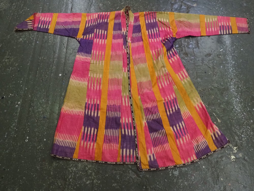Antique Uzbek 'becasab' silk ikat coat, known as 'khalat'.
