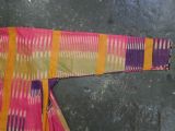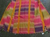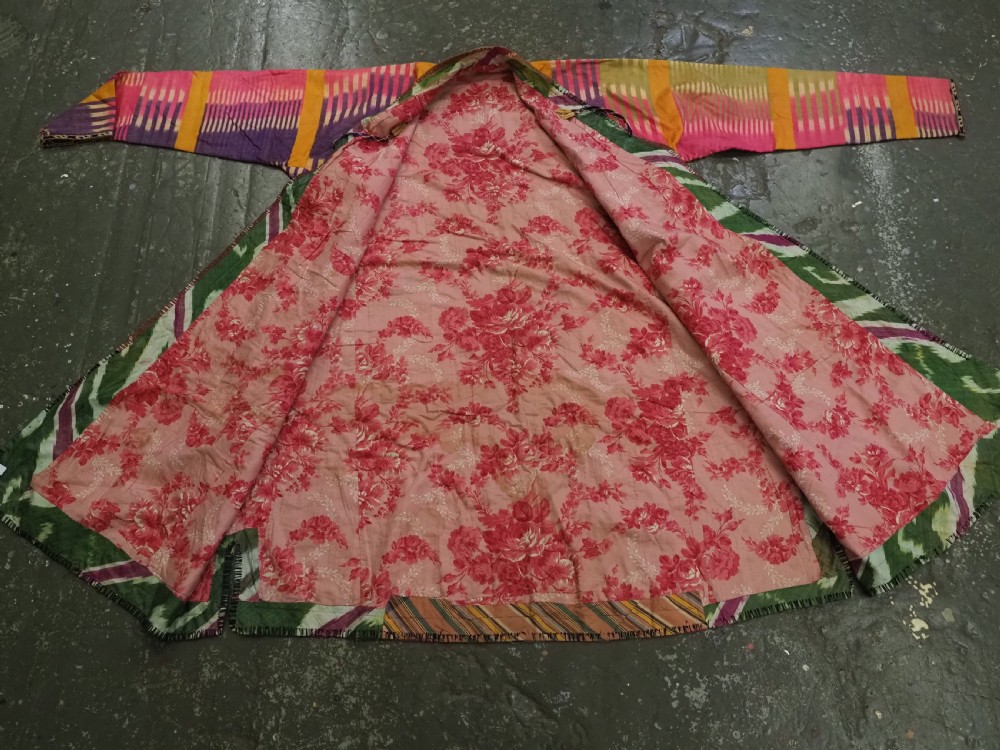 This gentleman's coat in silk ikat design originates from the Samarkand region, this is a 'luxury' quality of coat worn by the wealthy Uzbek gentlemen. Becasab silk is polished with bees wax, it has silk warps and cotton wefts. The coat has the original Russian printed cotton lining.