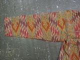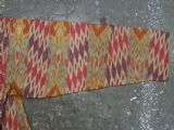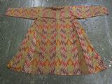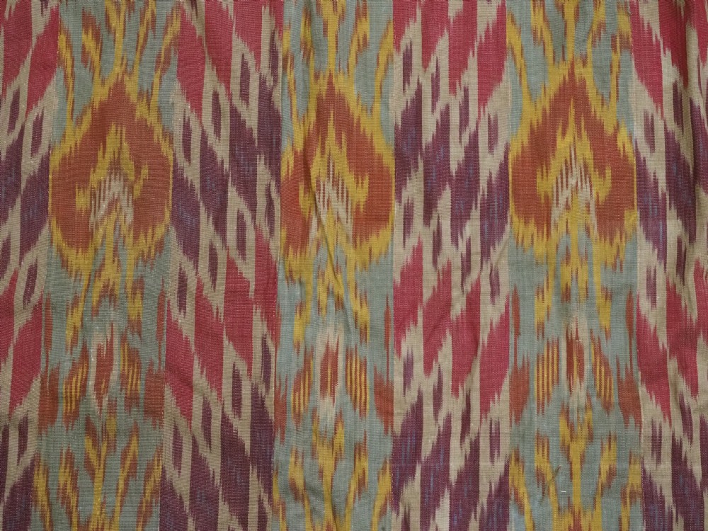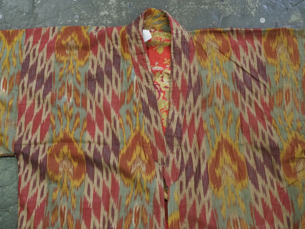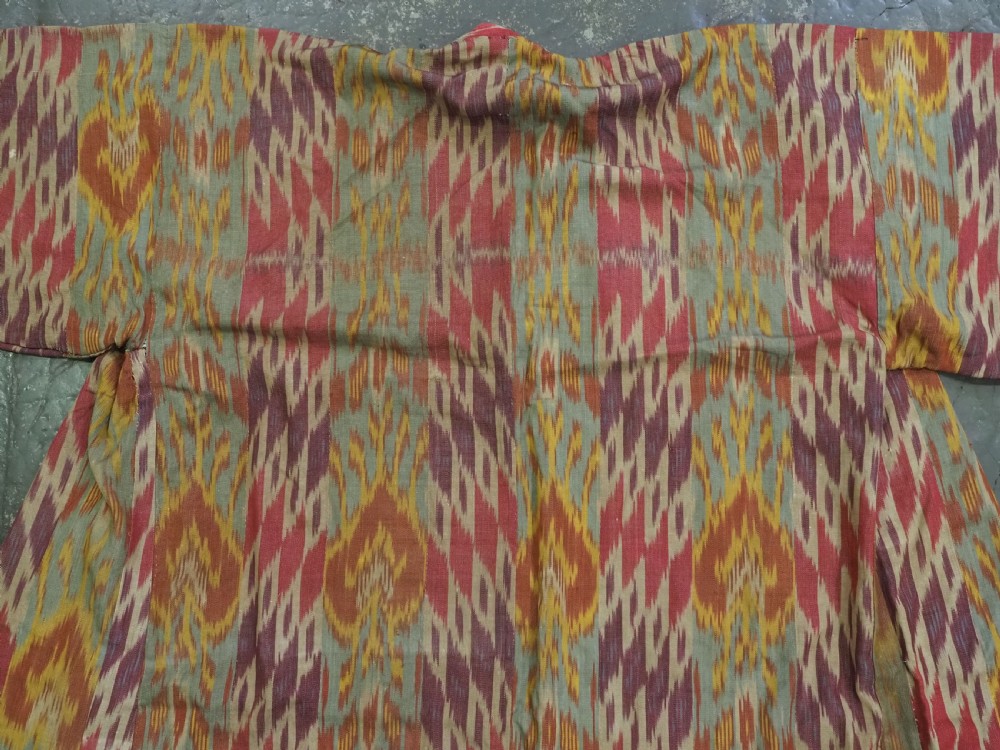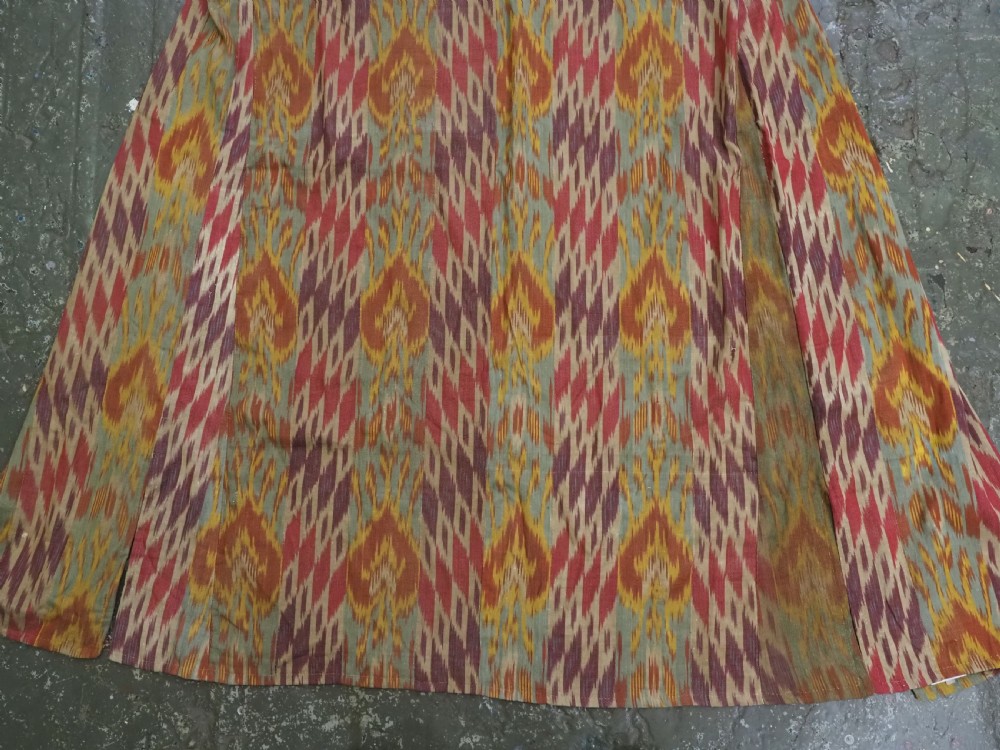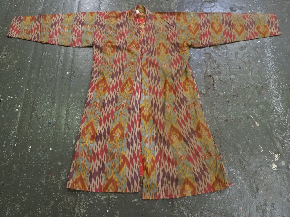 Size: 4ft 5in x 2ft 11in (135 x 90cm). Antique Uzbek silk ikat coat, known as 'khalat'. Circa 1880. This gentleman's coat in silk ikat design originates from the Bukhara region, this is a 'luxury' quality of coat worn by the wealthy Uzbek gentlemen. The coat has the original Russian printed cotton lining. The condition is excellent with some signs of use and a few historic small stains. Stock Number: T-0581. All of our prices include FREE WORLD WIDE EXPRESS DELIVERY by DHL. To purchase any item please click on the payment link. We are also happy to accept most payment methods including American Express, bank transfers, debit & credit cards. To purchase by card over the telephone, please contact us on 01608 652111 or 0044 1608 652111 from outside the UK. Internal Ref: T-0581