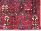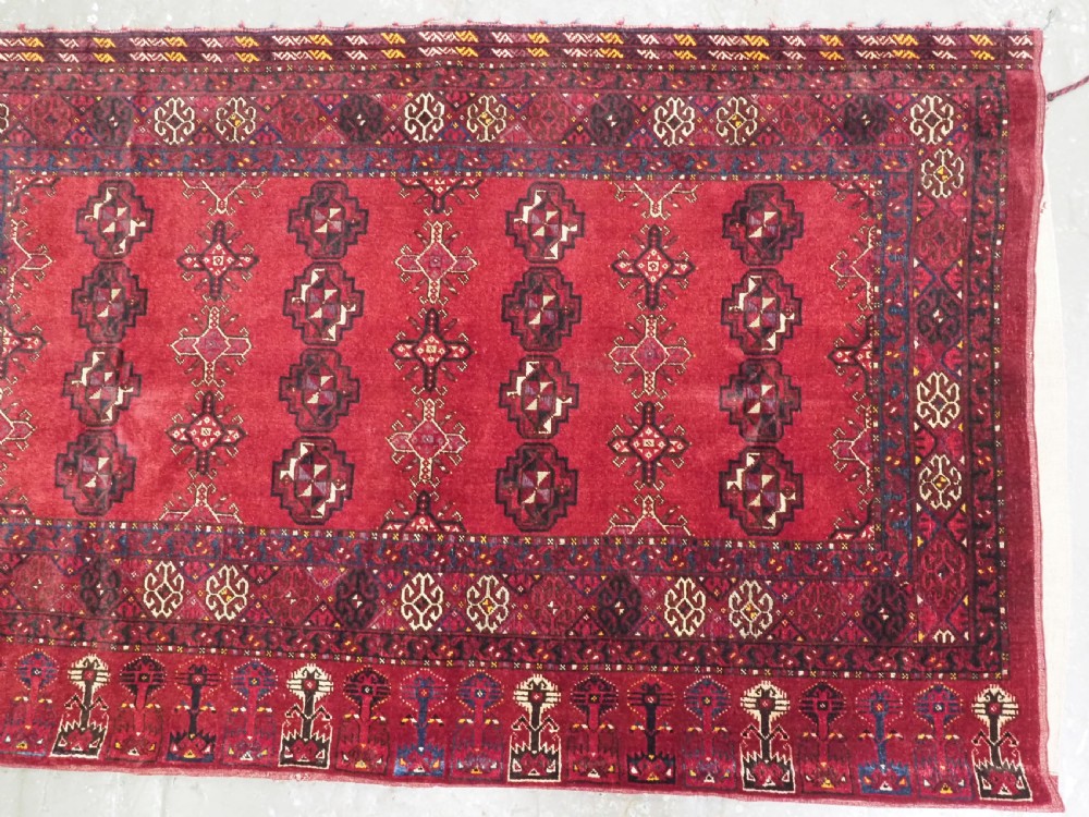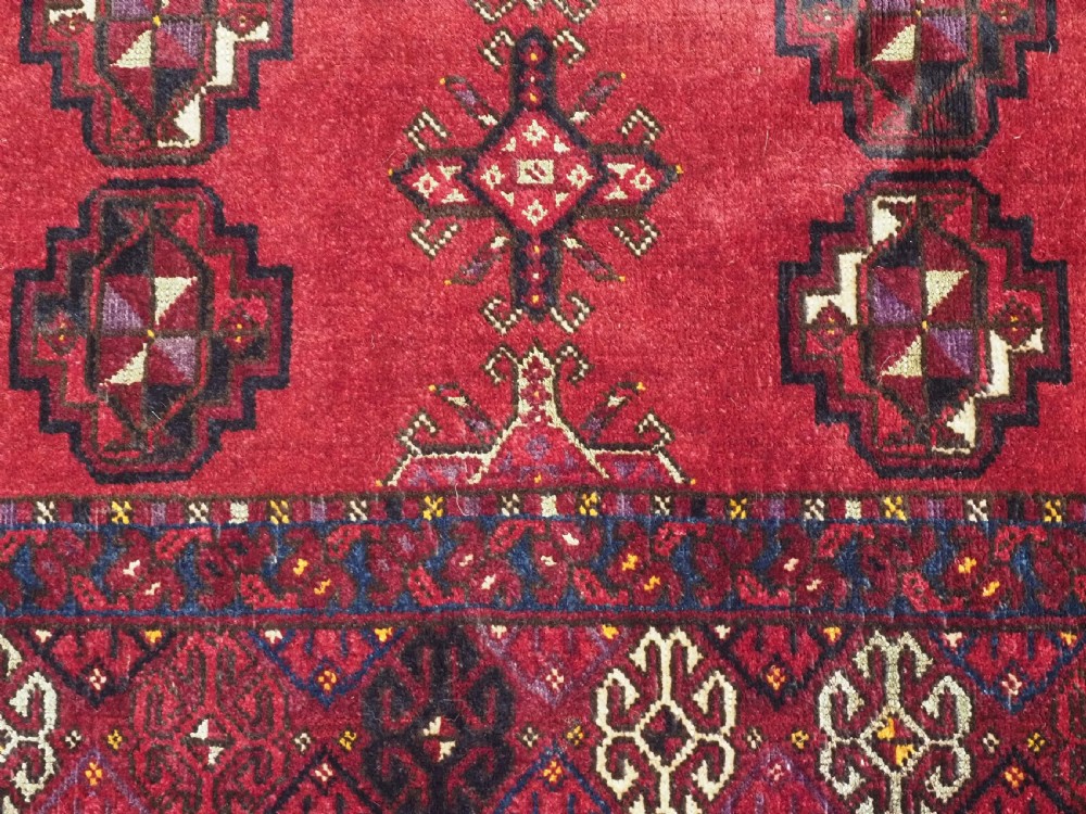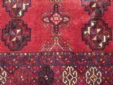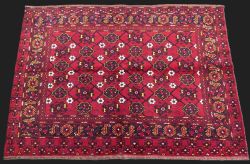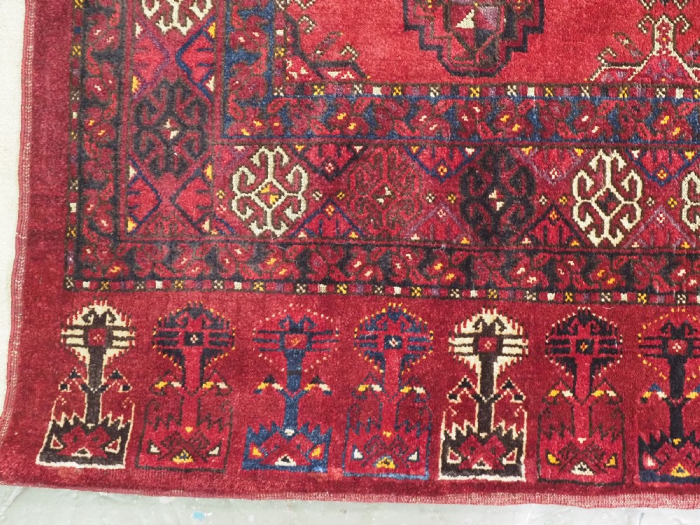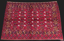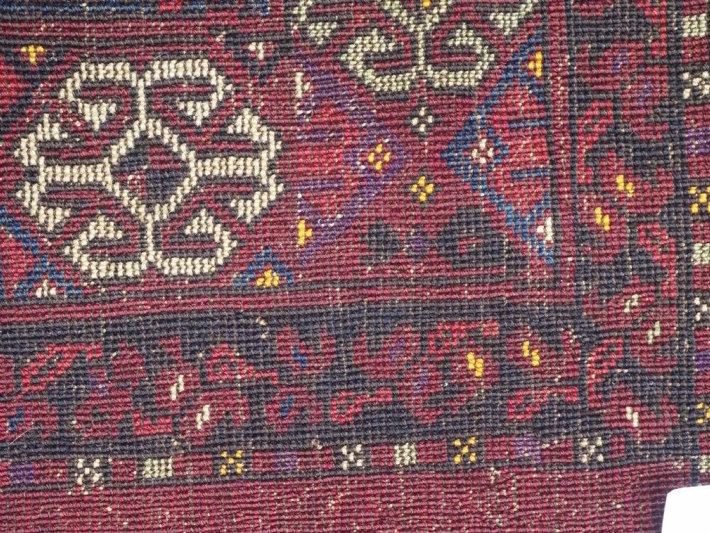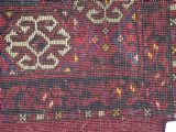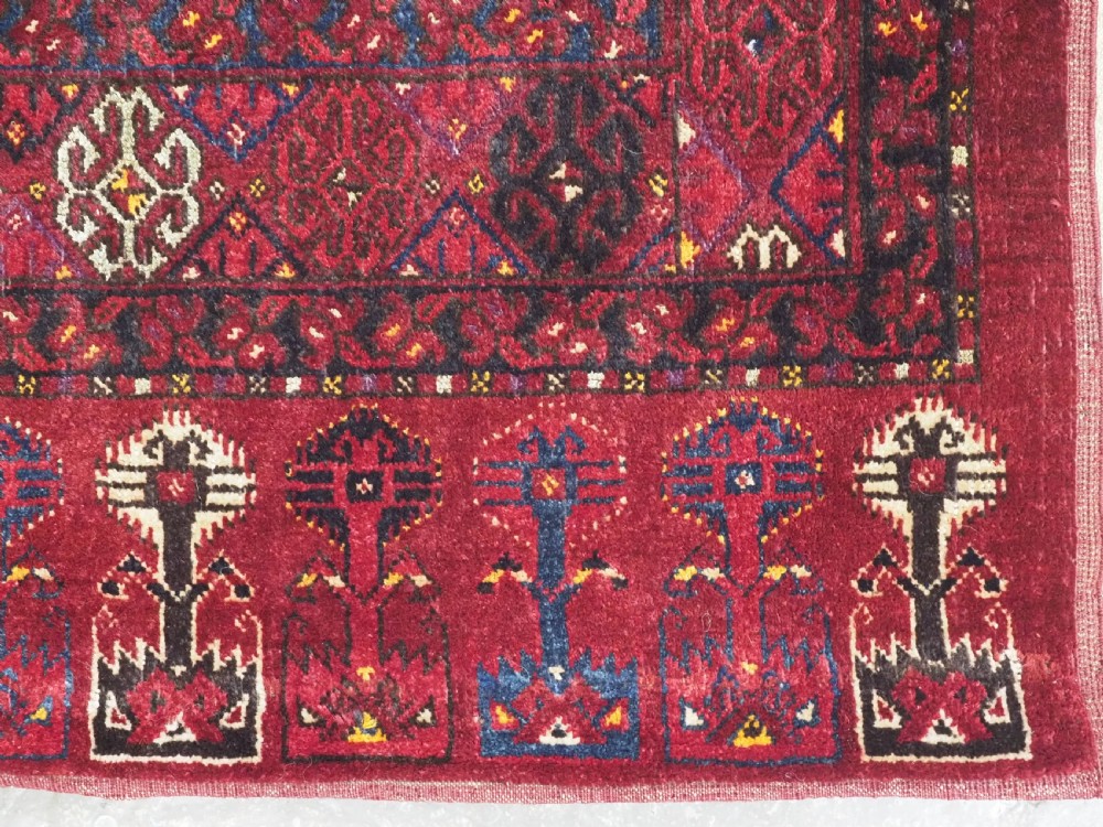 Size: 6ft 1in x 3ft 10in (185 x 117cm). Antique Afghan Ersari Turkmen chuval, probably by the Kizyl Ayak Turkmen. Circa 1900. A superb large chuval complete with its original plain weave back, the back is decorated to the upper part. The chuval face has 16 chuval guls seperated by minor guls with rams horn devices, there are purple silk highlights in the main guls and the minor guls, silk is also found in the border designs. The elem panel at the lower end is beautifully drawn with the classic Kizil Ayak shrubs or trees. The chuval is in excellent condition with very slight even wear and full pile, the chuval has been opened at the sides for display. Stock Number: DS-1444. All of our prices include FREE WORLD WIDE EXPRESS DELIVERY by DHL. To purchase any item please click on the payment link. We are also happy to accept most payment methods including American Express, bank transfers, debit & credit cards. To purchase by card over the telephone, please contact us on 01608 652111 or 0044 1608 652111 from outside the UK. Internal Ref: DS-1444