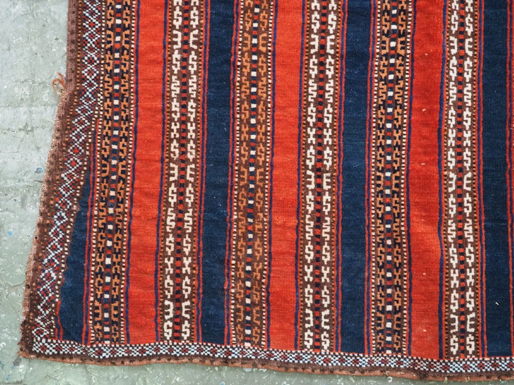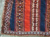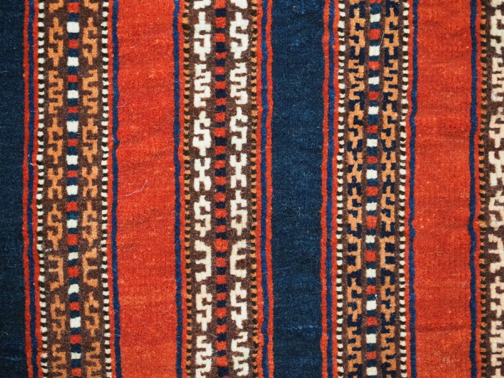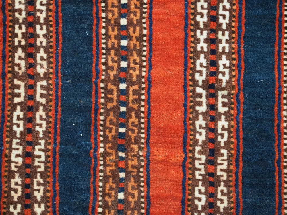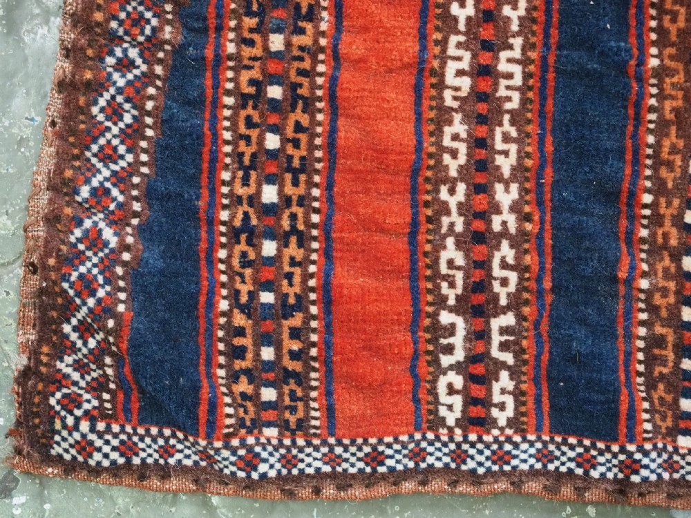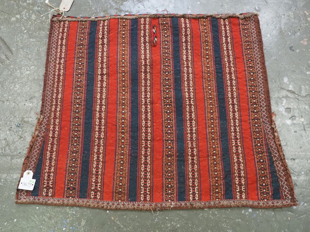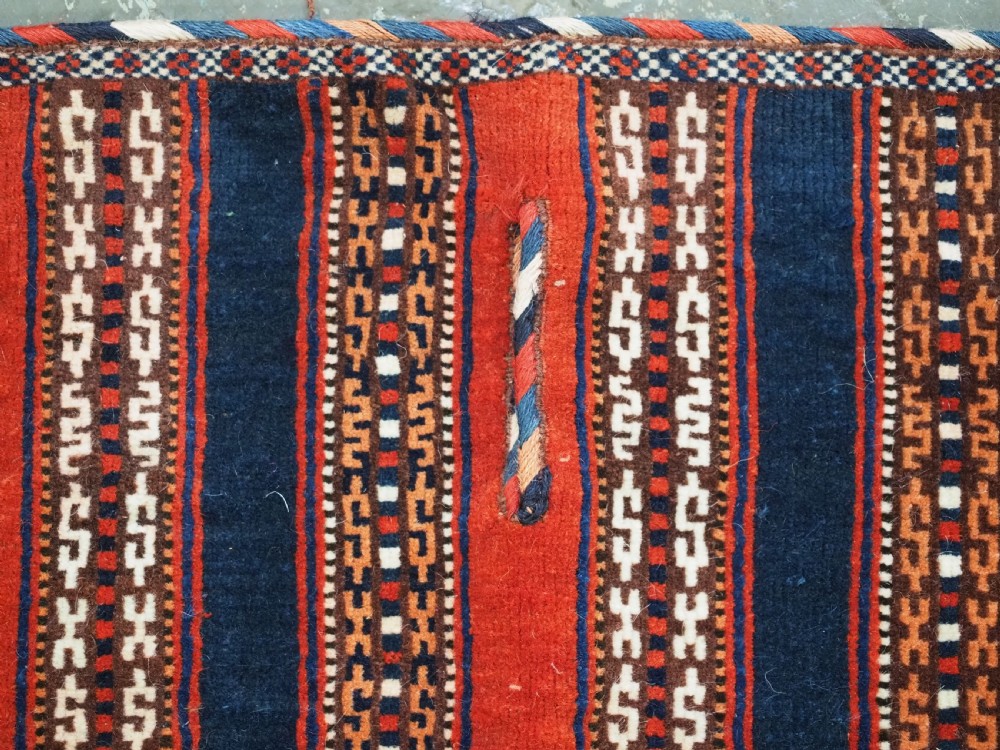 Size: 3ft 5inx 2ft 9in (105 x 85cm). Antique Yomut Turkmen tribal ceremonial horse saddle rug. Circa 1890. This horse saddle rug belongs to a small group of well known ceremonial horse covers, rugs and associated items woven by the Yomut Turkmen tribes of North Eastern Persia. The saddle rug in finely knotted with dense velvet like pile, giving the item the strength required for use. The banded design in shades of madder red, indigo blue and ivory is typical of this group of weavings. Note the slit in the rug, top centre for the pommel. There is an early UK customs tag attached to one corner. The saddle rug is in original condition with very slight wear and almost full pile, the dye quality is superb give the rich colours required for use on special occasions such as a tribal wedding. A superb collectible display item. Closely related items are published in 'Turkoman Tribal Rugs' by Werner Loges, plate 51, page 93. And another example is published in 'Turkoman Carpets' by Siawosch Azadi, item 41. Also see Jourden, Turkoman page 132. Stock Number: D-0675. All of our prices include FREE WORLD WIDE EXPRESS DELIVERY by DHL. To purchase any item please click on the payment link. We are also happy to accept most payment methods including American Express, bank transfers, debit & credit cards. To purchase by card over the telephone, please contact us on 01608 652111 or 0044 1608 652111 from outside the UK. Internal Ref: D-0675