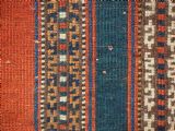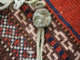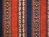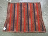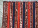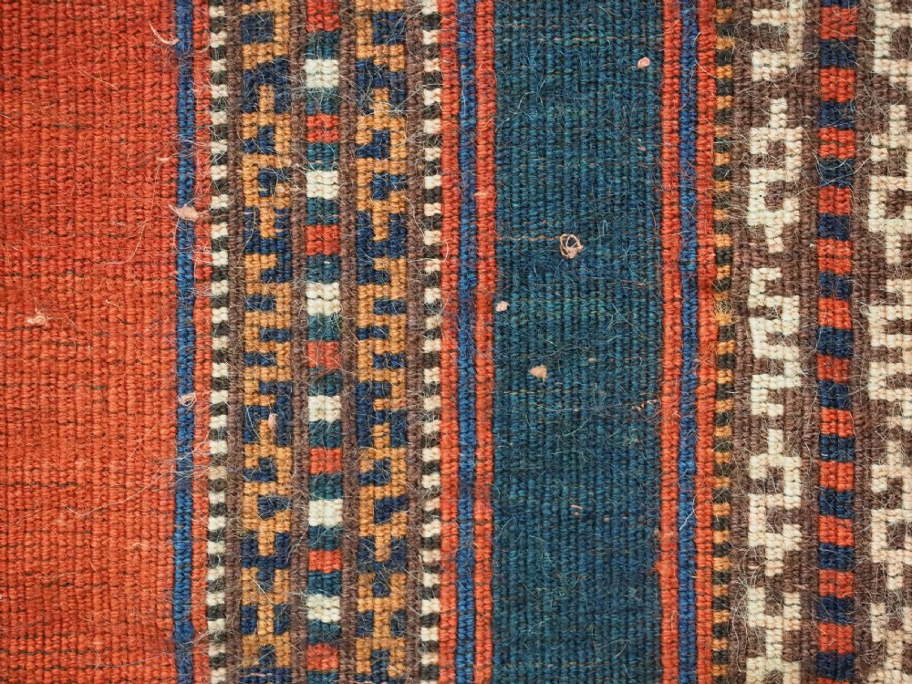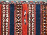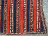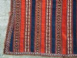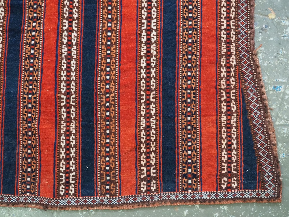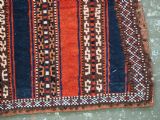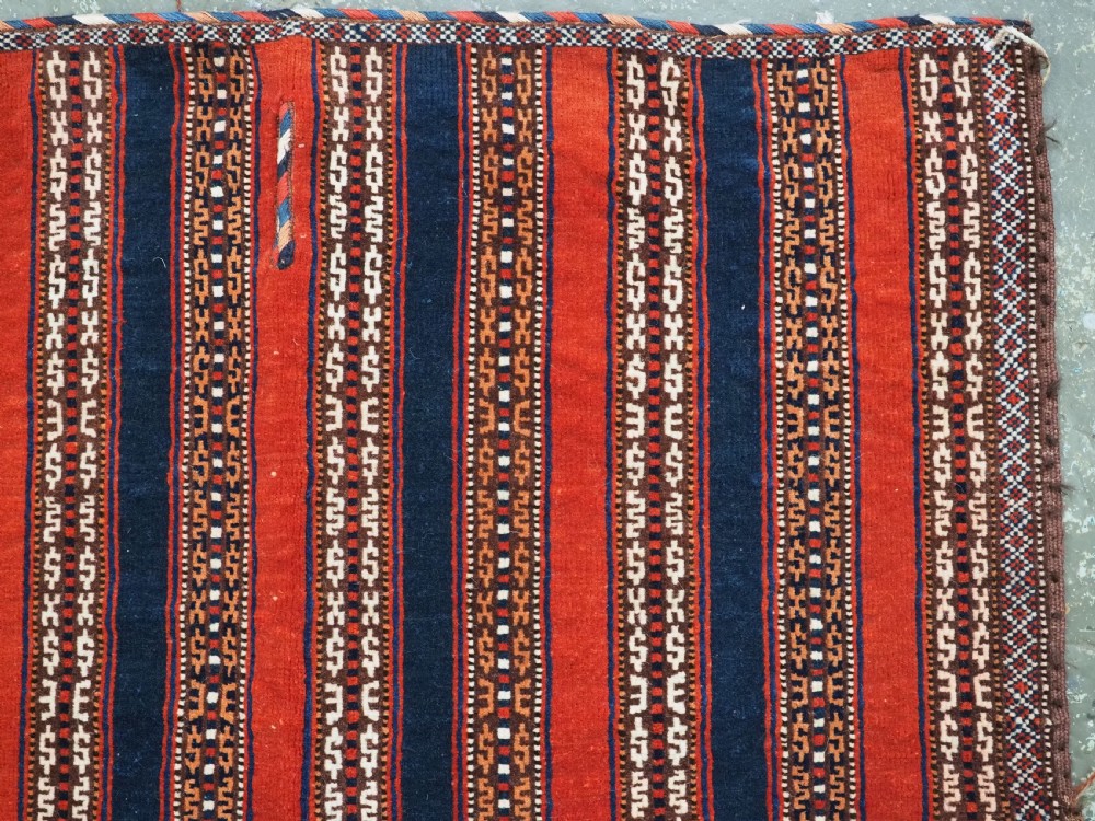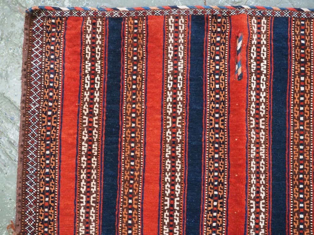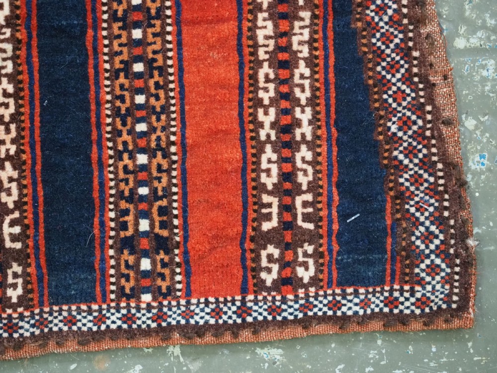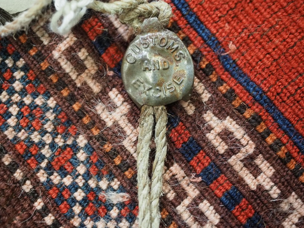 Size: 3ft 5inx 2ft 9in (105 x 85cm). Antique Yomut Turkmen tribal ceremonial horse saddle rug. Circa 1890. This horse saddle rug belongs to a small group of well known ceremonial horse covers, rugs and associated items woven by the Yomut Turkmen tribes of North Eastern Persia. The saddle rug in finely knotted with dense velvet like pile, giving the item the strength required for use. The banded design in shades of madder red, indigo blue and ivory is typical of this group of weavings. Note the slit in the rug, top centre for the pommel. There is an early UK customs tag attached to one corner. The saddle rug is in original condition with very slight wear and almost full pile, the dye quality is superb give the rich colours required for use on special occasions such as a tribal wedding. A superb collectible display item. Closely related items are published in 'Turkoman Tribal Rugs' by Werner Loges, plate 51, page 93. And another example is published in 'Turkoman Carpets' by Siawosch Azadi, item 41. Also see Jourden, Turkoman page 132. Stock Number: D-0675. All of our prices include FREE WORLD WIDE EXPRESS DELIVERY by DHL. To purchase any item please click on the payment link. We are also happy to accept most payment methods including American Express, bank transfers, debit & credit cards. To purchase by card over the telephone, please contact us on 01608 652111 or 0044 1608 652111 from outside the UK. Internal Ref: D-0675