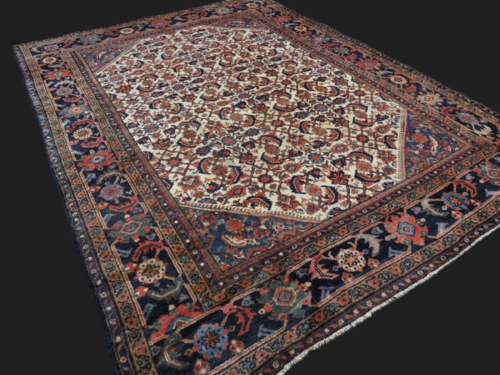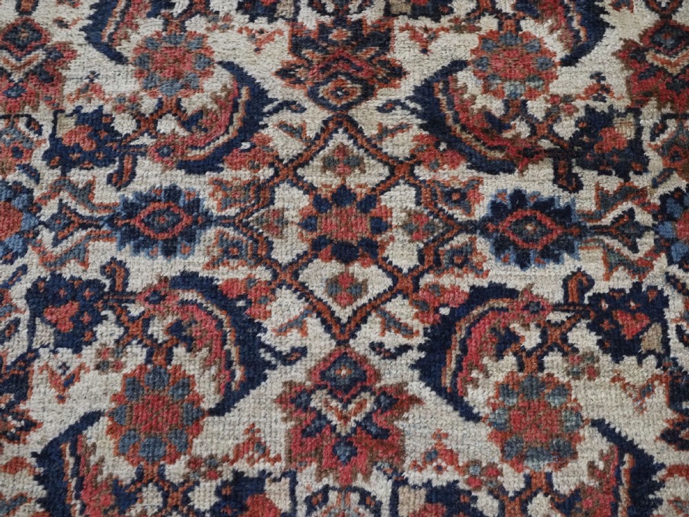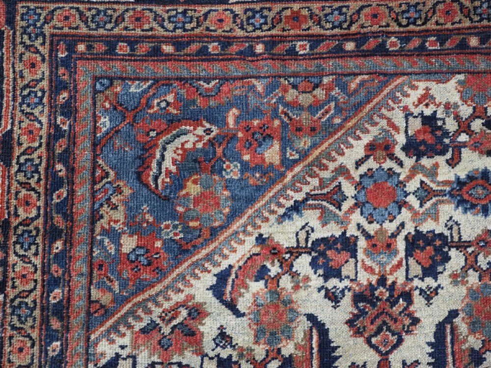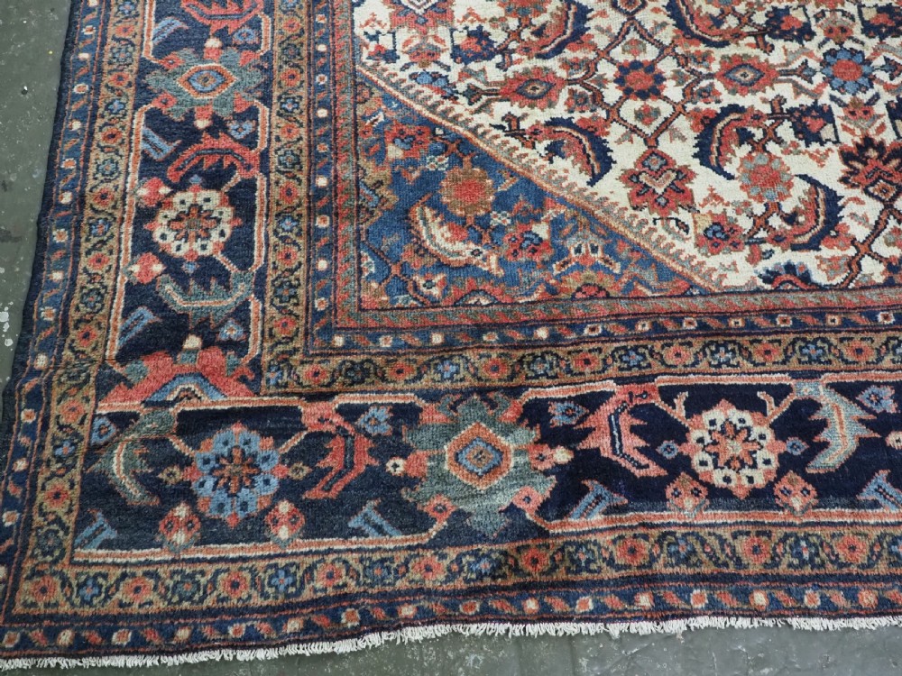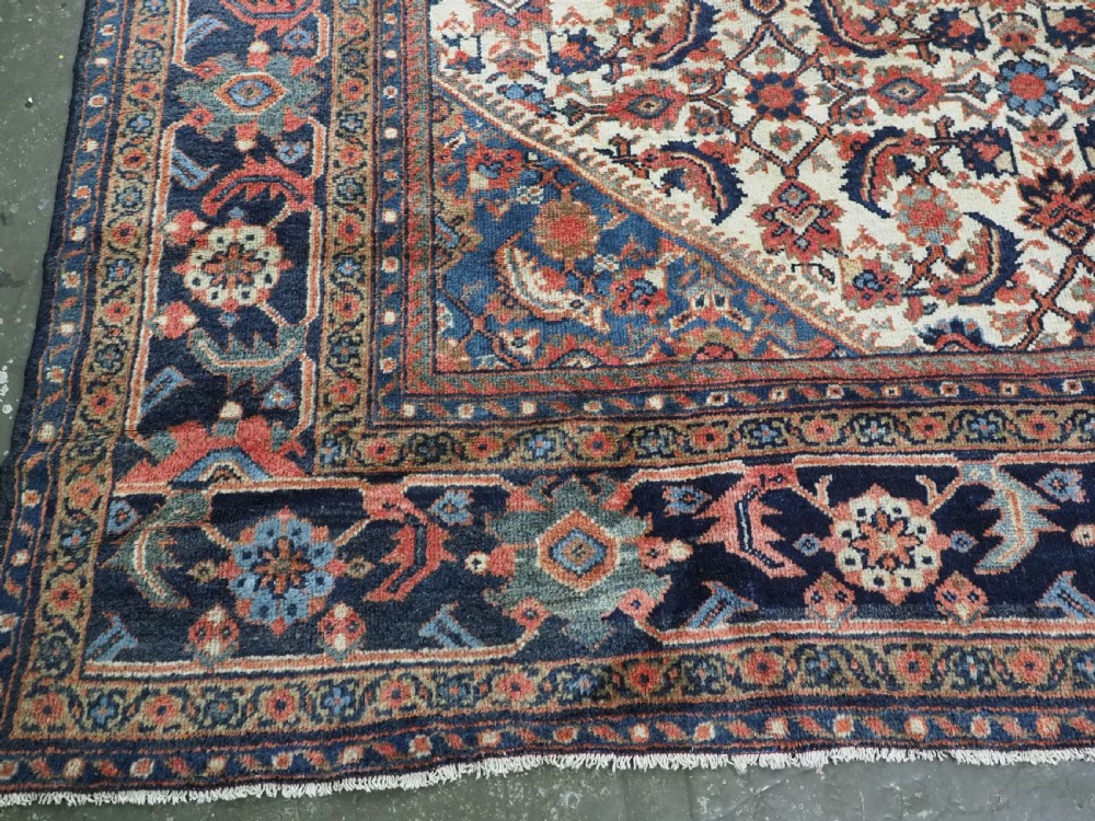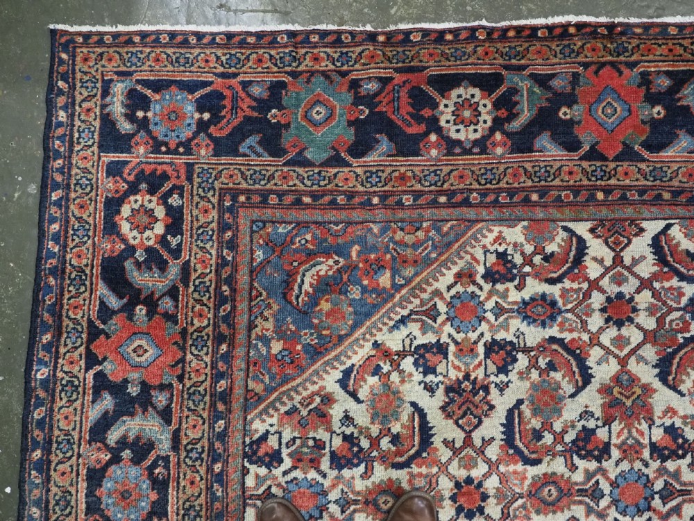 Size: 11ft 10in x 9ft 2in (360 x 280cm). Antique Persian Mahal carpet of good room size, with all over herati design. Circa 1900. A good country house furnishing carpet with all over large herati design on an ivory field, the indigo blue border frames the carpet really well. The carpet is beautifully drawn with wonderful colour throughout, the ivory field has a soft cream colour. The carpet is in excellent condition with even wear and medium pile. Hand washed and ready for use or display. The carpet is suitable for normal domestic use. Stock Number: R-2859. All of our prices include FREE WORLD WIDE EXPRESS DELIVERY by DHL. To purchase any item please click on the payment link. We are also happy to accept most payment methods including American Express, bank transfers, debit & credit cards. To purchase by card over the telephone, please contact us on 01608 652111 or 0044 1608 652111 from outside the UK. Internal Ref: R-2859