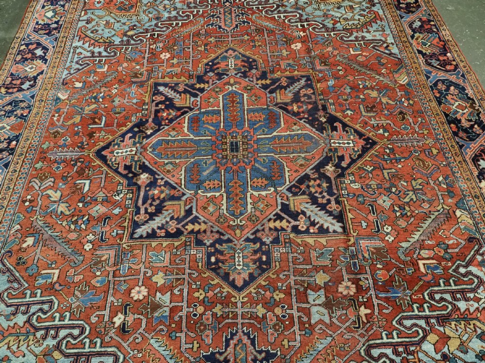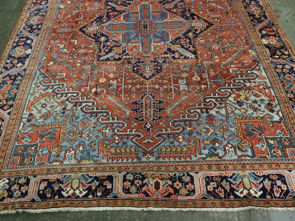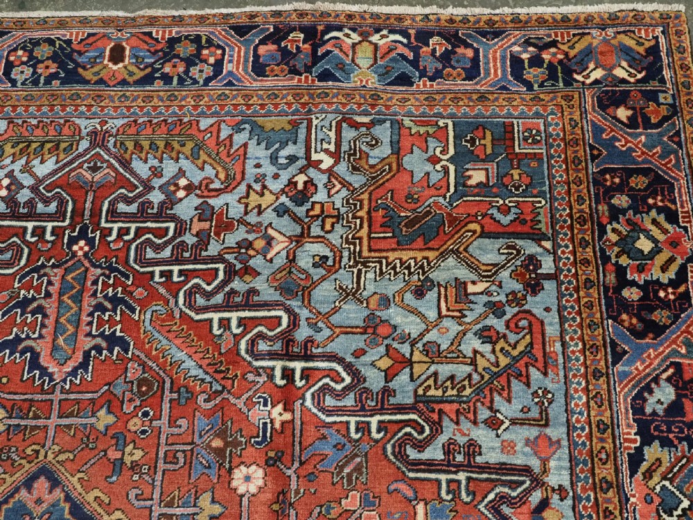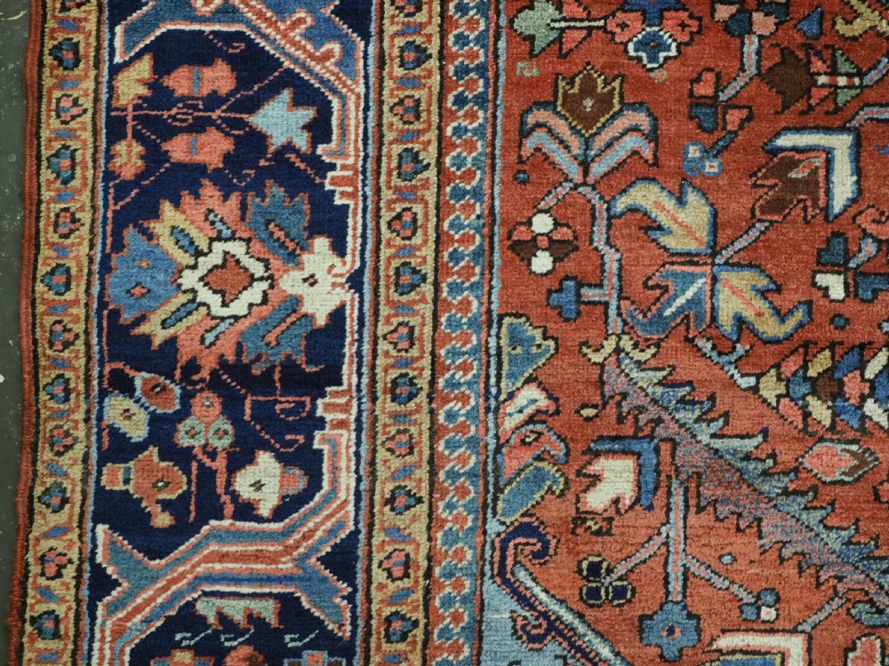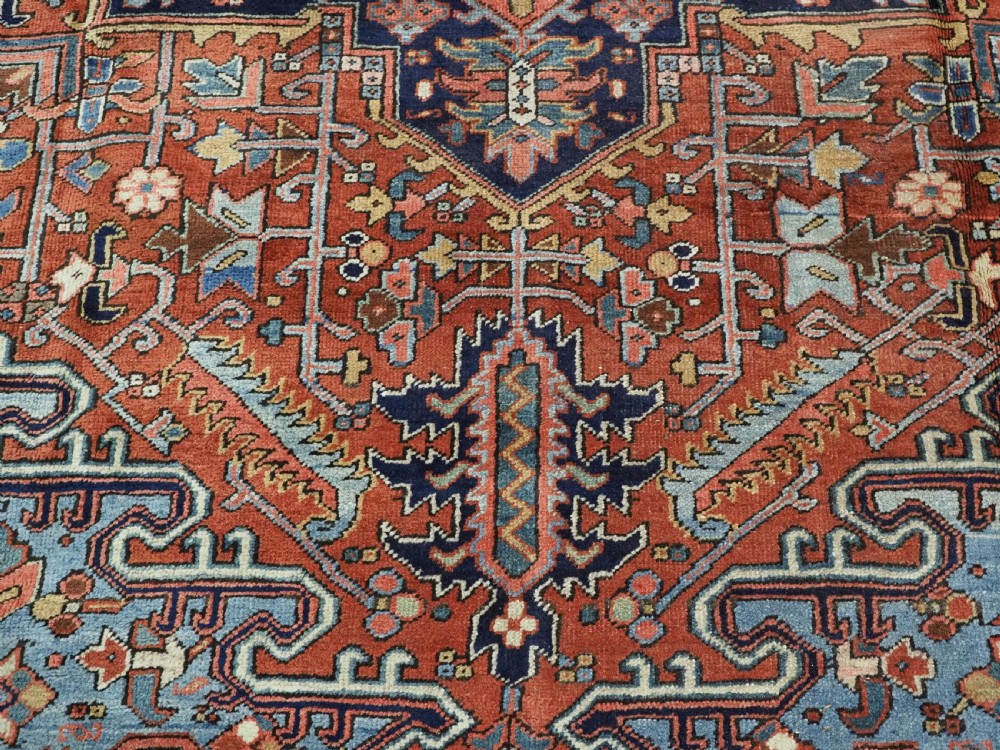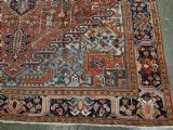 The carpet has a large central star medallion of traditional Heriz design, the ground colour is a superb madder red with a terracotta / rust tone, with the open floral spray design in pastel colours. The spandrels are in soft powder blue which creates a very light feel to the carpet. The well drawn indigo blue classic Heriz border frames the carpet well. A superb designers carpet for that timeless country house look. The carpet is in excellent condition with very slight even wear and good pile. The carpet is suitable for heavy domestic use such as a living or dining room. The carpet has been hand washed and is ready for use or display. Stock Number: R-2864. All of our prices include FREE WORLD WIDE EXPRESS DELIVERY by DHL. To purchase any item please click on the payment link. We are also happy to accept most payment methods including American Express, bank transfers, debit & credit cards. To purchase by card over the telephone, please contact us on 01608 652111 or 0044 1608 652111 from outside the UK. Internal Ref: R-2864