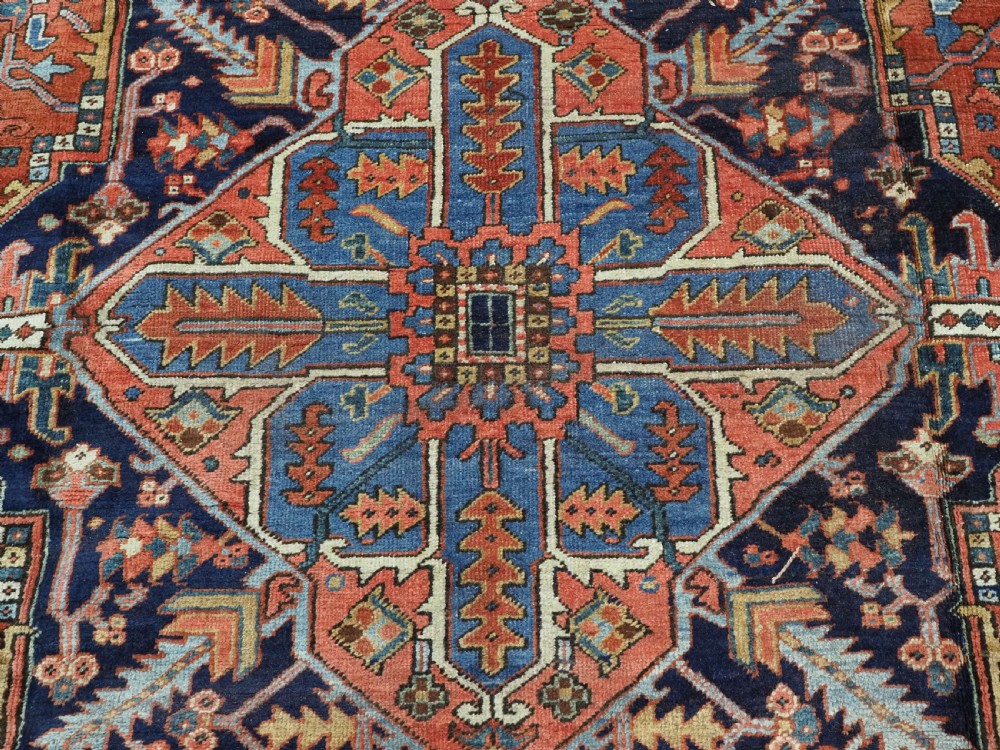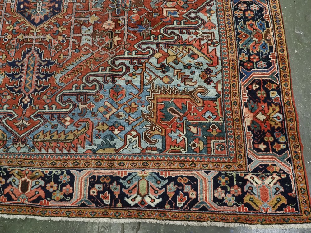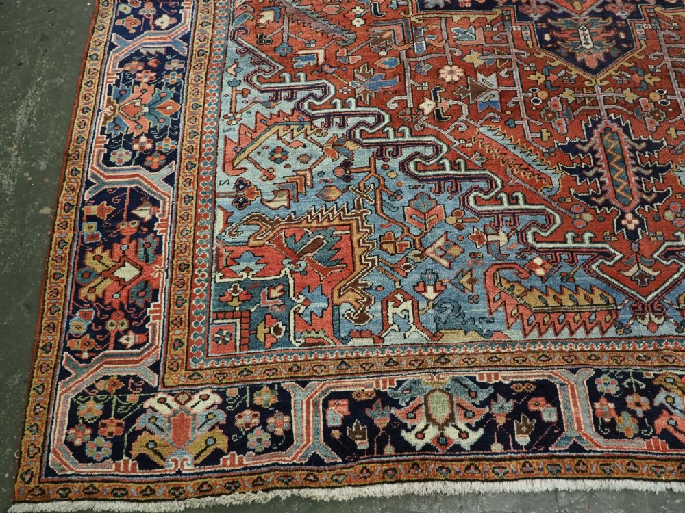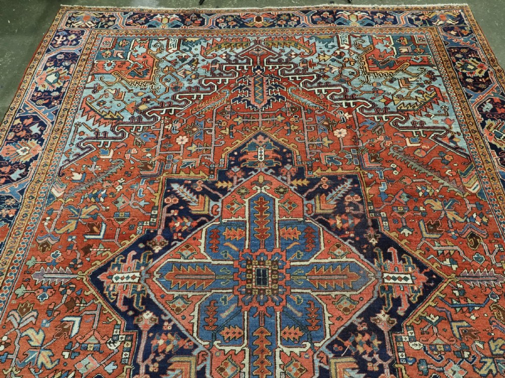 Size: 12ft 0in x 9ft 5in (365 x 288cm). Antique Heriz carpet with a very well-drawn and striking large medallion with superb colours through out. Circa 1900.
