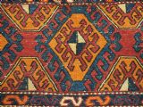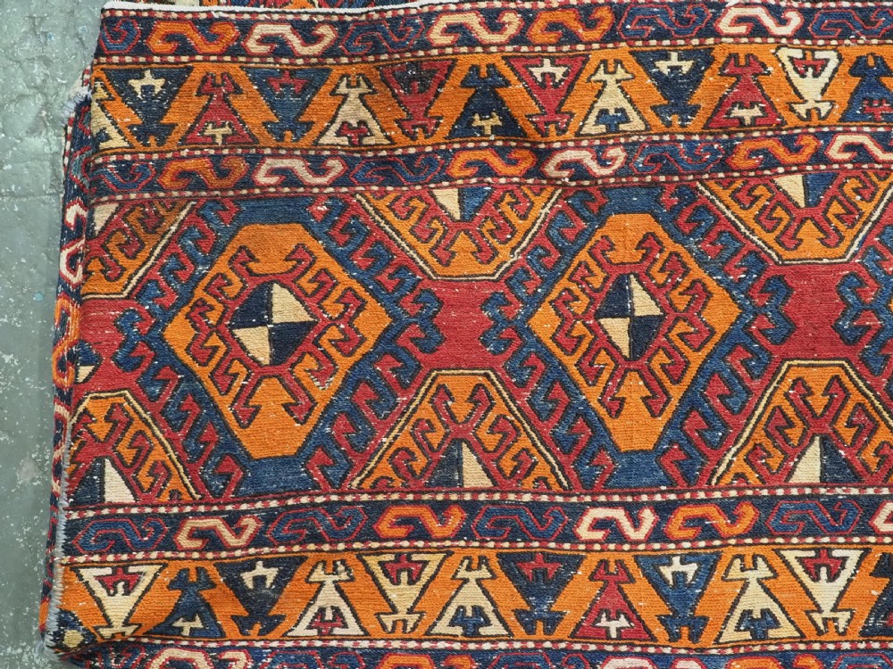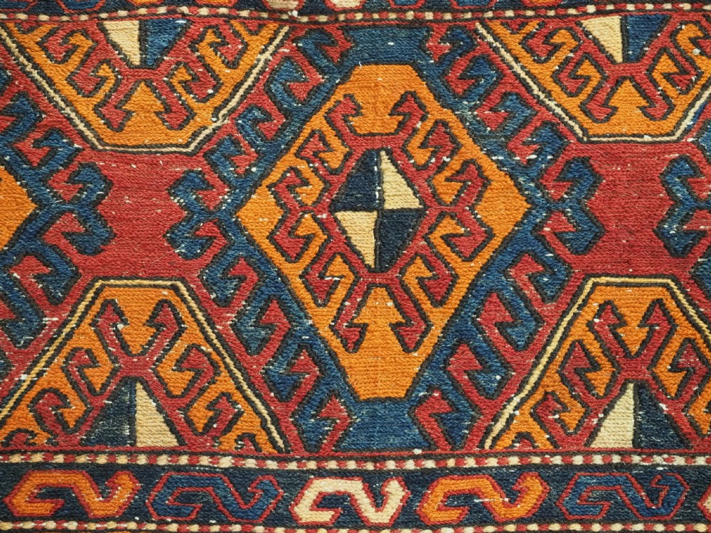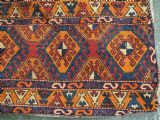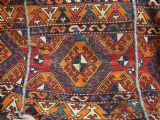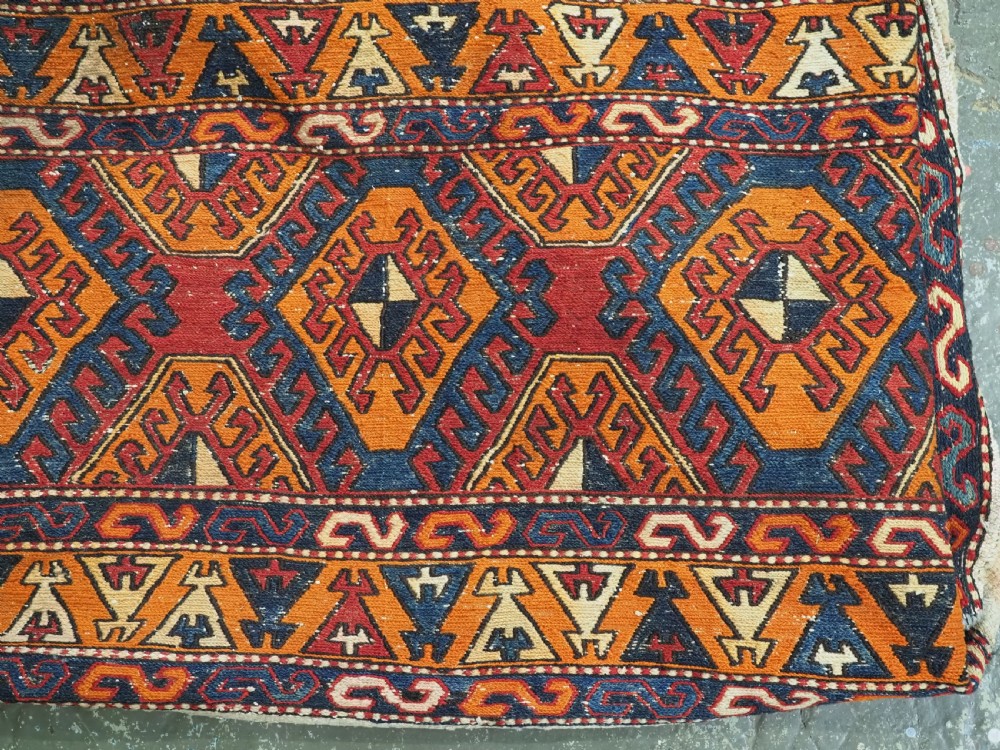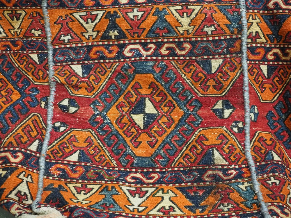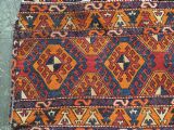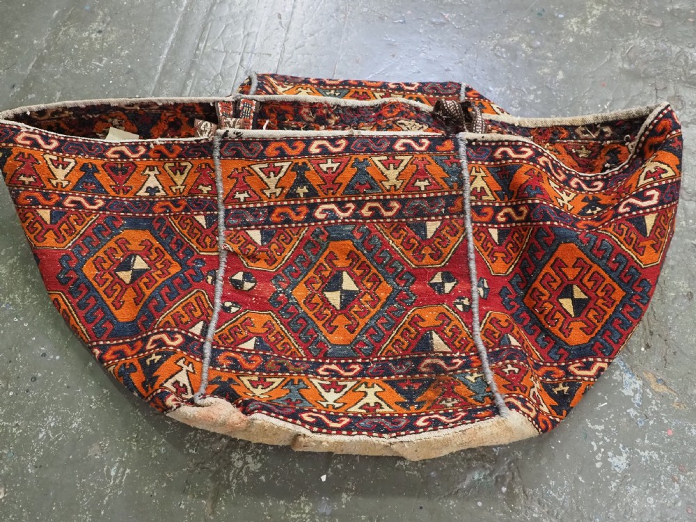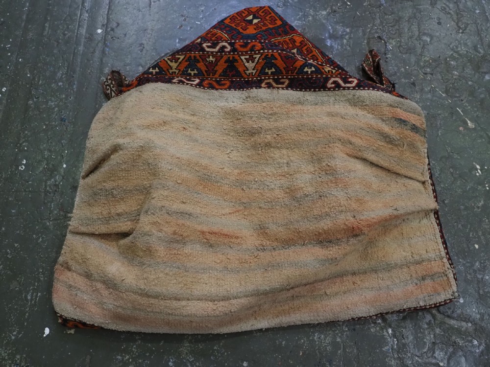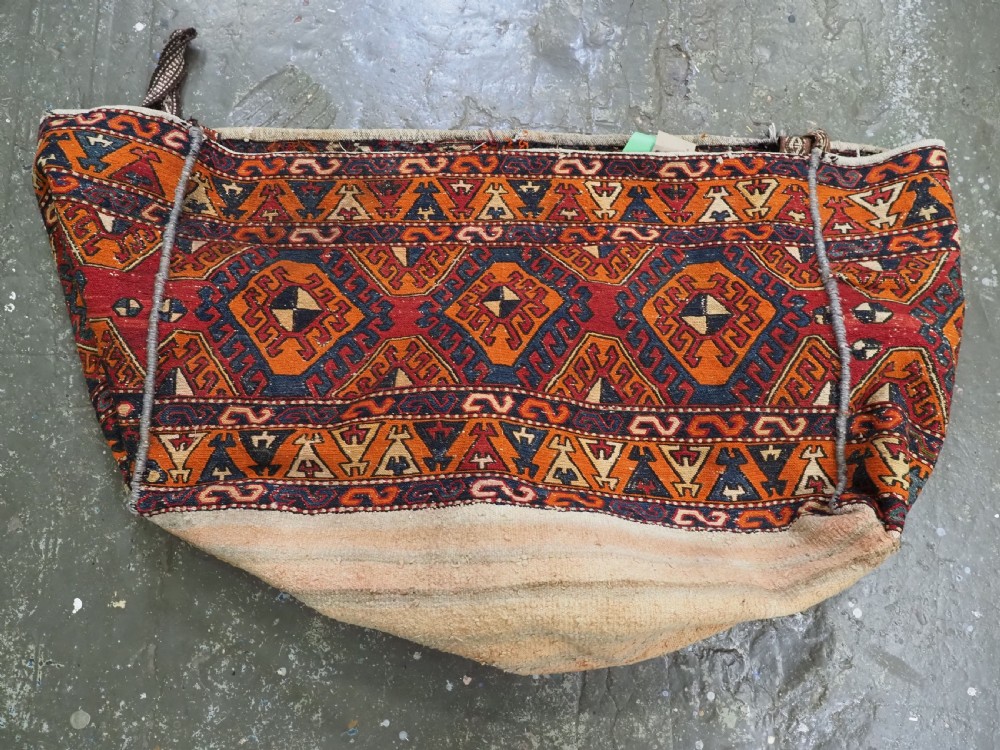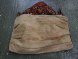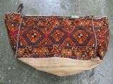 A good example of a mafrash storage bag, used for transporting goods during the migration and for storage within the tribal tent. This example is in soumak, with a traditional design. The base is in striped plain weave.