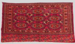 Size: 4ft 2in x 2ft 3in (127 x 69cm). Antique Tekke Turkmen chuval face with 30 chuval guls. Circa 1880. A good chuval face with five rows of six chuval guls on a clear madder red ground. The chuval face is of very fine weave with a feeling of good age. The main border is a classic Turkmen design. The elem is of a Turkmen tree design. Good condition with even wear and medium pile, The sides have been slightly reduced and re-bound. Hanging loops are attached for wall display. Stock Number: C-04. All of our prices include FREE WORLD WIDE EXPRESS DELIVERY by DHL. To purchase any item please click on the payment link. We are also happy to accept most payment methods including American Express, bank transfers, debit & credit cards. To purchase by card over the telephone, please contact us on 01608 652111 or 0044 1608 652111 from outside the UK. Internal Ref: C-04