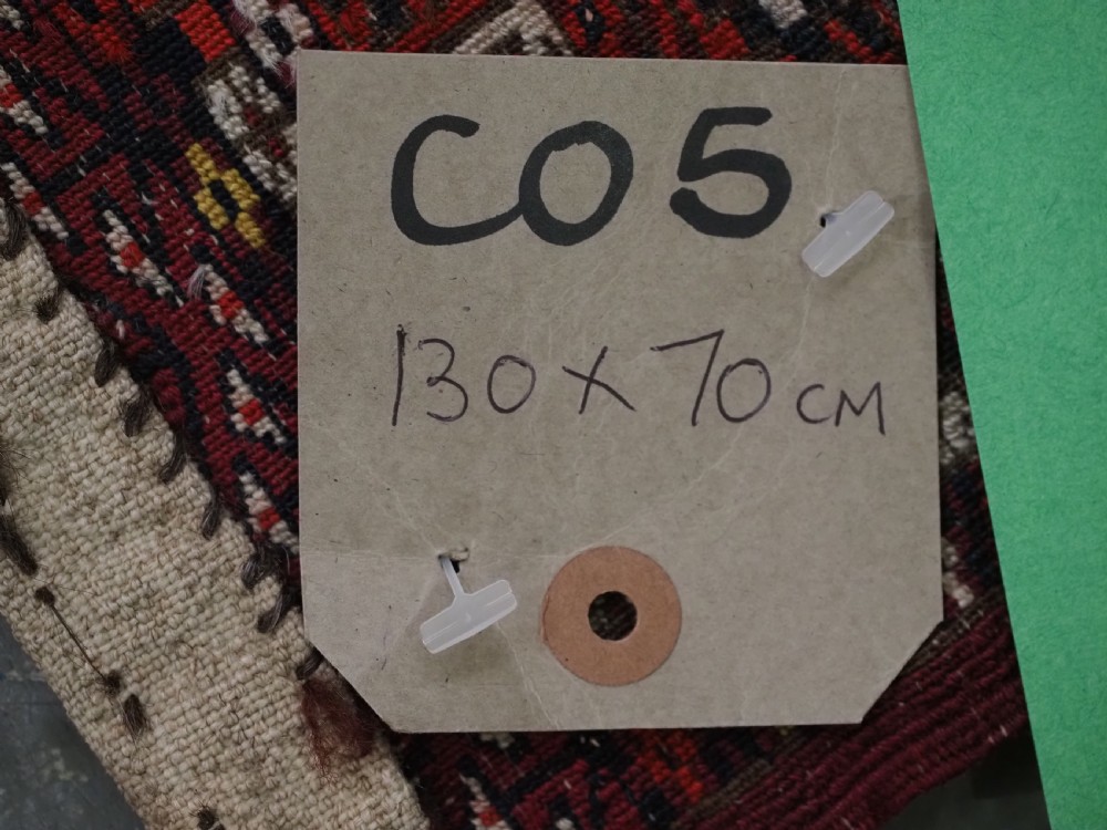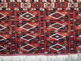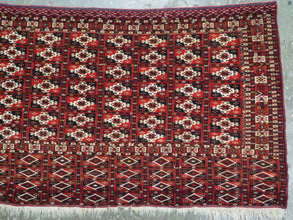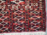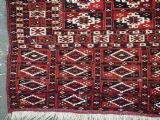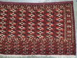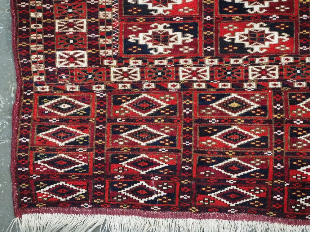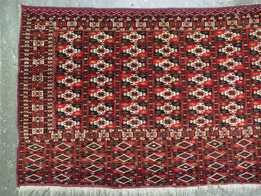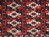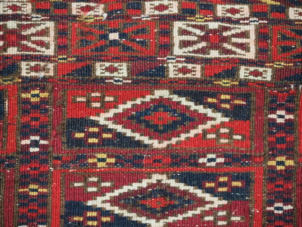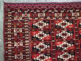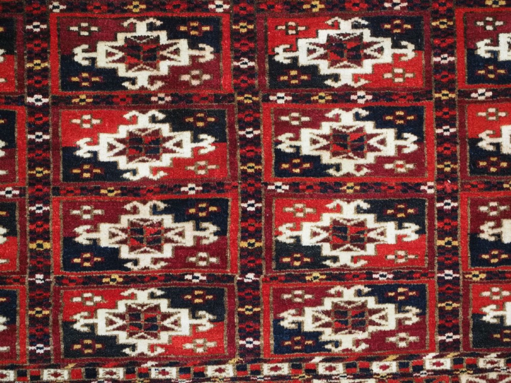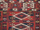Size: 4ft 3in x 2ft 4in (130 x 70cm). Antique Tekke Turkmen chuval of scarce format with 'Aina' guls. Circa 1880. An excellent Tekke Turkmen chuval face of very fine weave and scarce design. The main field is filled with 56 aina guls of the chuval gul format; the elem has 44 guls of the diamond design. The main border is of the 'Flag' design or 'Tekbent' design as it is known to the Turkmen, this border is found on early Tekke weavings. 100 guls in total on a chuval face, I have never seen more. Excellent condition with even wear and medium pile. Stock Number: C-05. All of our prices include FREE WORLD WIDE EXPRESS DELIVERY by DHL. To purchase any item please click on the payment link. We are also happy to accept most payment methods including American Express, bank transfers, debit & credit cards. To purchase by card over the telephone, please contact us on 01608 652111 or 0044 1608 652111 from outside the UK. Internal Ref: C-05