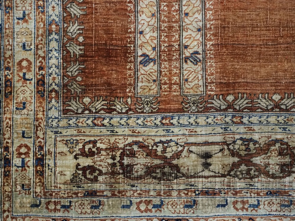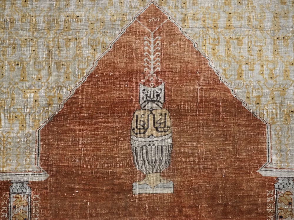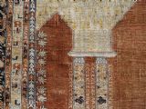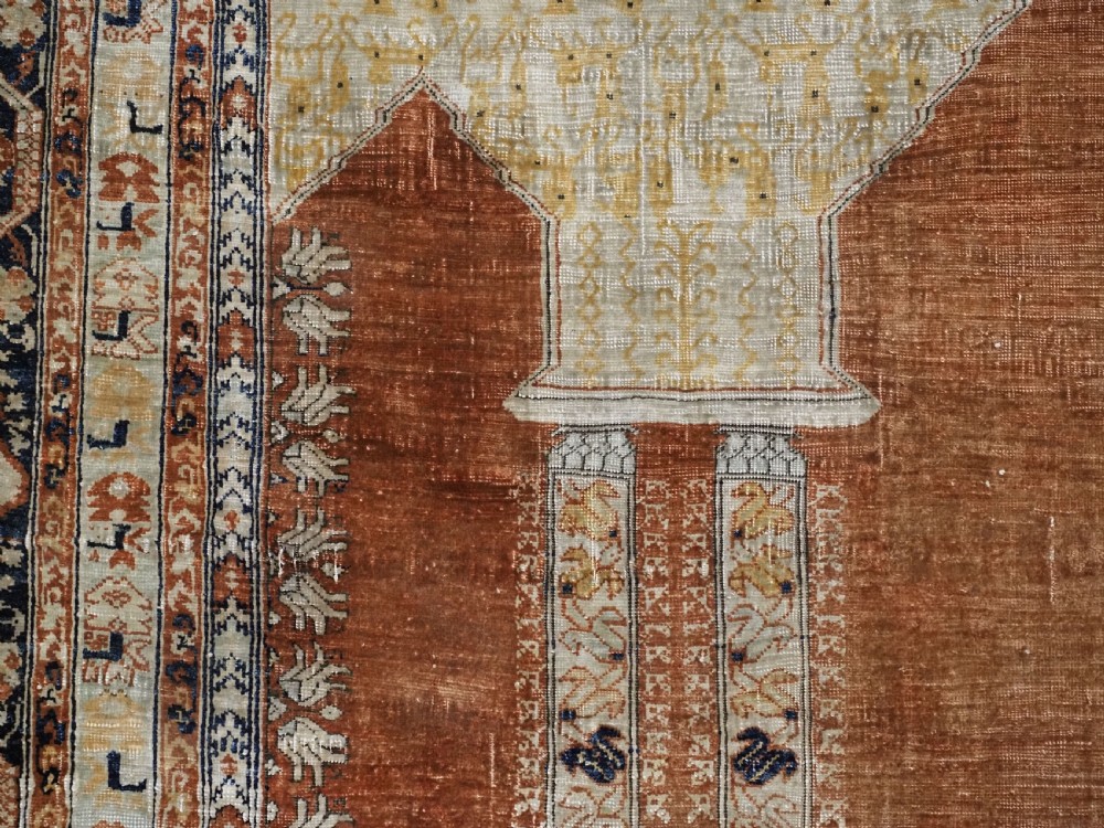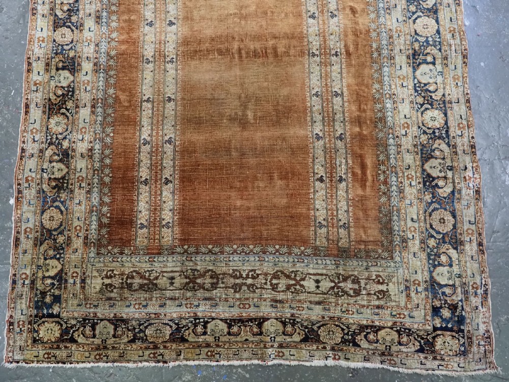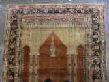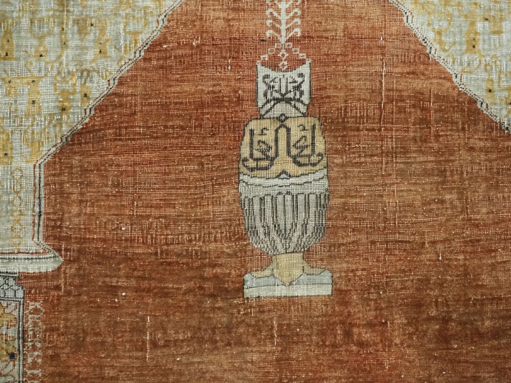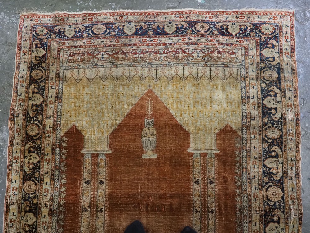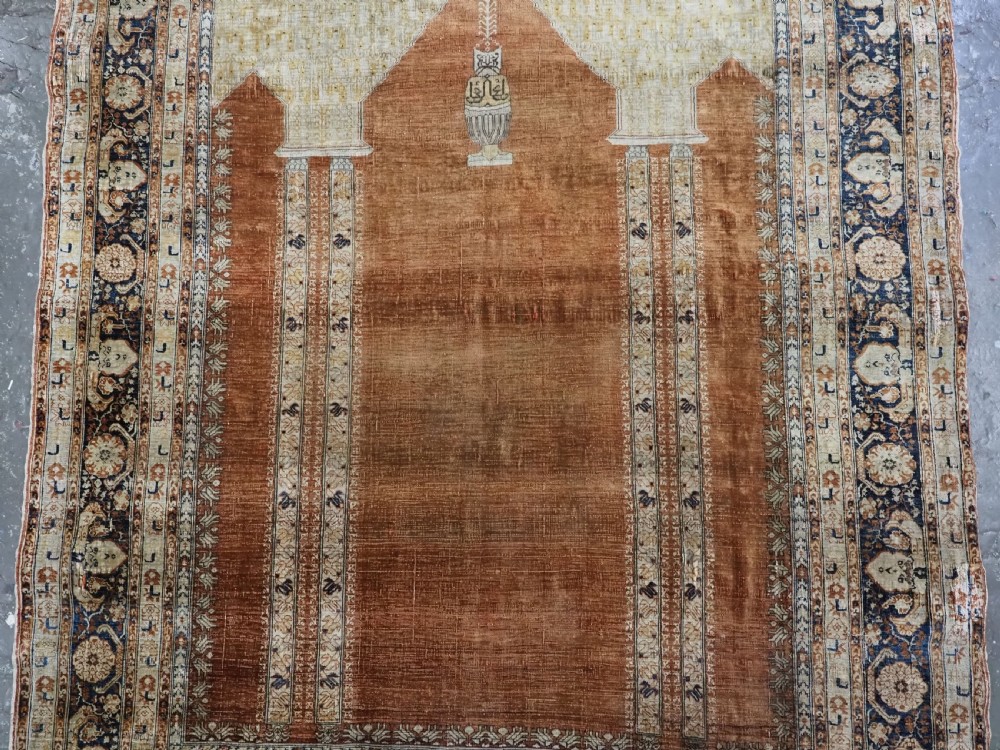 An antique Tabriz silk prayer rug with a faded terracotta red field, the rug has a design closely related to the 17th / 18th century prayer rugs from Ghiordes in Turkey. The two double columns support three pointed arches. The central arch is accentuated by its size and the mosque lamp suspended from its apex. The saffron yellow and ivory ground section of the field above it, with trefoils and delicately drawn plants at its upper end, contains a fine lattice design. A horizontal panel of cartouches provides the upper finish of the field. The wide border is of a classical Persian design and composed of seven bands, the main border in a dark indigo blue. At the apex to the central arch above the lantern is a number, this relates to the workshop who made the rug.
