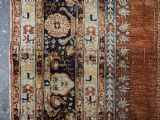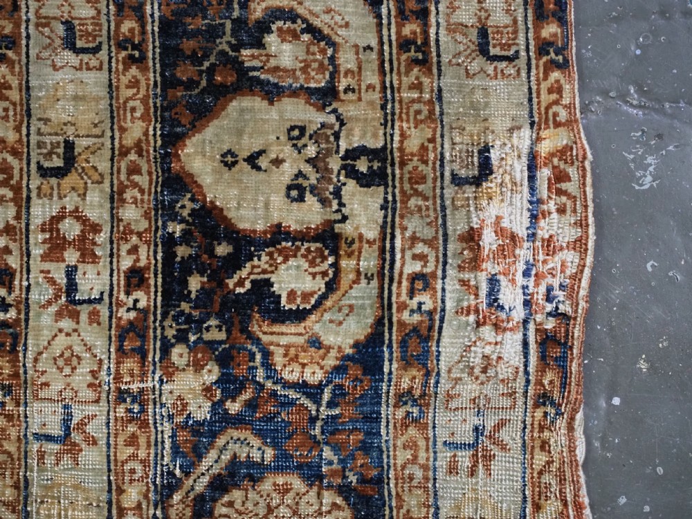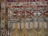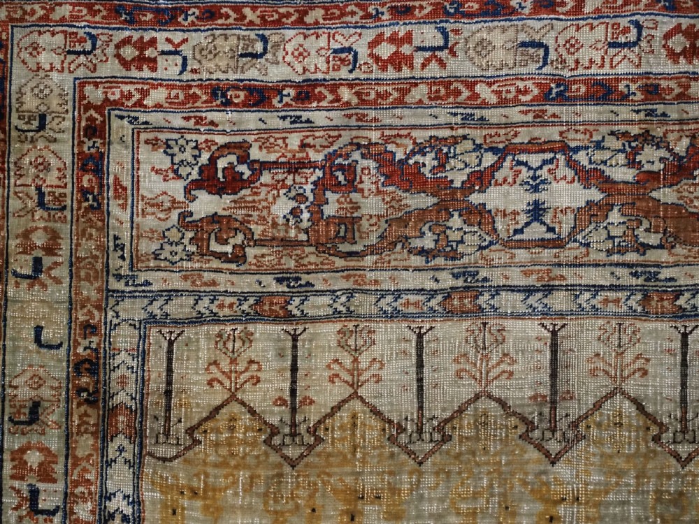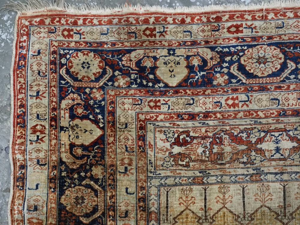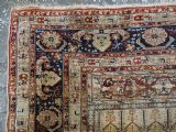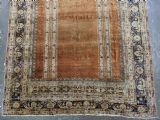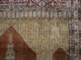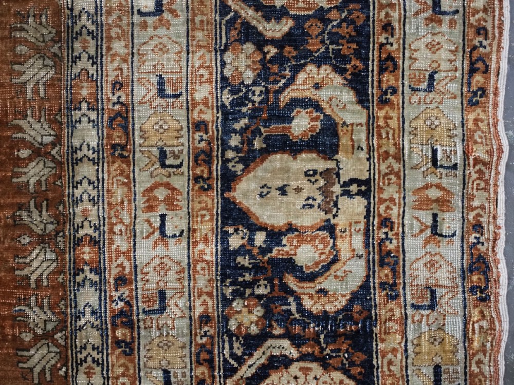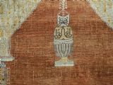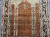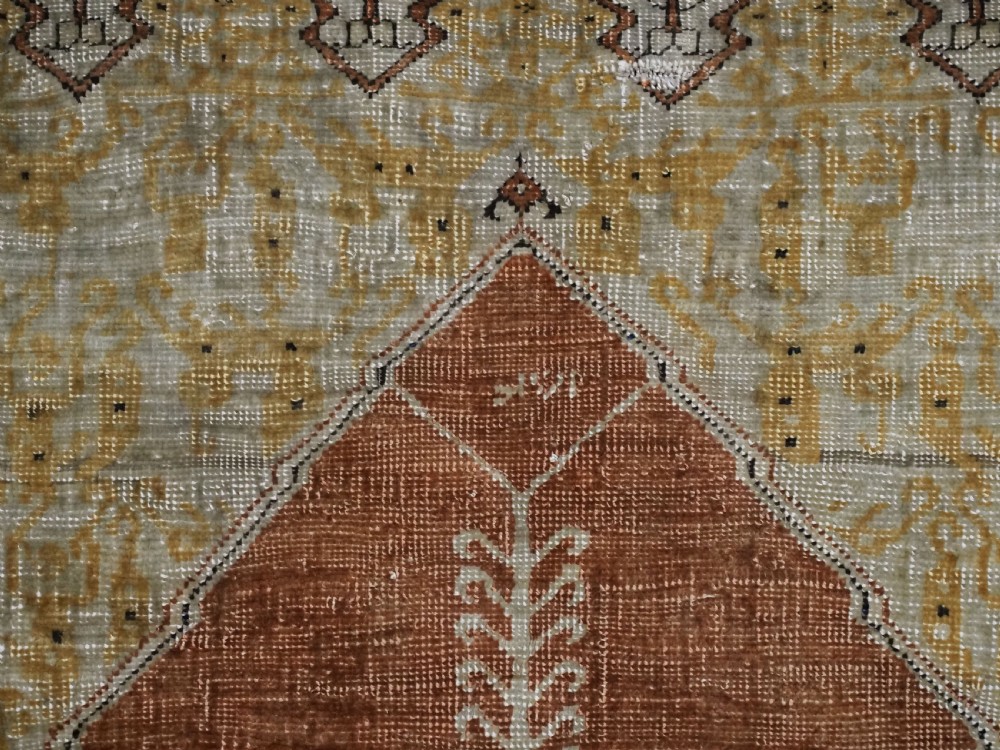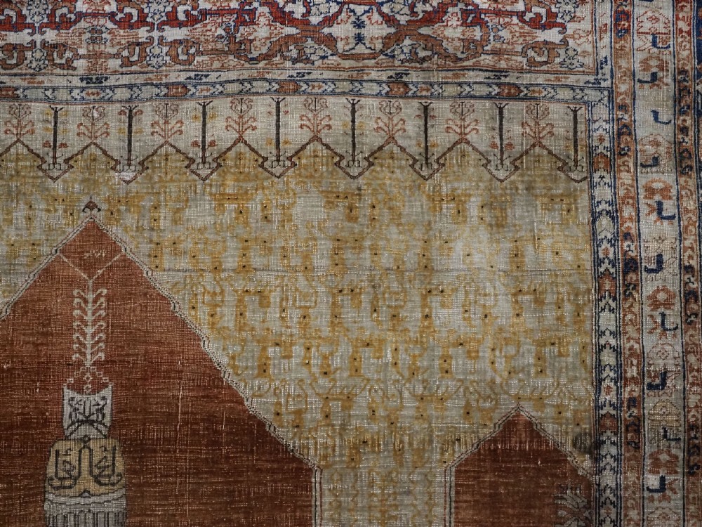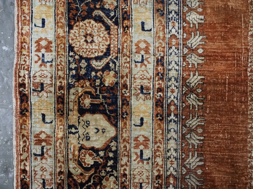 An antique Tabriz silk prayer rug with a faded terracotta red field, the rug has a design closely related to the 17th / 18th century prayer rugs from Ghiordes in Turkey. The two double columns support three pointed arches. The central arch is accentuated by its size and the mosque lamp suspended from its apex. The saffron yellow and ivory ground section of the field above it, with trefoils and delicately drawn plants at its upper end, contains a fine lattice design. A horizontal panel of cartouches provides the upper finish of the field. The wide border is of a classical Persian design and composed of seven bands, the main border in a dark indigo blue. At the apex to the central arch above the lantern is a number, this relates to the workshop who made the rug.