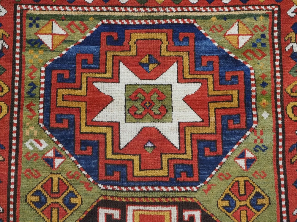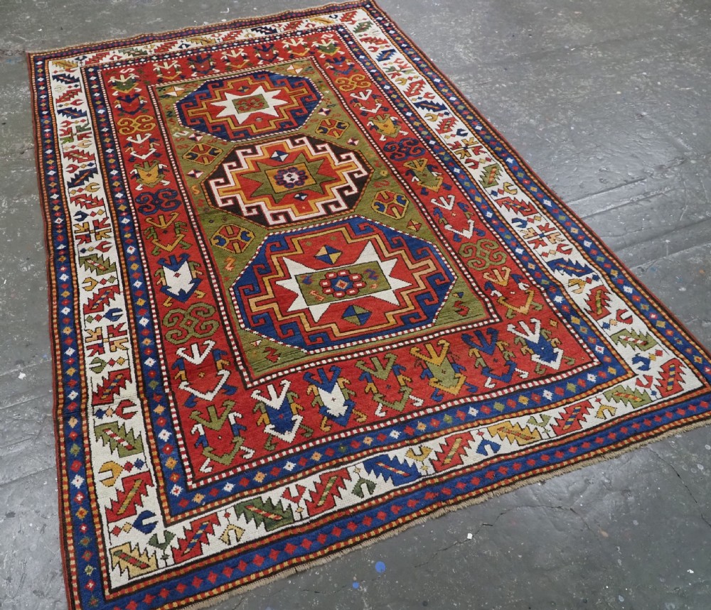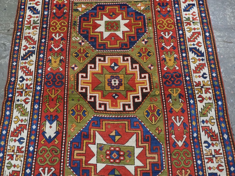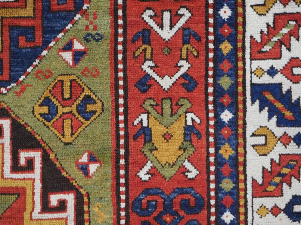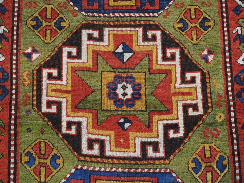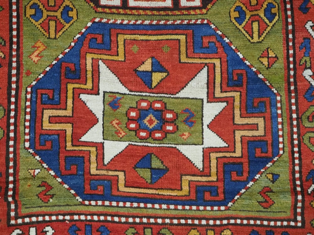 Size: 7ft 3in x 5ft 0in (222 x 152cm). Antique Caucasian Kazak rug with three 'Memlinc guls' in octagons on a green ground. Circa 1880. A superb Kazak rug with a single vertical column of three 'Memlinc guls' on a scarce green ground; this is a rug of outstanding colour and design. The three guls stand out against the warm green inner field which is surrounded by a madder red field filled with tribal devices. The main border is the classic white ground with 'oak leaf' design. The rug has wonderful soft wool and fully saturated dyes. This is a really outstanding example of type with superb colour. The rug is in excellent condition with slight even wear with good long pile with a soft floppy handle. Hand washed and ready for use or display. The rug is suitable for normal domestic use. Stock Number: R-2765. All of our prices include FREE WORLD WIDE EXPRESS DELIVERY by DHL. To purchase any item please click on the payment link. We are also happy to accept most payment methods including American Express, bank transfers, debit & credit cards. To purchase by card over the telephone, please contact us on 01608 652111 or 0044 1608 652111 from outside the UK. Internal Ref: R-2765