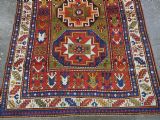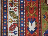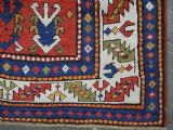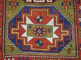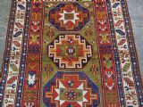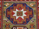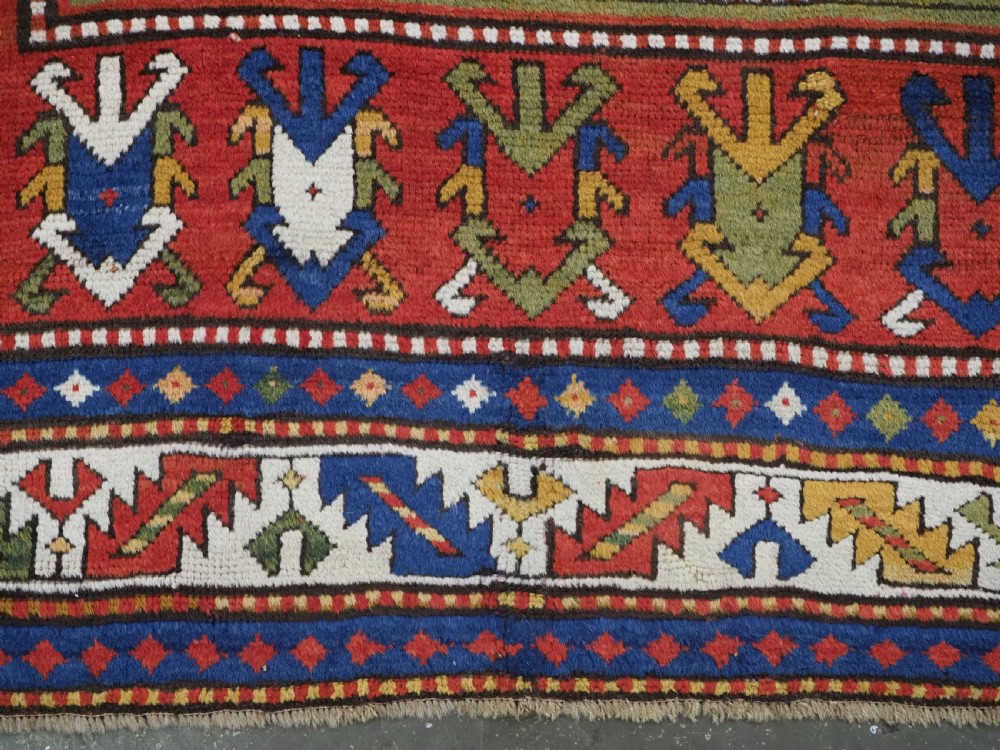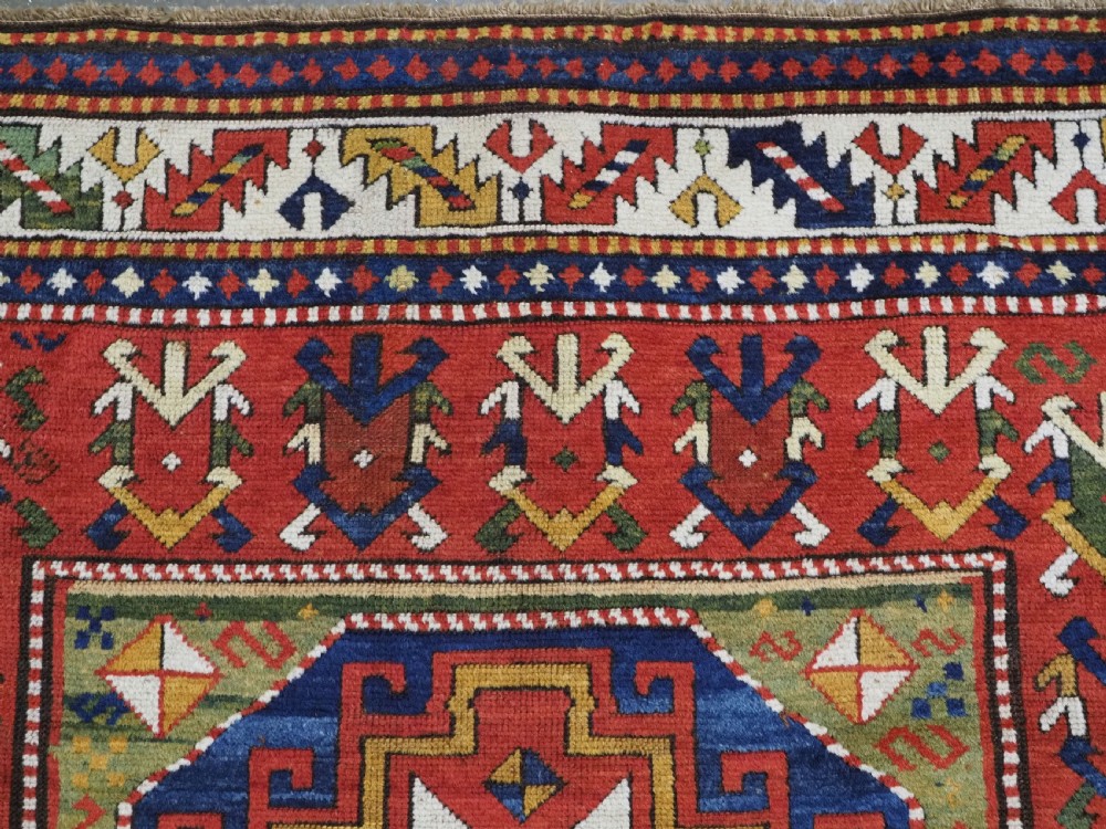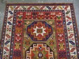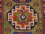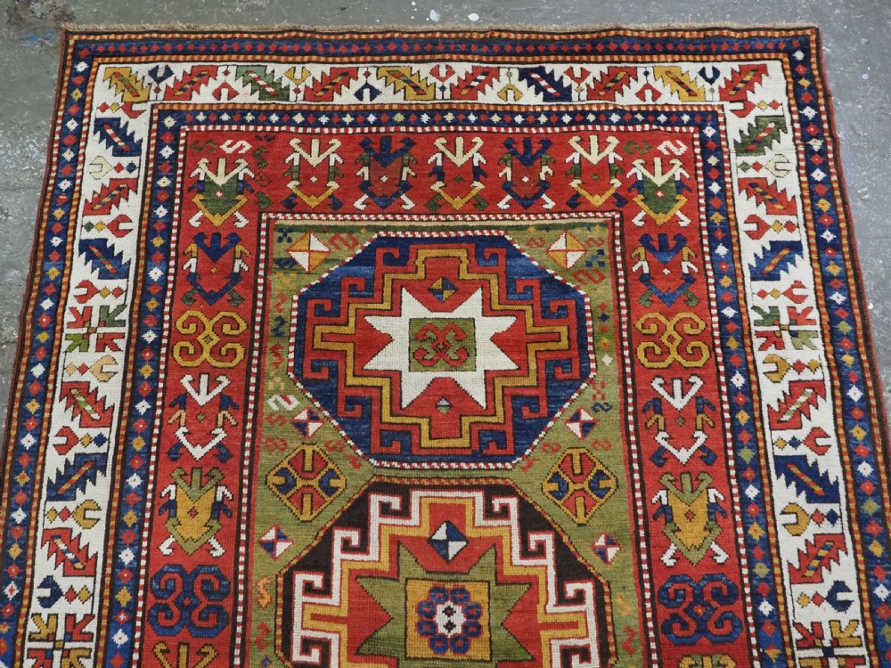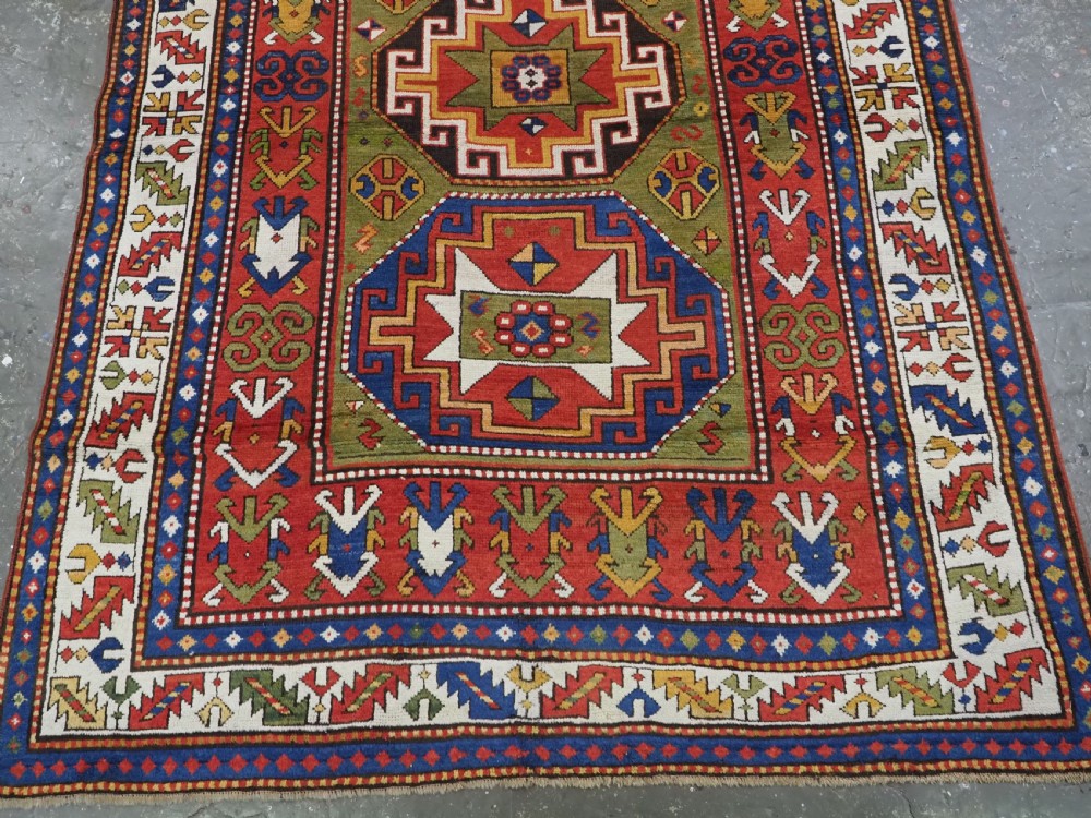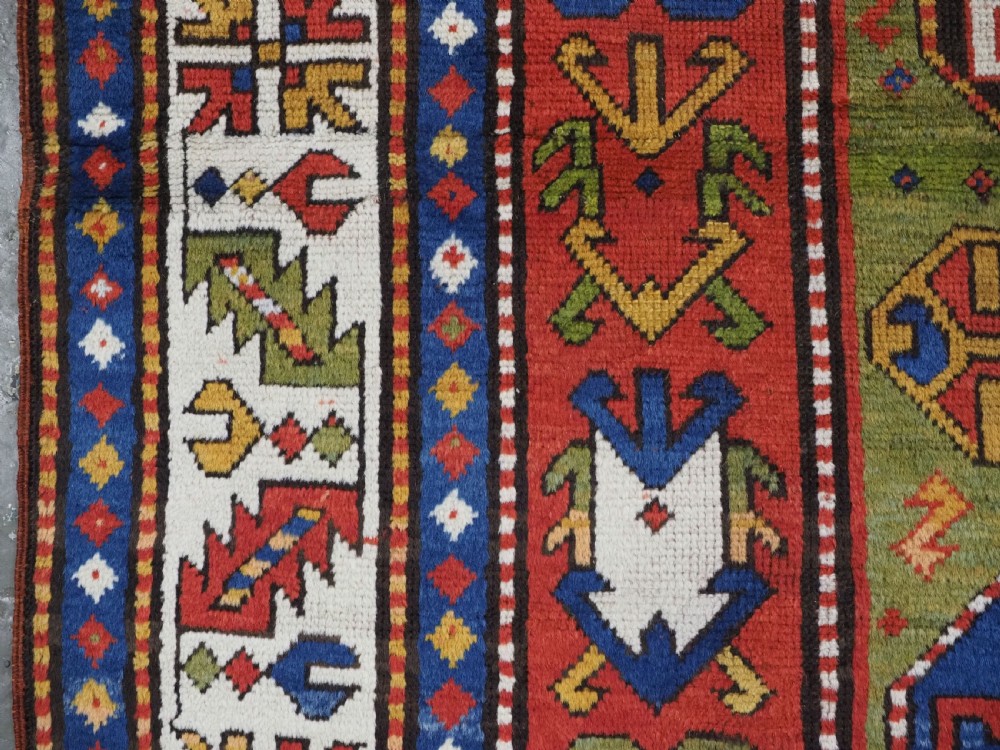 Size: 7ft 3in x 5ft 0in (222 x 152cm). Antique Caucasian Kazak rug with three 'Memlinc guls' in octagons on a green ground. Circa 1880. A superb Kazak rug with a single vertical column of three 'Memlinc guls' on a scarce green ground; this is a rug of outstanding colour and design. The three guls stand out against the warm green inner field which is surrounded by a madder red field filled with tribal devices. The main border is the classic white ground with 'oak leaf' design. The rug has wonderful soft wool and fully saturated dyes. This is a really outstanding example of type with superb colour. The rug is in excellent condition with slight even wear with good long pile with a soft floppy handle. Hand washed and ready for use or display. The rug is suitable for normal domestic use. Stock Number: R-2765. All of our prices include FREE WORLD WIDE EXPRESS DELIVERY by DHL. To purchase any item please click on the payment link. We are also happy to accept most payment methods including American Express, bank transfers, debit & credit cards. To purchase by card over the telephone, please contact us on 01608 652111 or 0044 1608 652111 from outside the UK. Internal Ref: R-2765