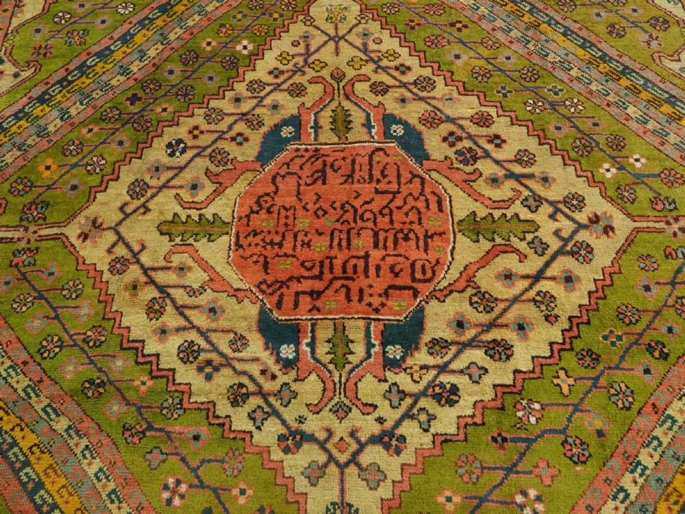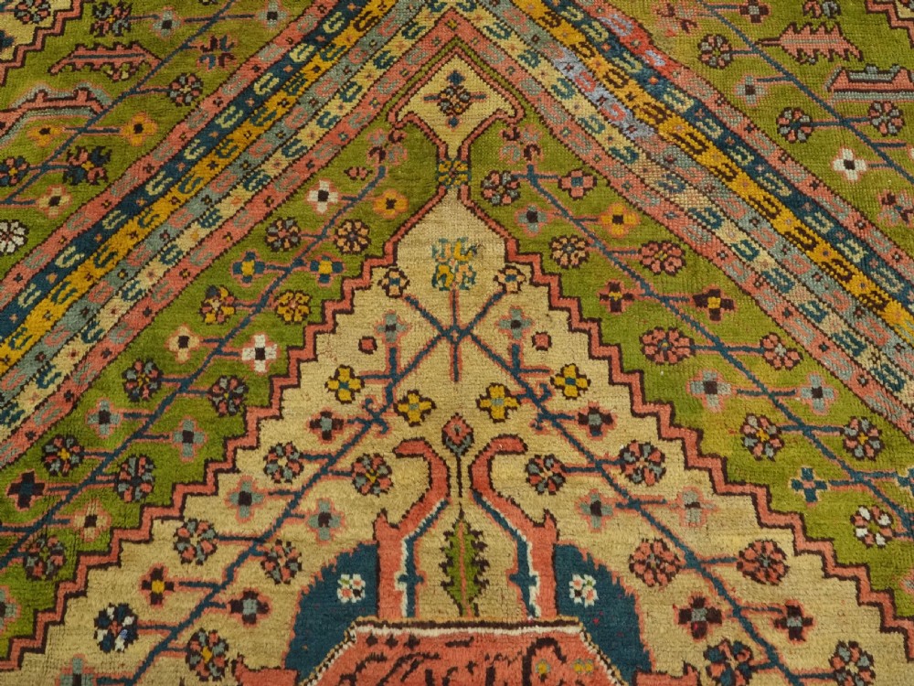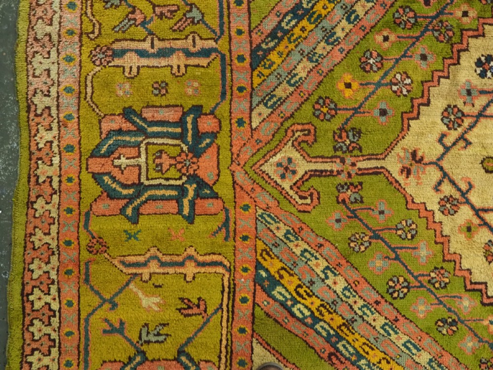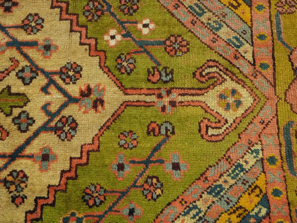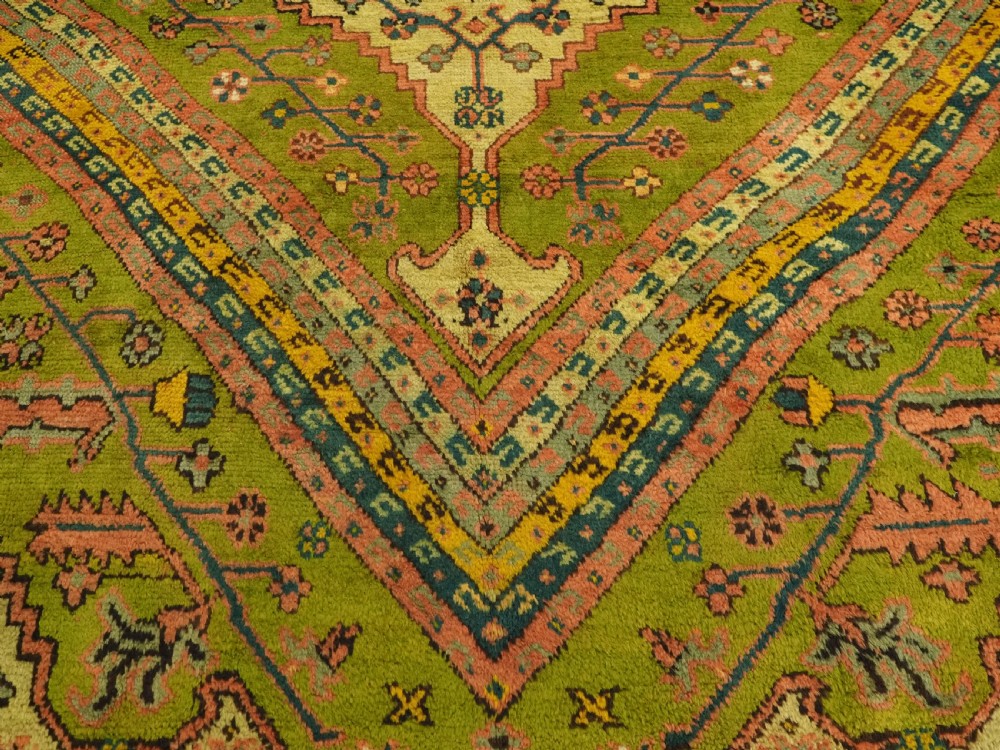 ANTIQUE TURKISH OUSHAK CARPET OF SCARCE DESIGN WITH RARE GREEN FIELD, CIRCA 1890.