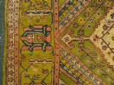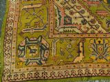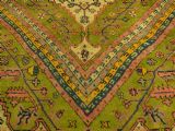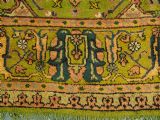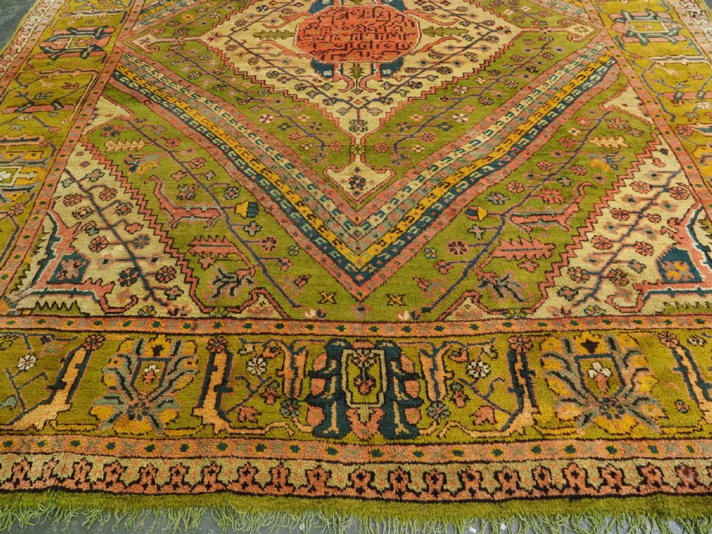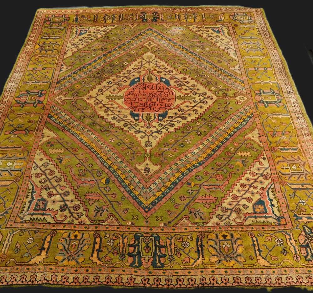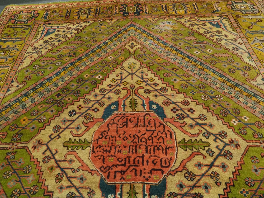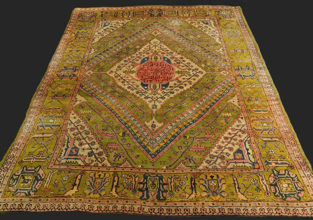 ANTIQUE TURKISH OUSHAK CARPET OF SCARCE DESIGN WITH RARE GREEN FIELD, CIRCA 1890.
