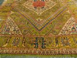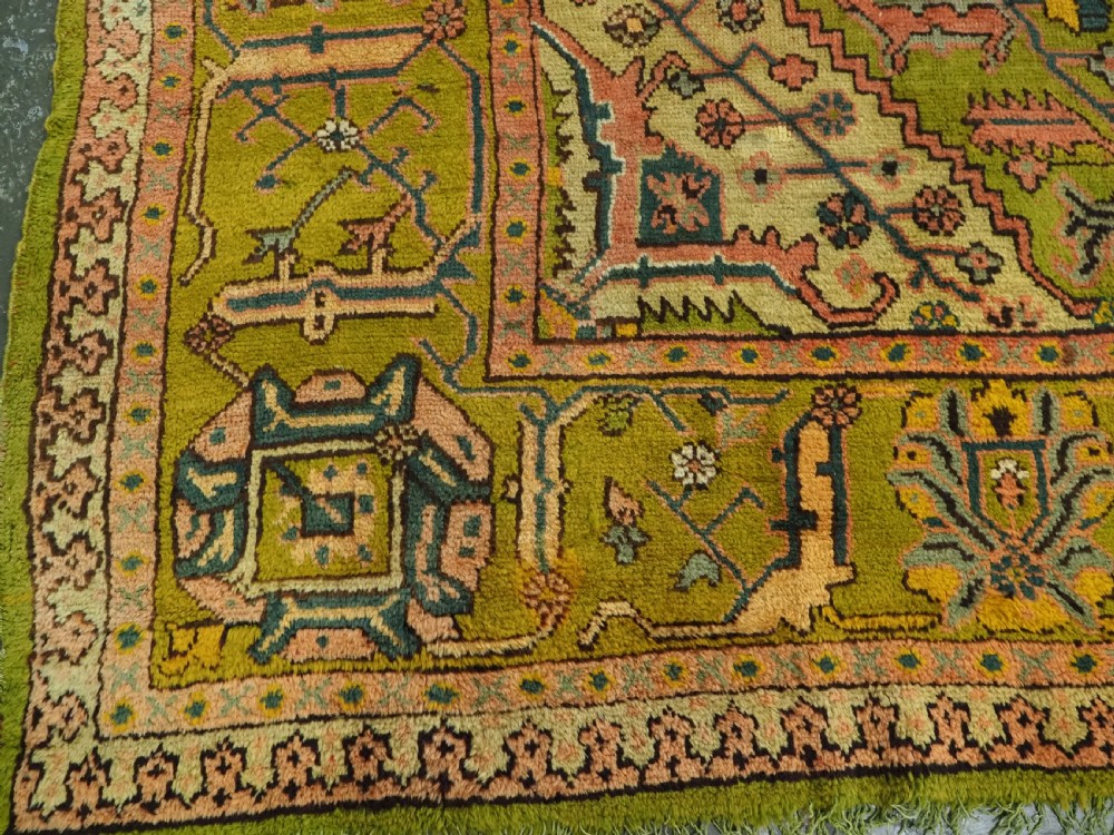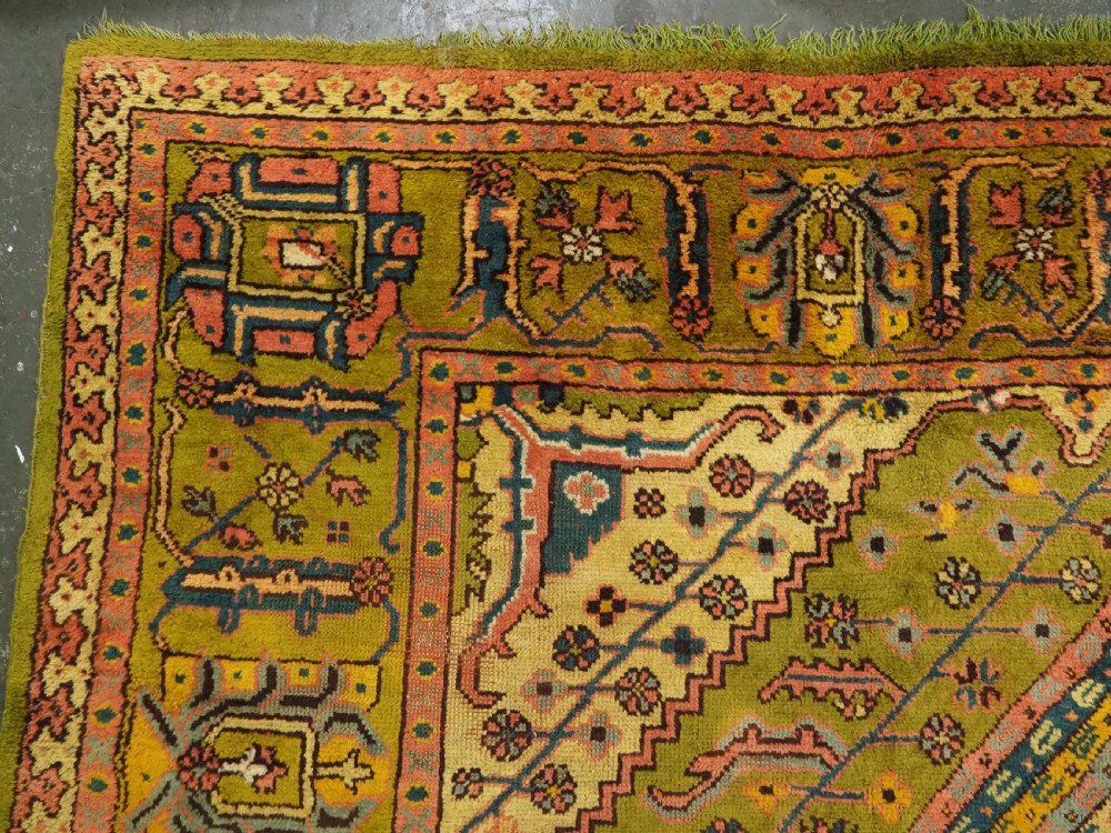 Antique Turkish Oushak carpet of rare design, the carpet has a soft colour palette, with an unusual soft green ground.