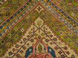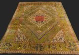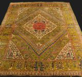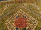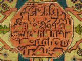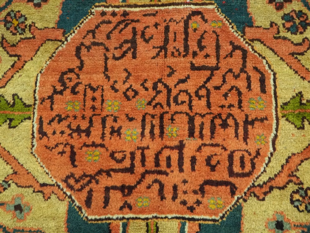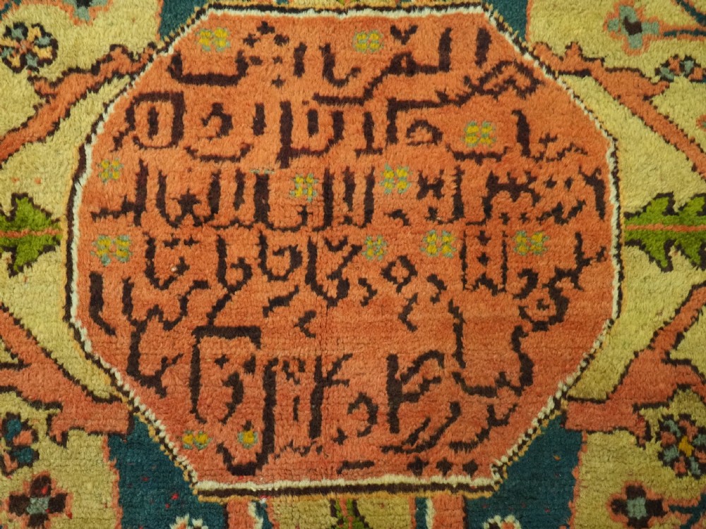 The design of this carpet is found on a small group of carpets made in the town of Joshaghan, the design is also influenced by the well know 'Mohtashem' Kashan carpets. The carpet has an inscribed panel to the center which bears the same inscription as all the other known examples; it translates as follows, 'Hasabe Farmaieshe Jenabe Mula..(in order of Mr ...most probably Mula or spritual leader .)......then many Doa (pray) for the glory and health of the him ....later Sale (year of ) 1304..... 1886'. It is thought that these carpets were woven for use in a mosque.