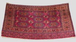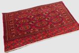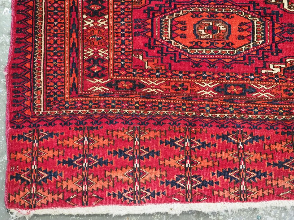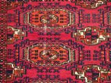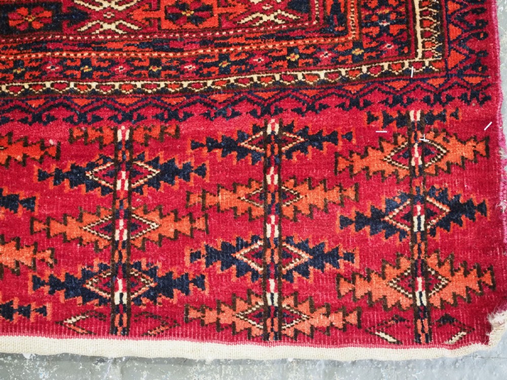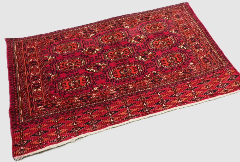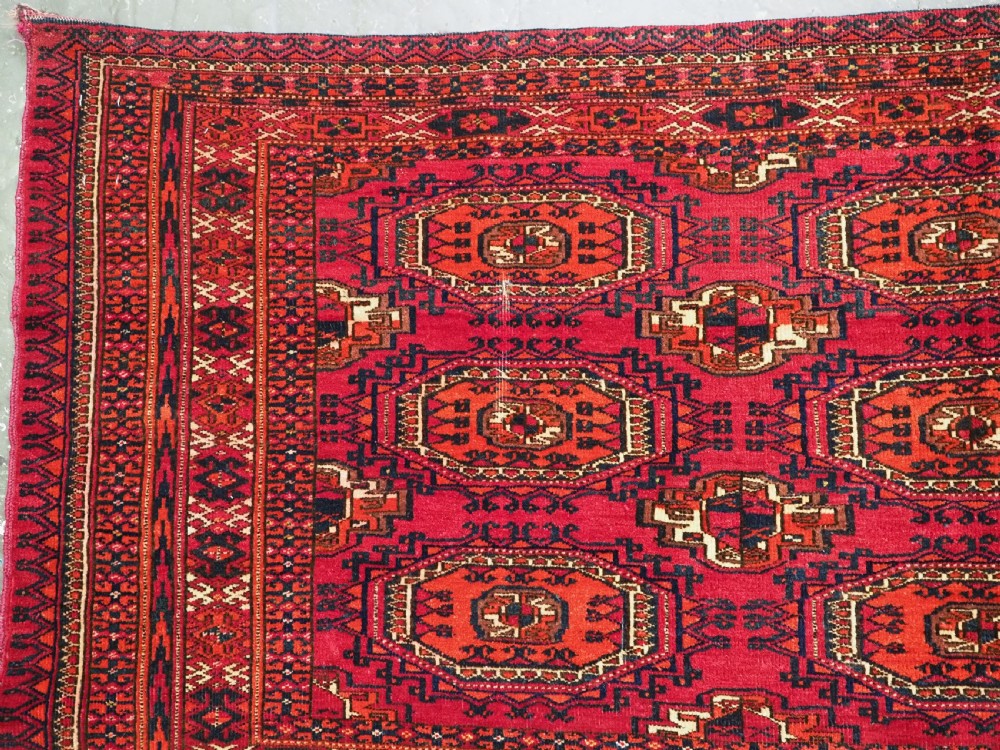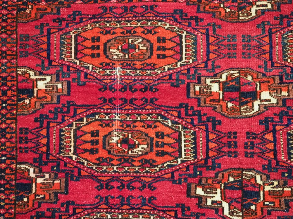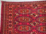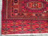 Size: 5ft 3in x 3ft 1in (160 x 94cm). Antique Tekke Turkmen chuval with nine 'Salor' turreted guls. Circa 1900. Chuval are storage bags used by the Turkmen nomads for the storage of personal items inside the yurt and also for the transport of goods on the backs of camels or horses. They were often woven in pairs. The chuval face is well drawn and has good clear colours, note the decorative elem panel at the lower end. Good condition with even wear, there are a few spots of slightly heavier wear that can be seen in the images, this is reflected in the price. The plain weave back has been removed at some time in the chuvals history. Stock Number: C-09. All of our prices include FREE WORLD WIDE EXPRESS DELIVERY by DHL. To purchase any item please click on the payment link. We are also happy to accept most payment methods including American Express, bank transfers, debit & credit cards. To purchase by card over the telephone, please contact us on 01608 652111 or 0044 1608 652111 from outside the UK. Internal Ref: C-09