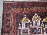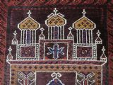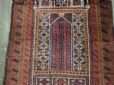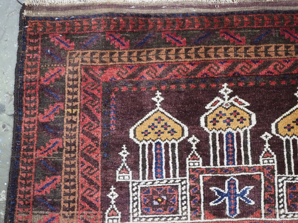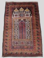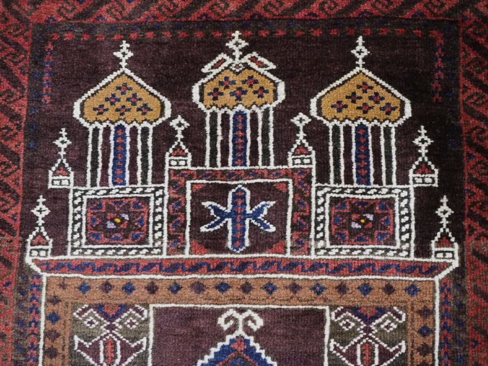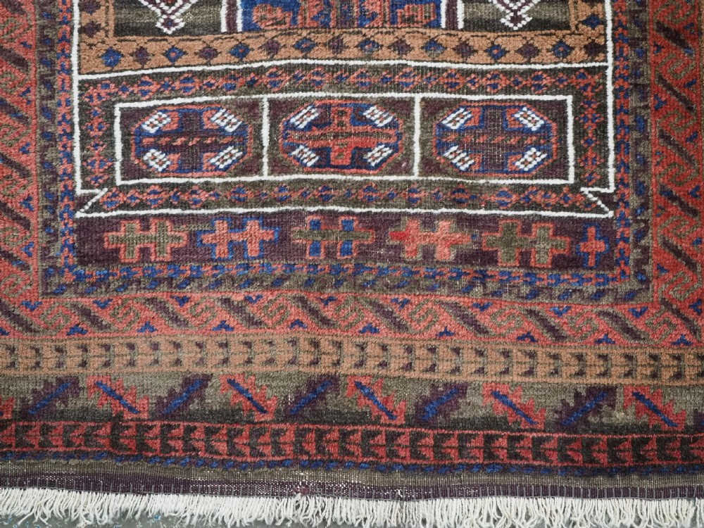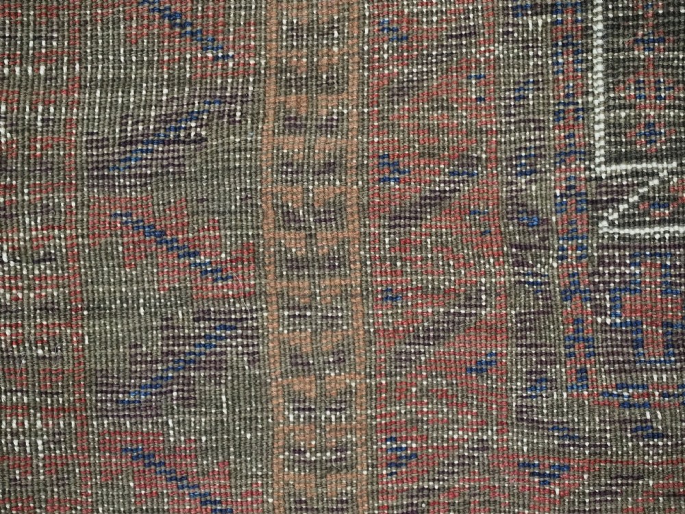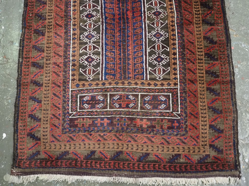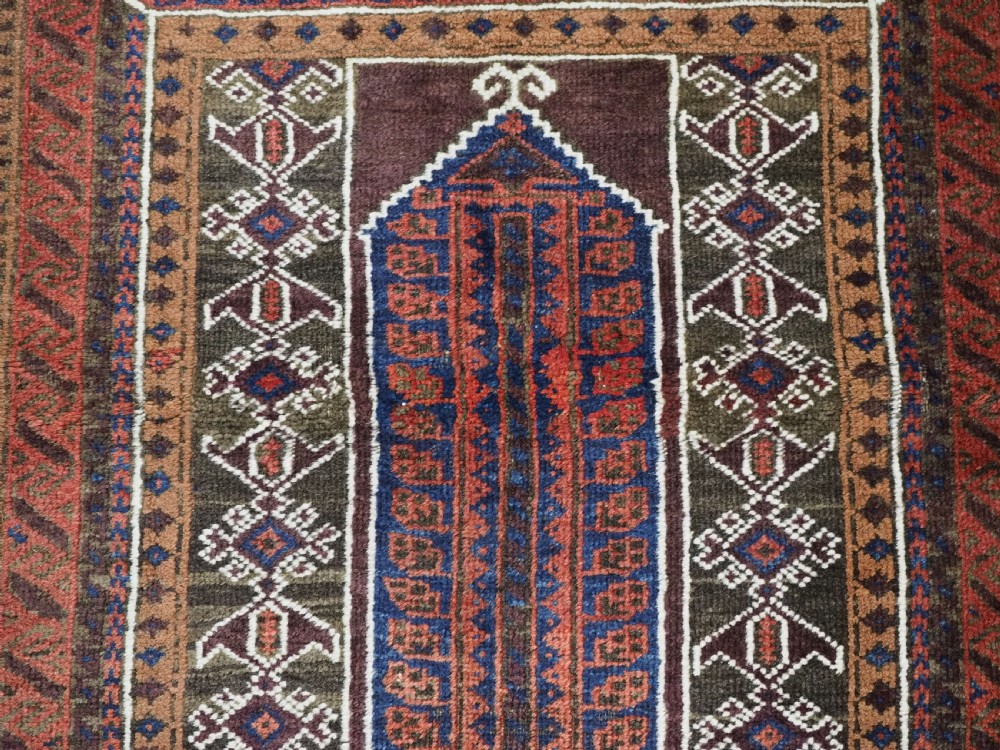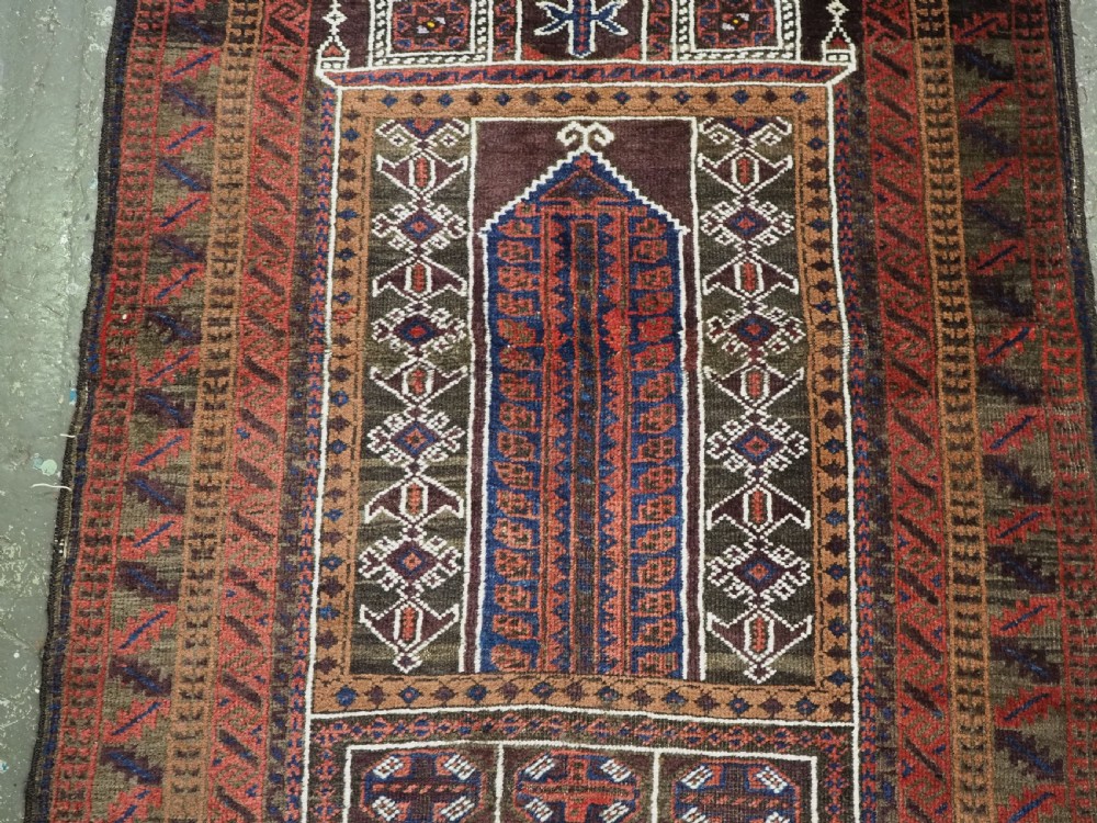 Size: 4ft 6in x 2ft 10in (138 x 87cm). Antique Afghan Taimani Sistan Baluch 'Seh (Three) Mihrab' prayer rug. Circa 1900. This is a pleasing example of a seh-mihrab (three mihrab) prayer rug by the Taimani Baluch, the rug is well drawn and has an 'earthy' colour palette. The Taimani Baluch were semi nomadic in the Sistan Provence of Western Afghanistan, this design of prayer rug is unique to them. The rug is in good condition with even wear, and medium pile. The rug is suitable for light domestic use. Stock Number: C-10. All of our prices include FREE WORLD WIDE EXPRESS DELIVERY by DHL. To purchase any item please click on the payment link. We are also happy to accept most payment methods including American Express, bank transfers, debit & credit cards. To purchase by card over the telephone, please contact us on 01608 652111 or 0044 1608 652111 from outside the UK. Internal Ref: C-10