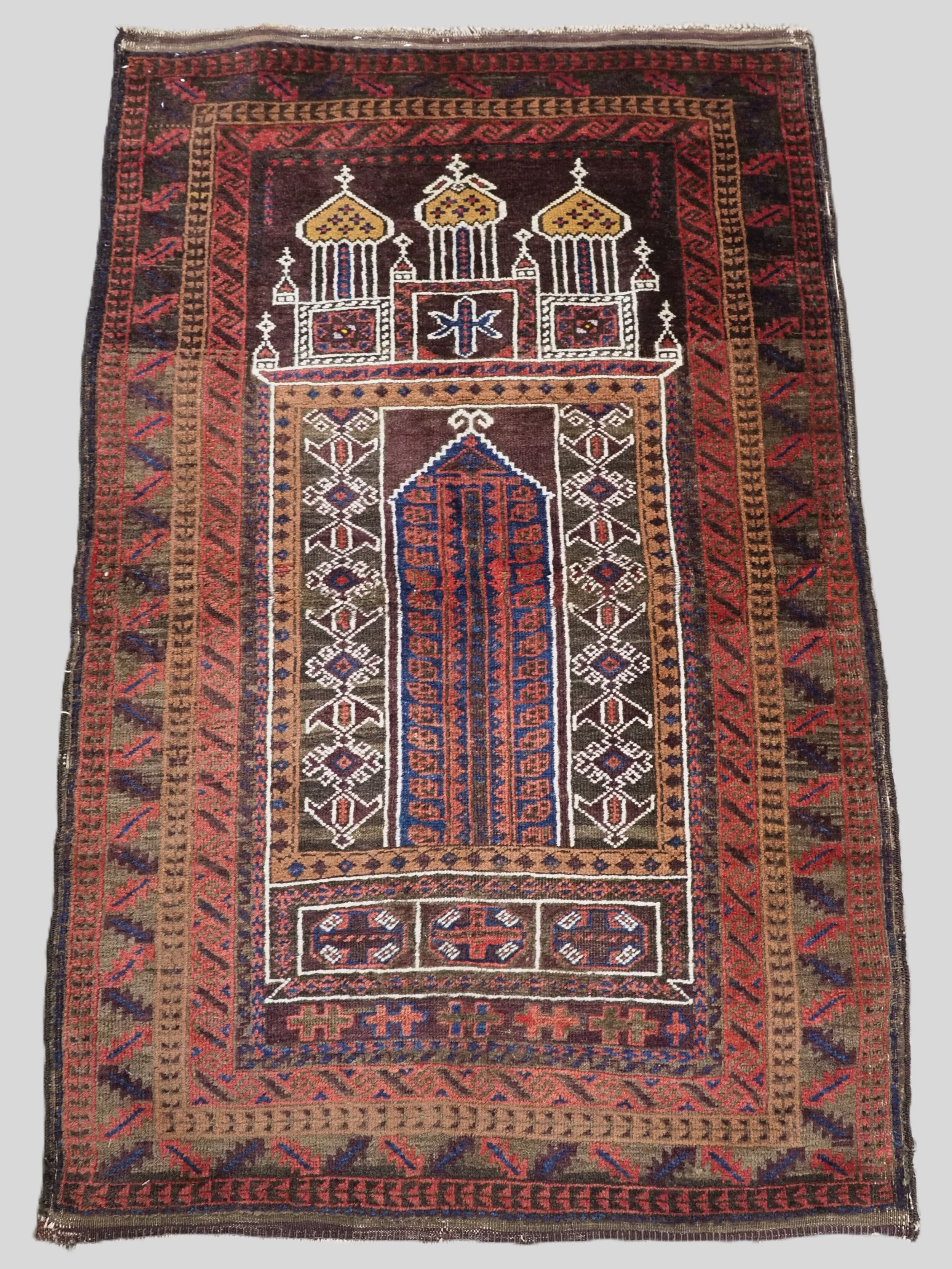 ANTIQUE AFGHAN SISTAN BALUCH 'SEH' MIHRAB PRAYER RUG, CIRCA 1900.
