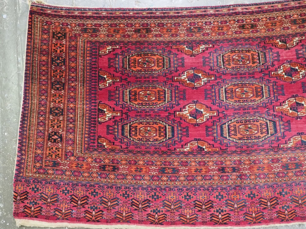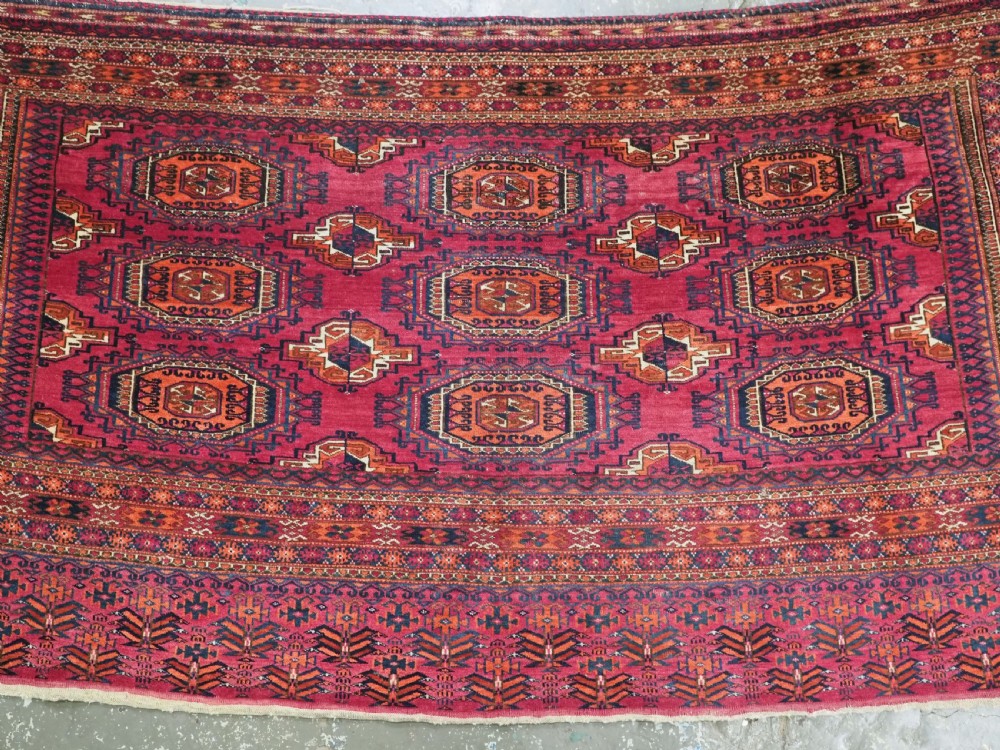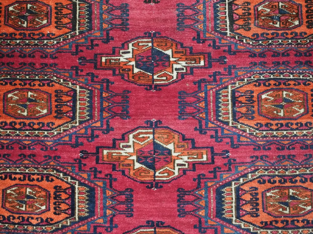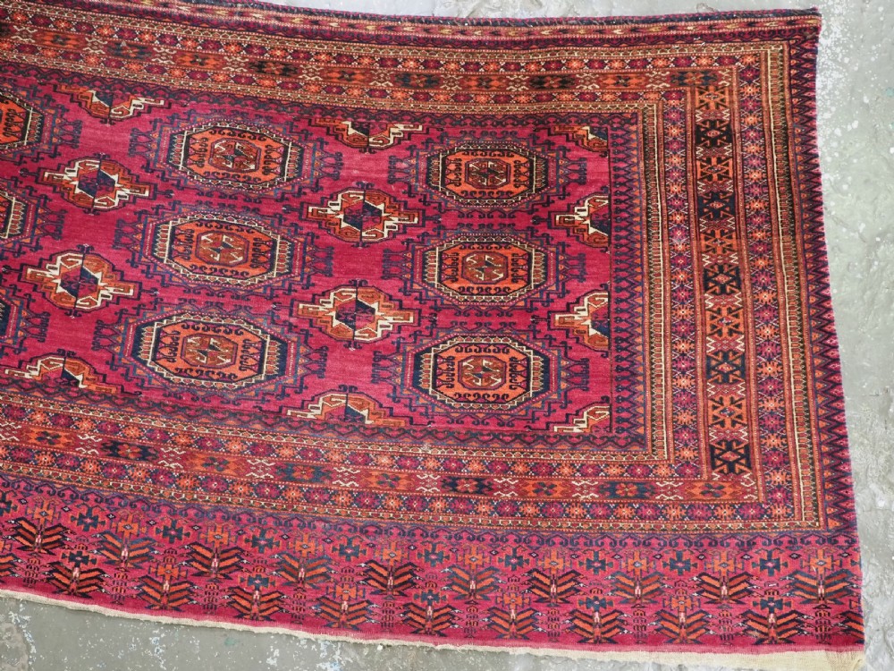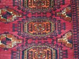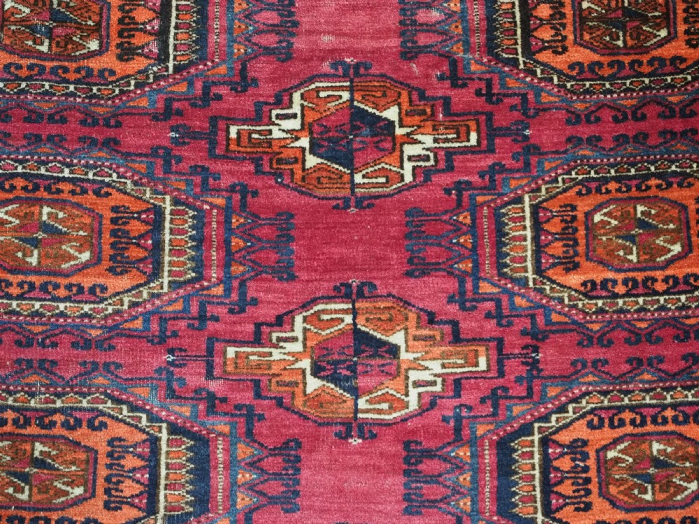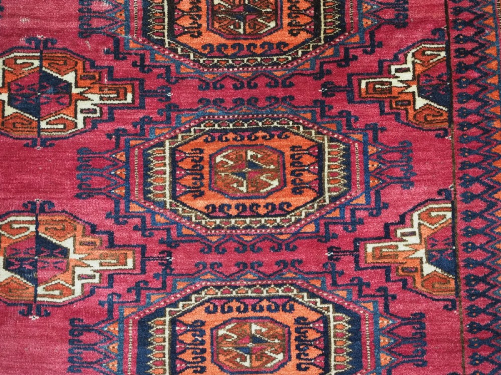 Size: 5ft 5in x 2ft 8in (164 x 81cm). Antique Tekke Turkmen chuval with nine 'Salor' turreted guls. Circa 1900. Chuval are storage bags used by the Turkmen nomads for the storage of personal items inside the yurt and also for the transport of goods on the backs of camels or horses. They were often woven in pairs. The chuval face is well drawn and has good clear colours, note the decorative elem panel at the lower end. Good condition with even wear, there are a few spots of slightly heavier wear that can be seen in the images, this is reflected in the price. The plain weave back is still attached. Stock Number: C-13. All of our prices include FREE WORLD WIDE EXPRESS DELIVERY by DHL. To purchase any item please click on the payment link. We are also happy to accept most payment methods including American Express, bank transfers, debit & credit cards. To purchase by card over the telephone, please contact us on 01608 652111 or 0044 1608 652111 from outside the UK. Internal Ref: C-13
