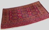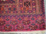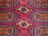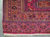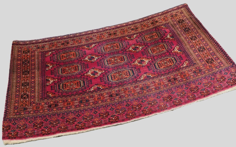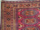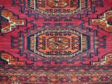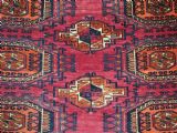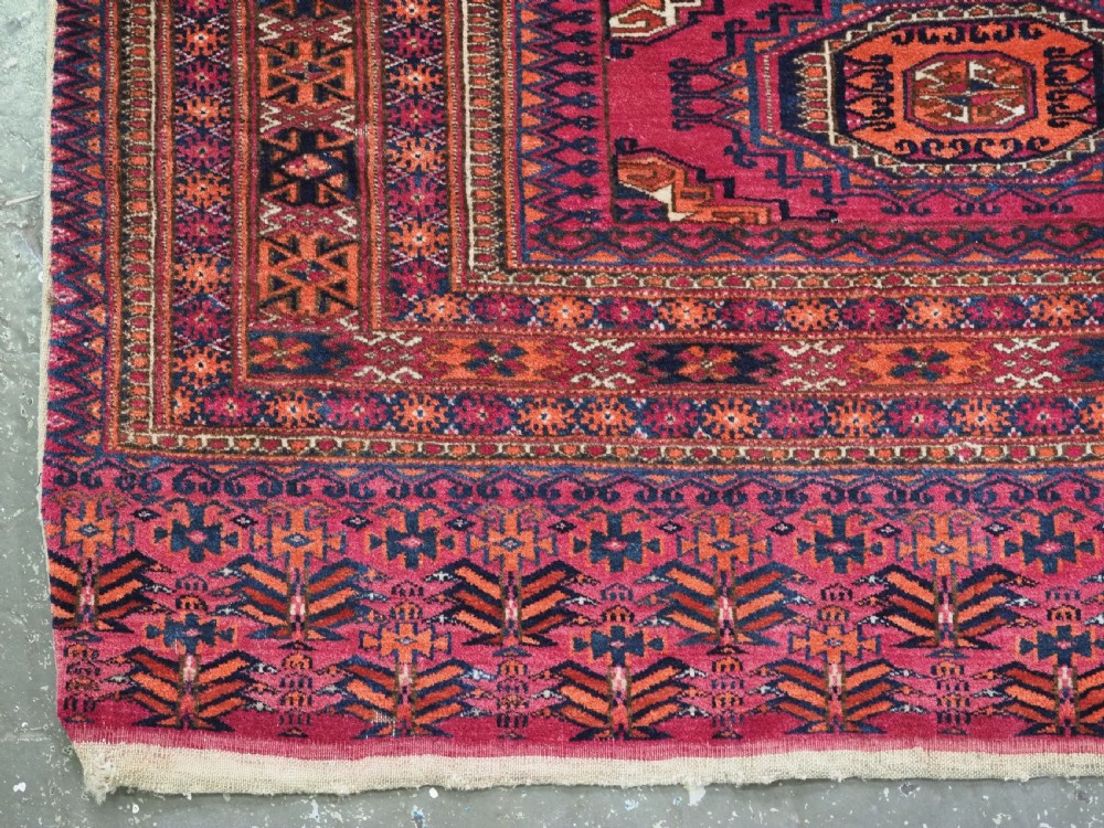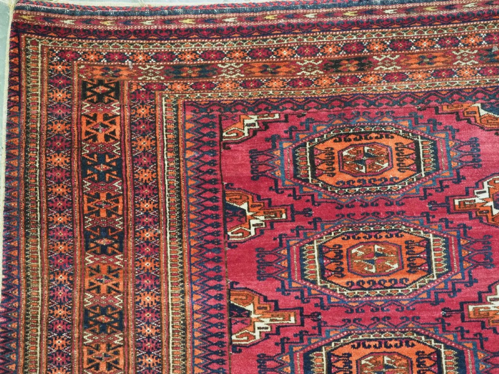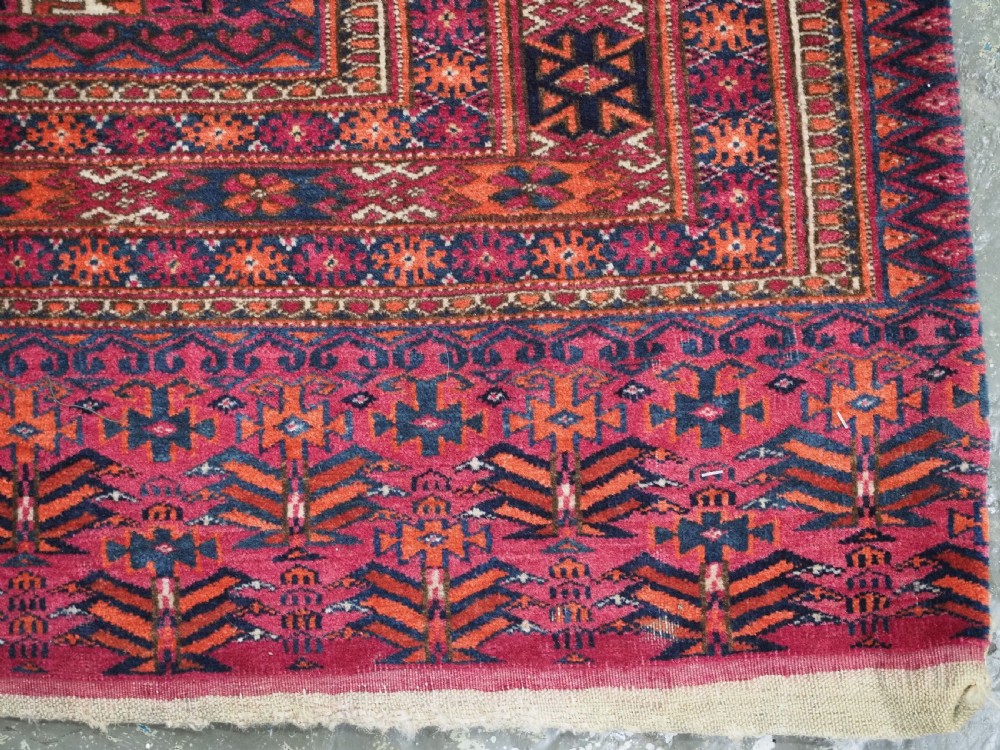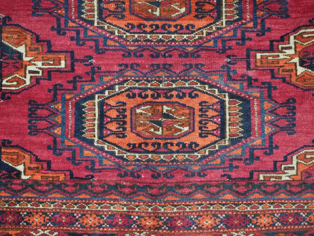 Size: 5ft 5in x 2ft 8in (164 x 81cm). Antique Tekke Turkmen chuval with nine 'Salor' turreted guls. Circa 1900. Chuval are storage bags used by the Turkmen nomads for the storage of personal items inside the yurt and also for the transport of goods on the backs of camels or horses. They were often woven in pairs. The chuval face is well drawn and has good clear colours, note the decorative elem panel at the lower end. Good condition with even wear, there are a few spots of slightly heavier wear that can be seen in the images, this is reflected in the price. The plain weave back is still attached. Stock Number: C-13. All of our prices include FREE WORLD WIDE EXPRESS DELIVERY by DHL. To purchase any item please click on the payment link. We are also happy to accept most payment methods including American Express, bank transfers, debit & credit cards. To purchase by card over the telephone, please contact us on 01608 652111 or 0044 1608 652111 from outside the UK. Internal Ref: C-13
