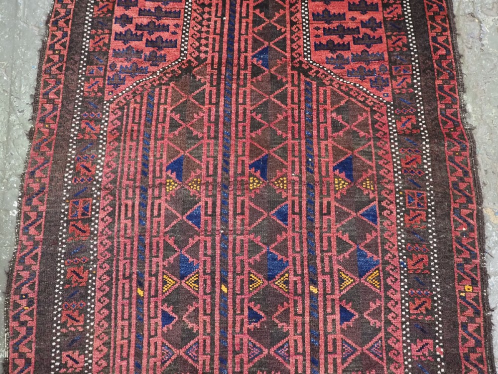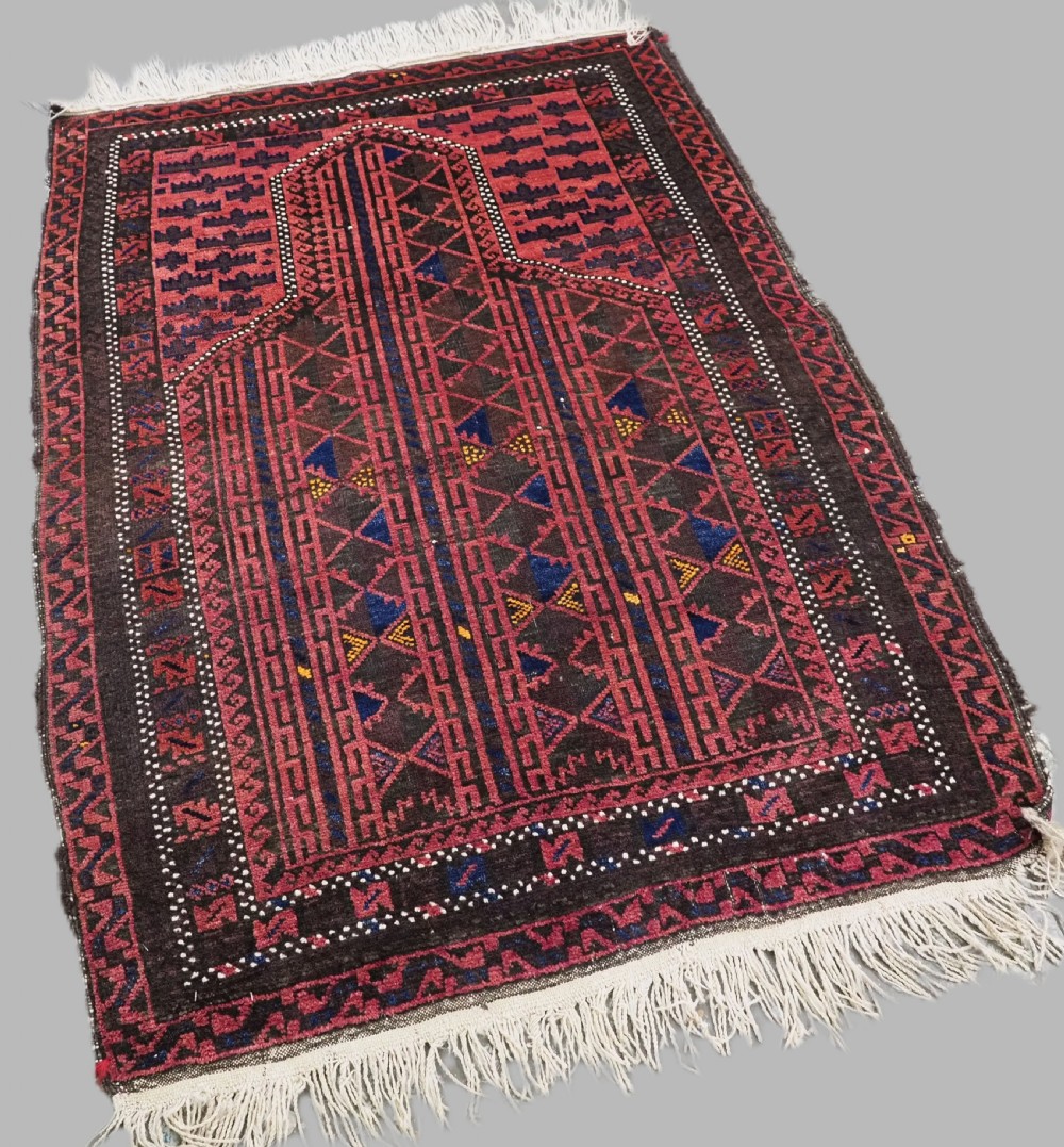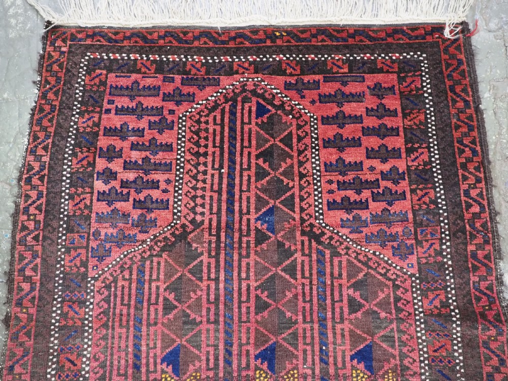 A charming small village prayer rug with a scarce design to the field and an unusual shape to the mihrab. The rug has a warm colour palette.