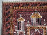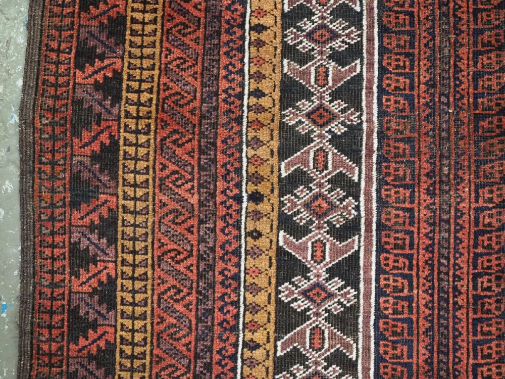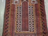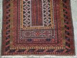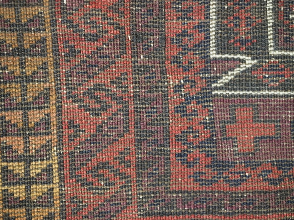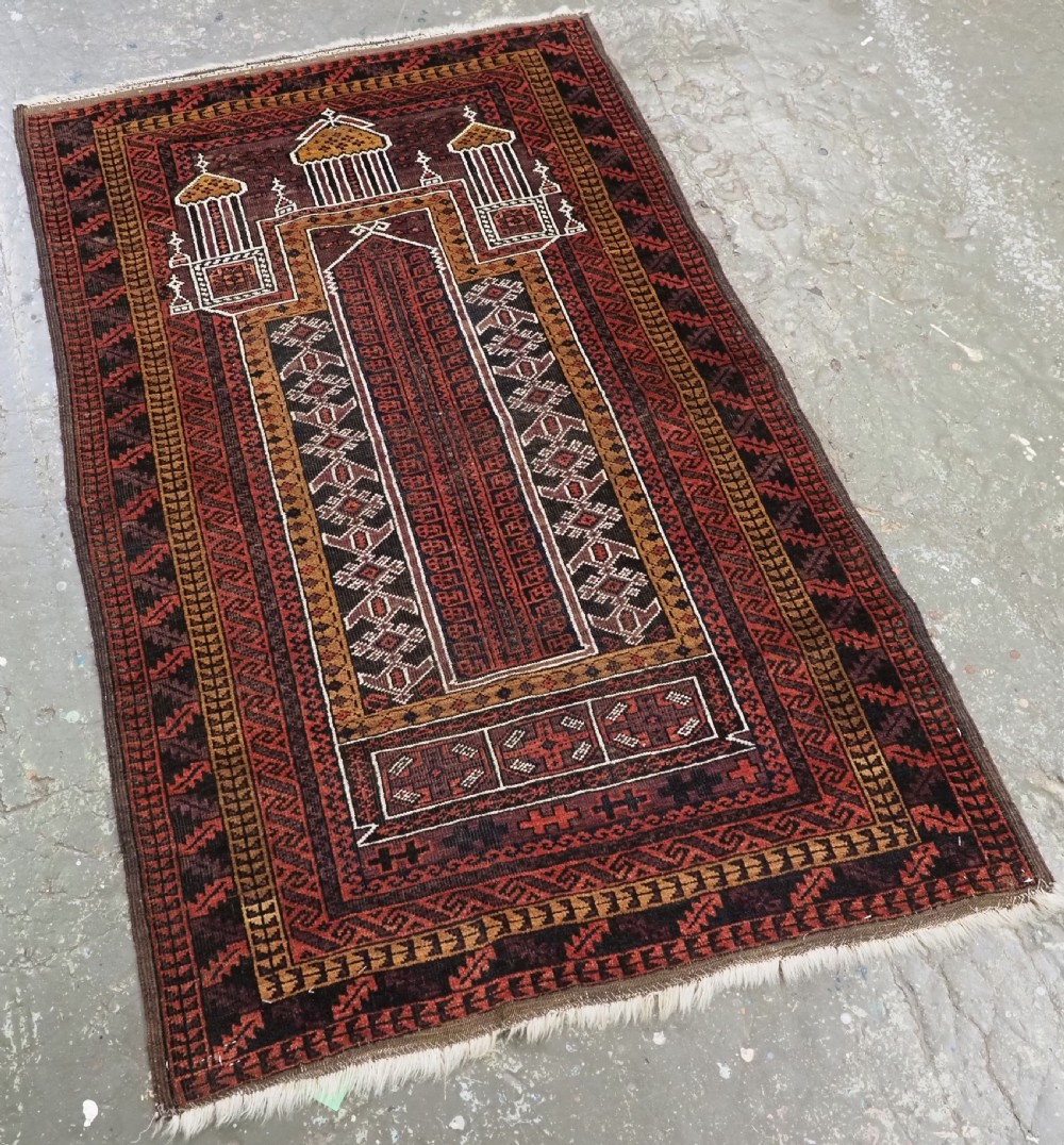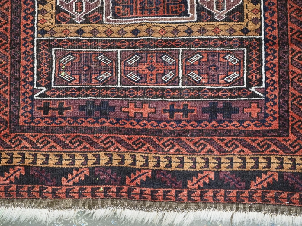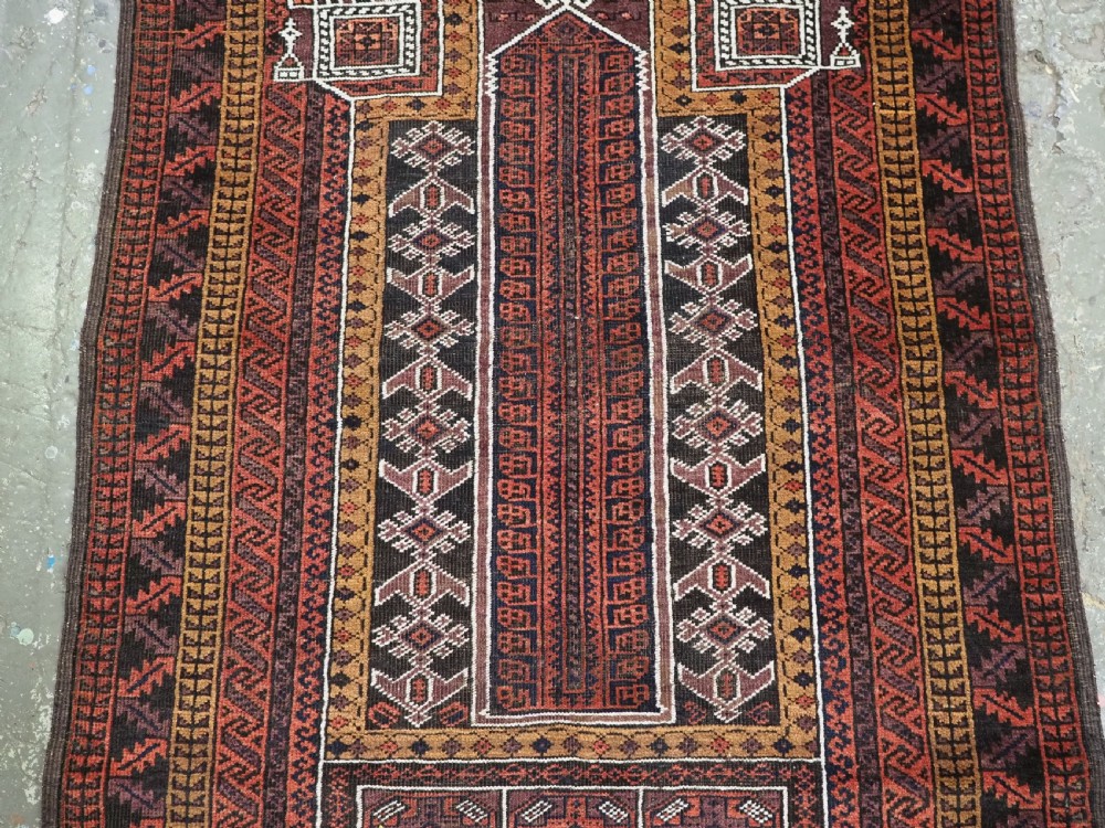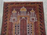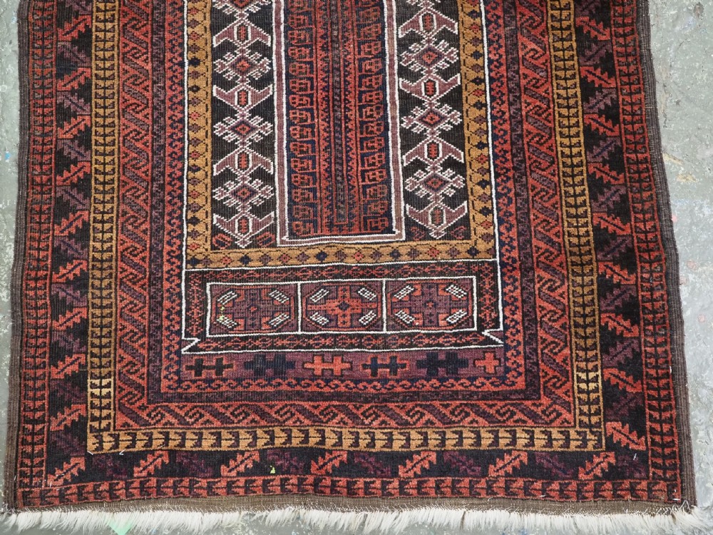 Size: 4ft 8in x 2ft 10in (141 x 86cm). Antique Afghan Taimani Sistan Baluch 'Seh (Three) Mihrab' prayer rug. Circa 1900. This is a very good example of a seh-mihrab (three mihrab) prayer rug by the Taimani Baluch, the rug is well drawn and has an excellent natural colour palette. The Taimani Baluch were semi nomadic in the Sistan Provence of Western Afghanistan, this design of prayer rug is unique to them. The rug is in good condition with even wear, and medium pile. The rug is suitable for light domestic use. Stock Number: C-31. All of our prices include FREE WORLD WIDE EXPRESS DELIVERY by DHL. To purchase any item please click on the payment link. We are also happy to accept most payment methods including American Express, bank transfers, debit & credit cards. To purchase by card over the telephone, please contact us on 01608 652111 or 0044 1608 652111 from outside the UK. Internal Ref: C-31