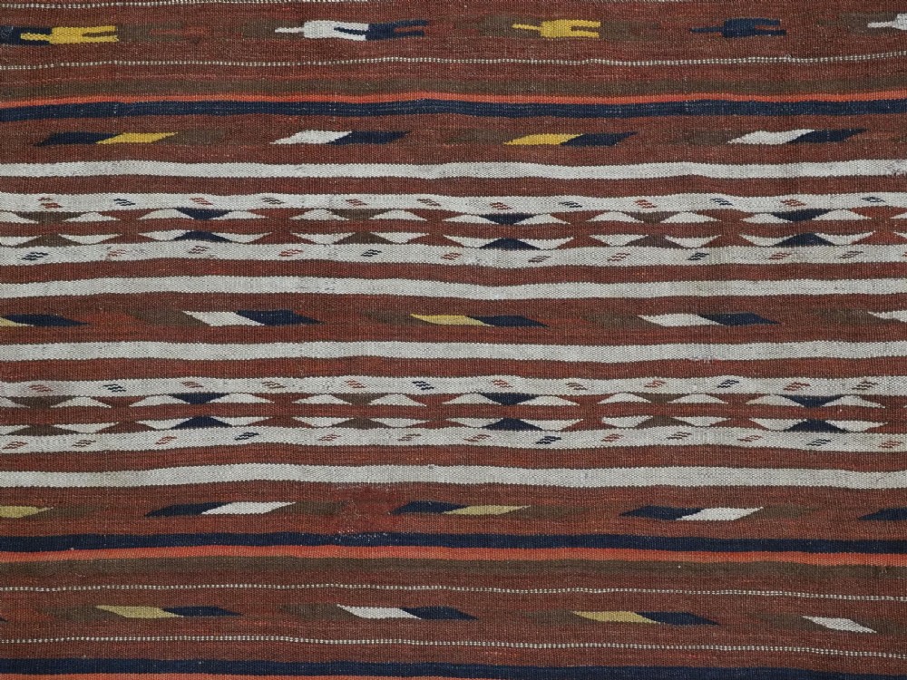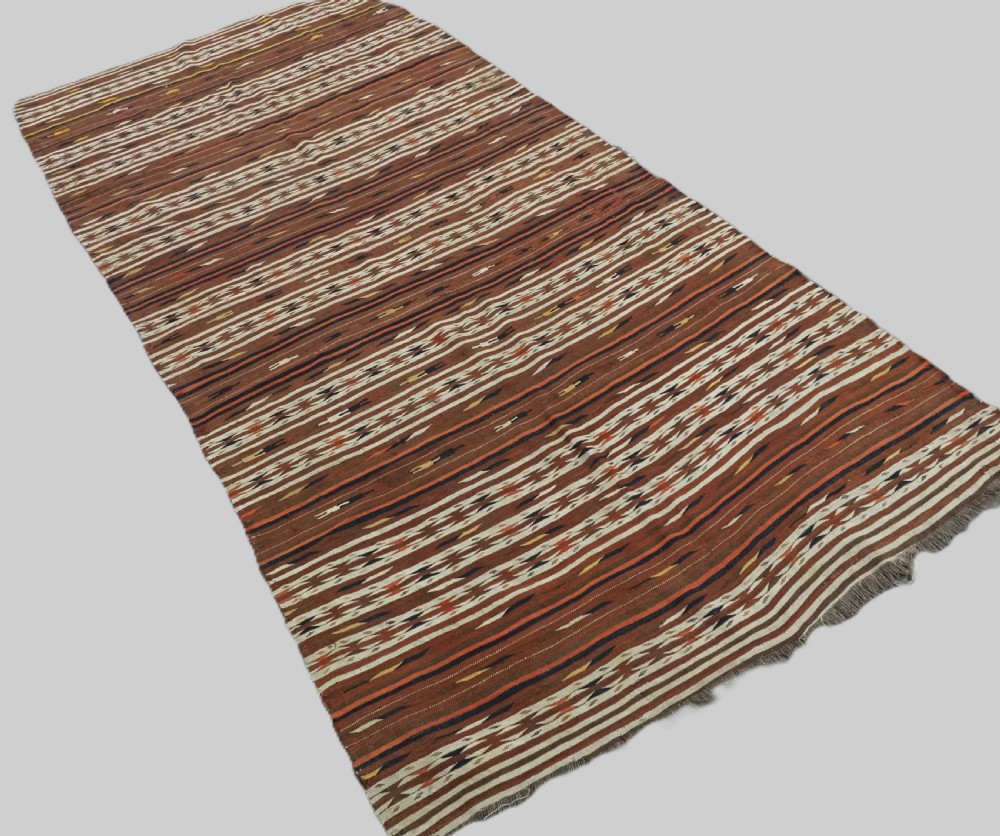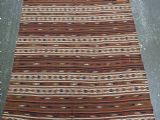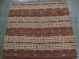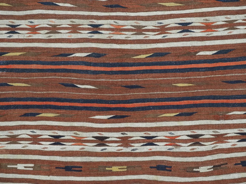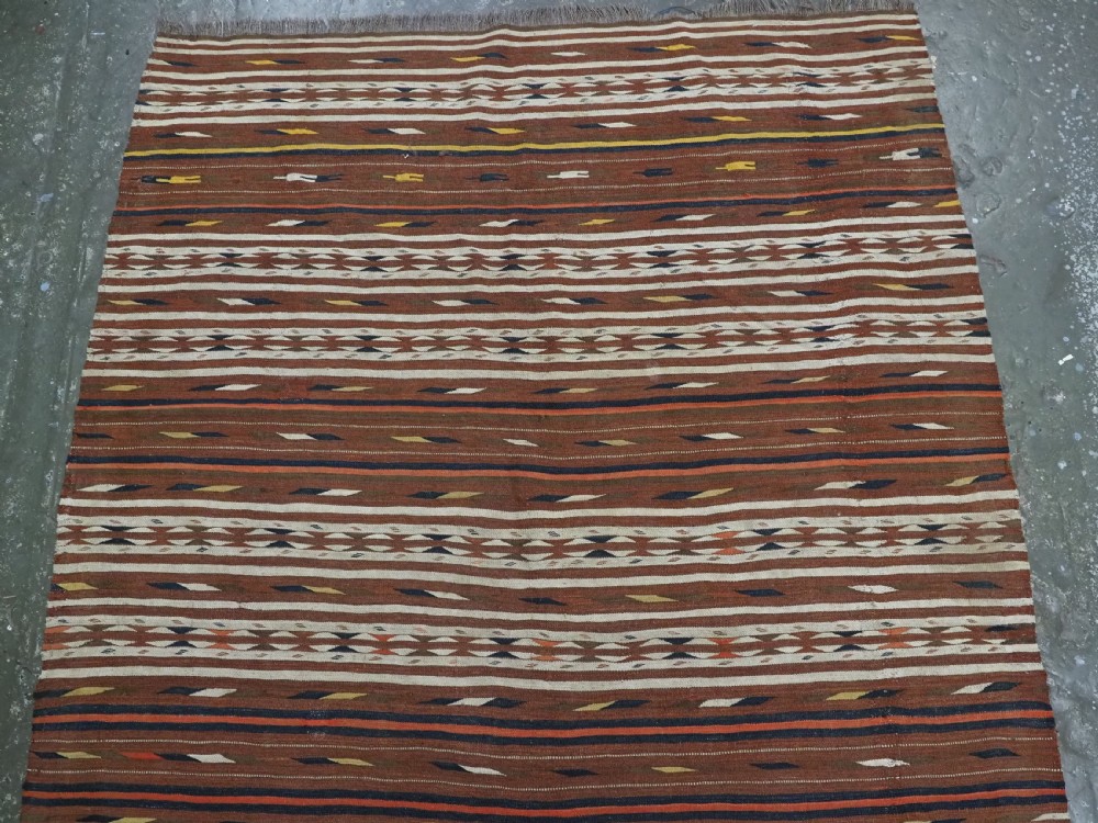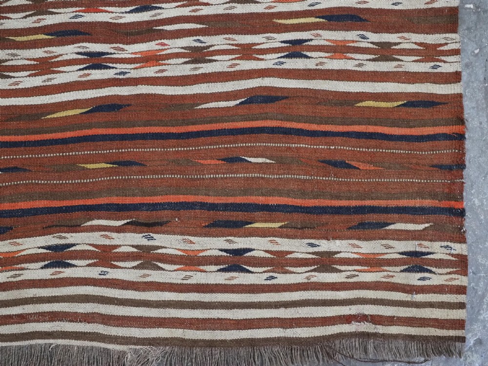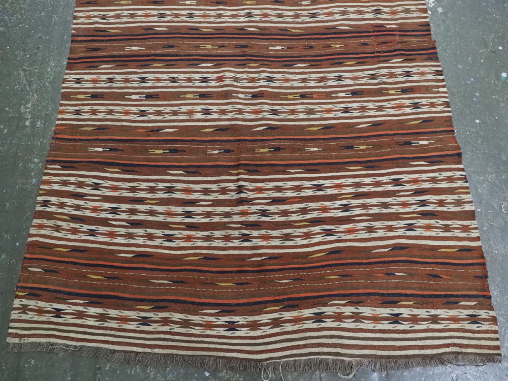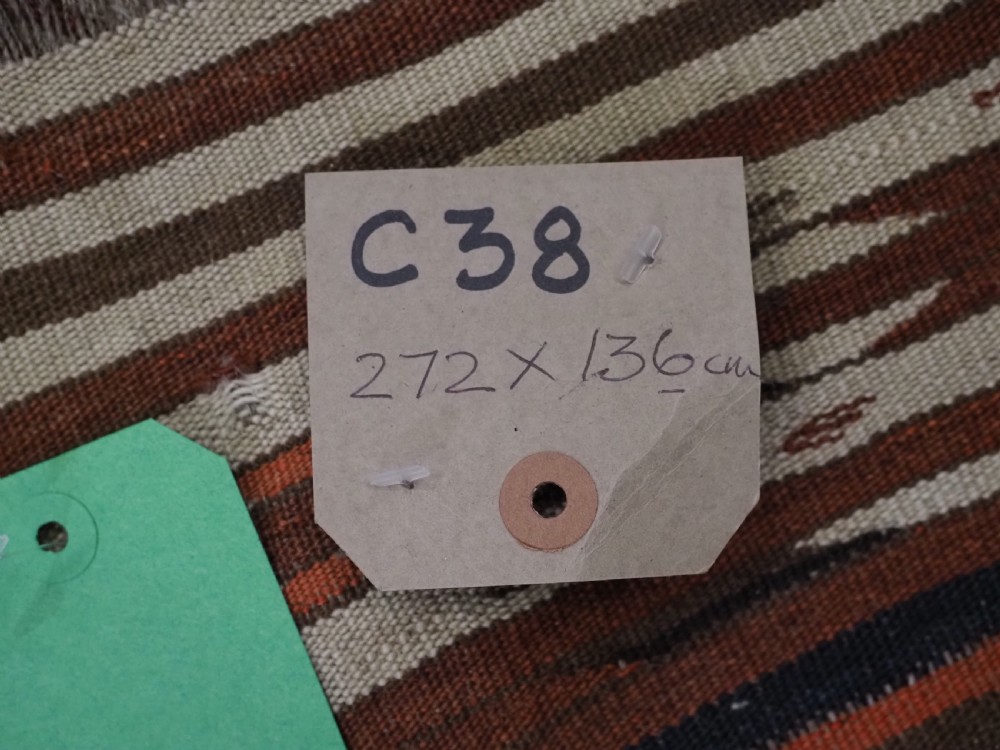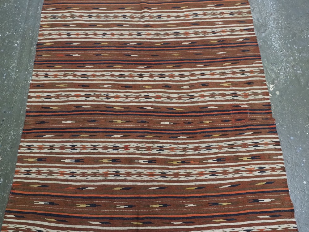 Size: 8ft 11in x 4ft 6in (272 x 136cm). Antique Turkmen 'dali' Kilim of very fine weave. Circa 1900. This is a good example of a fine Turkmen kilim, known as 'dali', this translates to fabric or cloth. Older examples such as this have very fine weave, are paper thin and have a muted soft colour palette; later examples are of coarser weave with much heavier weight and bright clear colours. Woven on a simple narrow loom, these kilims are usually narrow in width and of long length. These would make a great cover for furniture or a throw to go over a bed. Excellent condition, very slight wear. Stock Number: C-38. All of our prices include FREE WORLD WIDE EXPRESS DELIVERY by DHL. To purchase any item please click on the payment link. We are also happy to accept most payment methods including American Express, bank transfers, debit & credit cards. To purchase by card over the telephone, please contact us on 01608 652111 or 0044 1608 652111 from outside the UK. Internal Ref: C-38