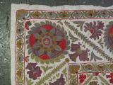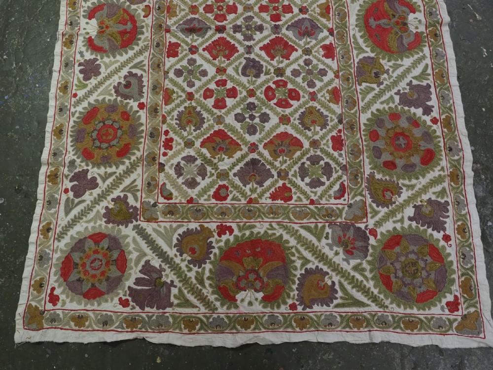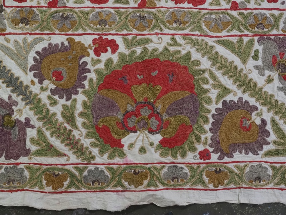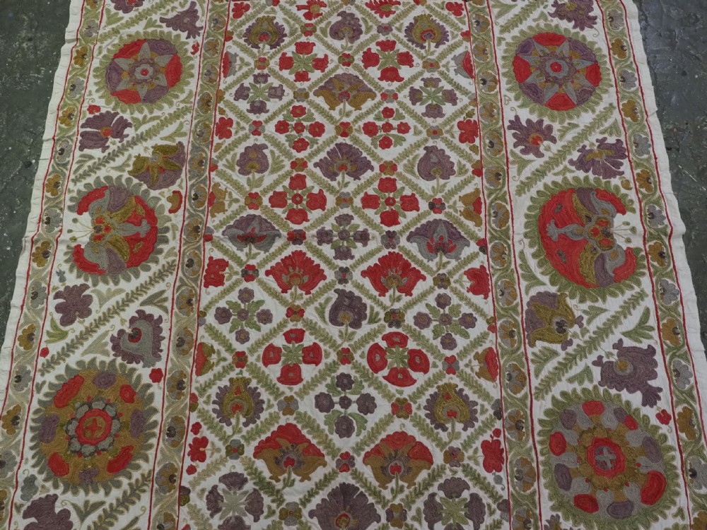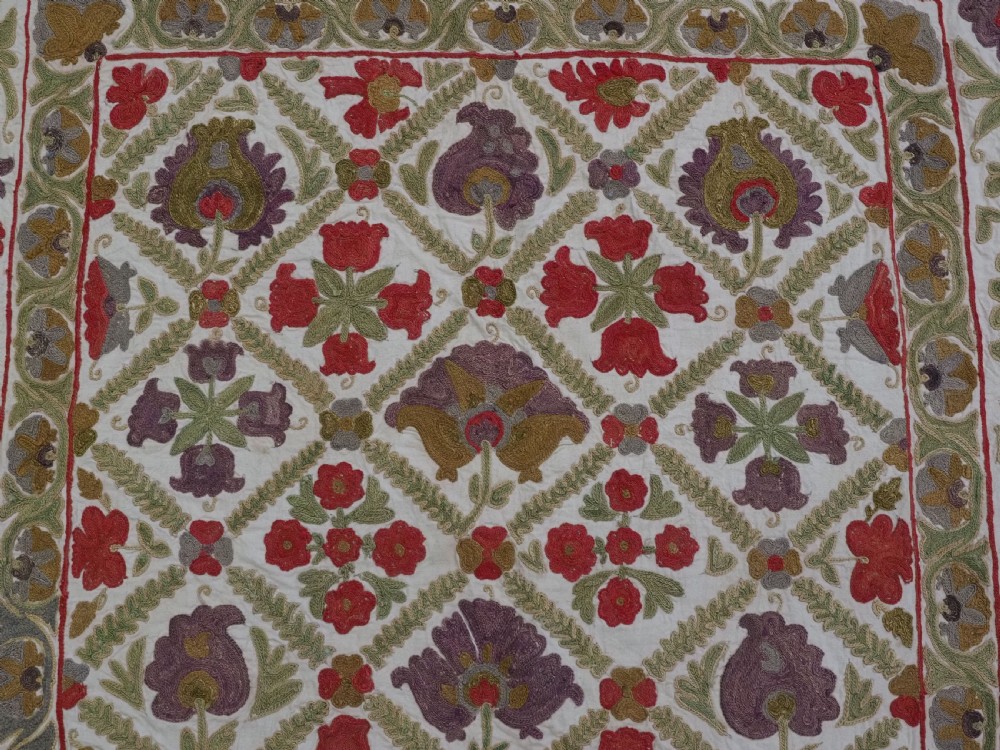 Size: 7ft 0in x 4ft 9in (214 x 146cm). Vintage Uzbek Bukhara region suzani. Circa 1930 Suzani are silk embroideries that have been woven in Uzbekistan for many hundreds of years, they are treasured family items woven by the ladies of a family usually to celebrate a wedding. They are then used to decorate the inside of the Yurt. They are embroidered in silk on strips of cotton which are then joined together to make the complete item. The suzani is then backed with fine cotton to give it strength and body. This example is probably from Bukhara and it features a floral lattice design to the field with a border of large solar discs. The suzani is embroidered in silk twist work on a ivory hand woven cotton ground. The condition is excellent with only very slight wear, the suzani is not backed. The suzani is ready for display or it could be used as a bed cover or would make a great wall hanging. Ref: T-901. All of our prices include FREE WORLD WIDE EXPRESS DELIVERY by DHL. To purchase any item please click on the payment link. We are also happy to accept most payment methods including American Express, bank transfers, debit & credit cards. To purchase by card over the telephone, please contact us on 01608 652111 or 0044 1608 652111 from outside the UK. Internal Ref: T-901