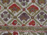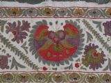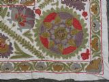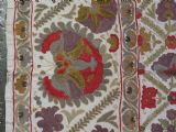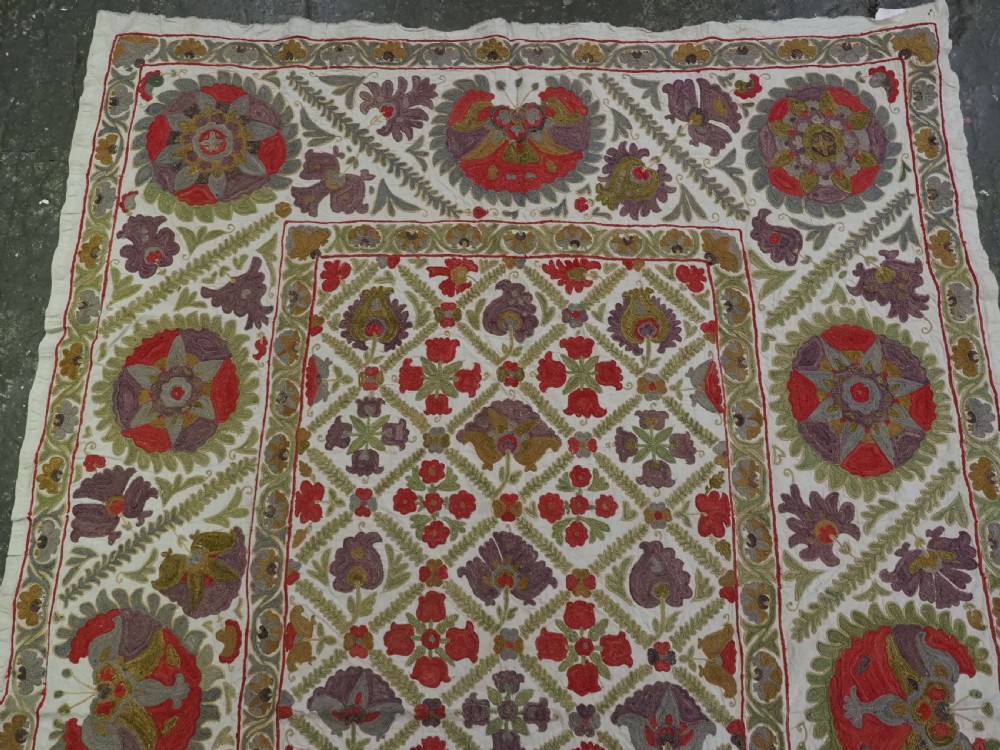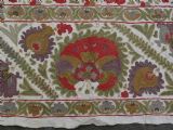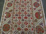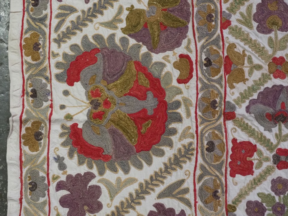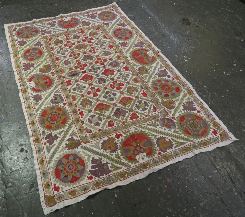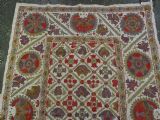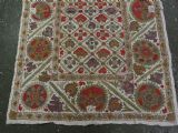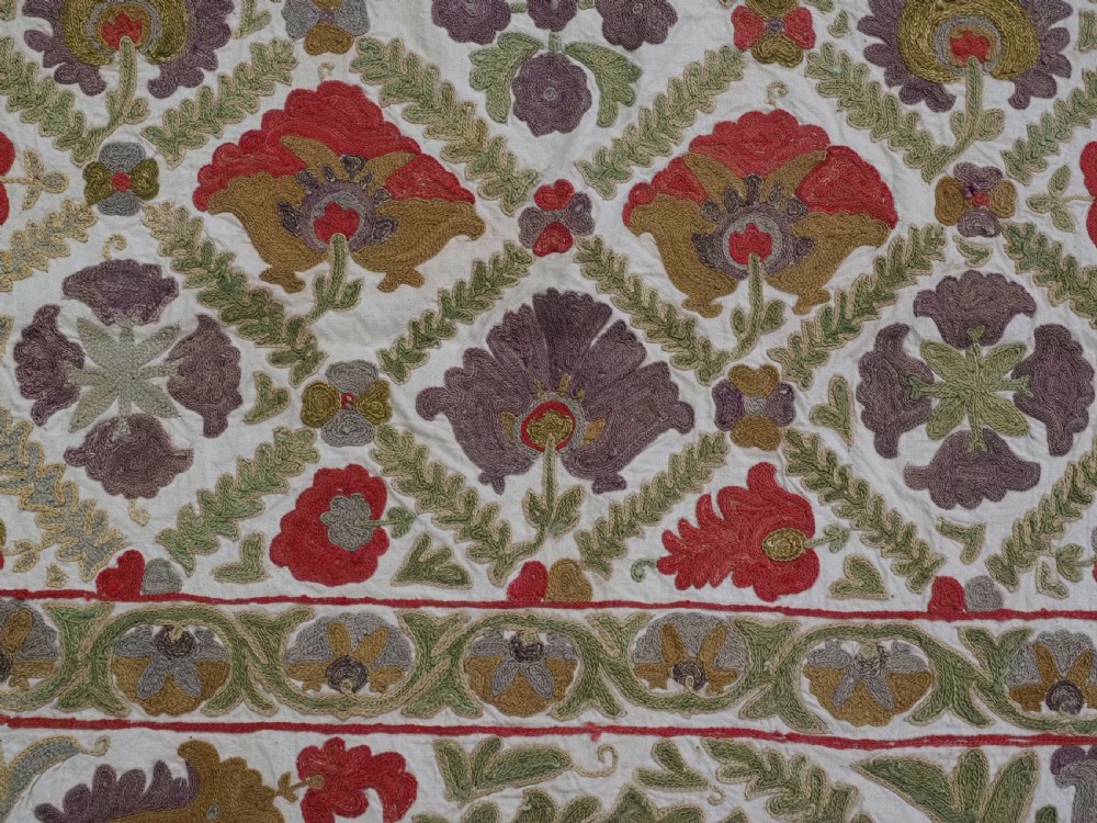Size: 7ft 0in x 4ft 9in (214 x 146cm). Vintage Uzbek Bukhara region suzani. Circa 1930 Suzani are silk embroideries that have been woven in Uzbekistan for many hundreds of years, they are treasured family items woven by the ladies of a family usually to celebrate a wedding. They are then used to decorate the inside of the Yurt. They are embroidered in silk on strips of cotton which are then joined together to make the complete item. The suzani is then backed with fine cotton to give it strength and body. This example is probably from Bukhara and it features a floral lattice design to the field with a border of large solar discs. The suzani is embroidered in silk twist work on a ivory hand woven cotton ground. The condition is excellent with only very slight wear, the suzani is not backed. The suzani is ready for display or it could be used as a bed cover or would make a great wall hanging. Ref: T-901. All of our prices include FREE WORLD WIDE EXPRESS DELIVERY by DHL. To purchase any item please click on the payment link. We are also happy to accept most payment methods including American Express, bank transfers, debit & credit cards. To purchase by card over the telephone, please contact us on 01608 652111 or 0044 1608 652111 from outside the UK. Internal Ref: T-901