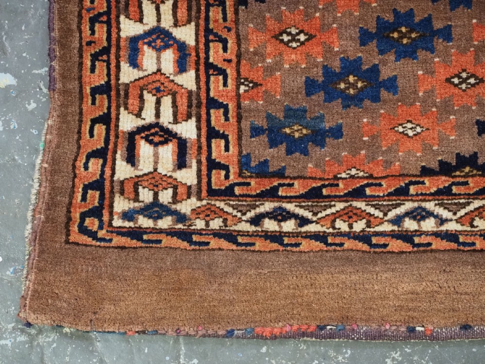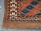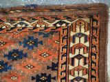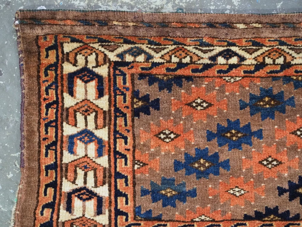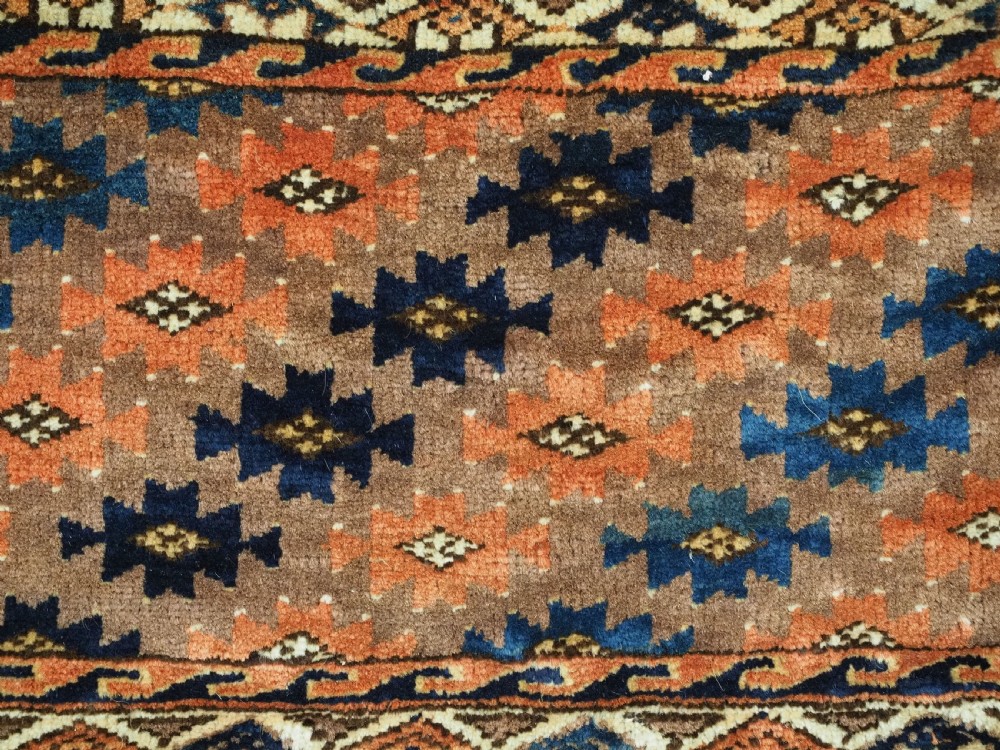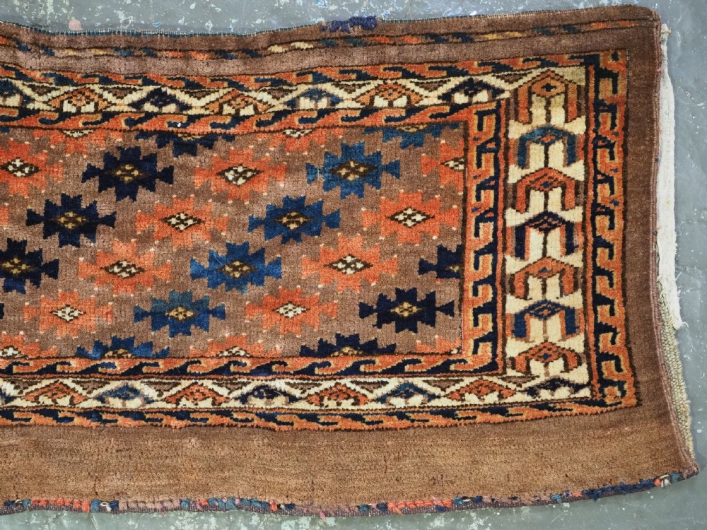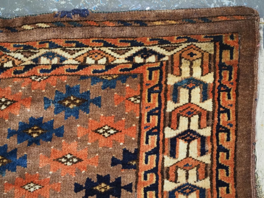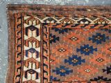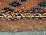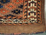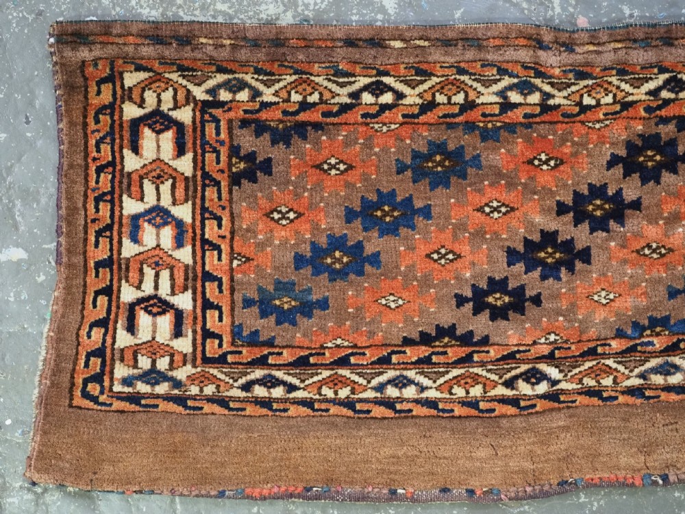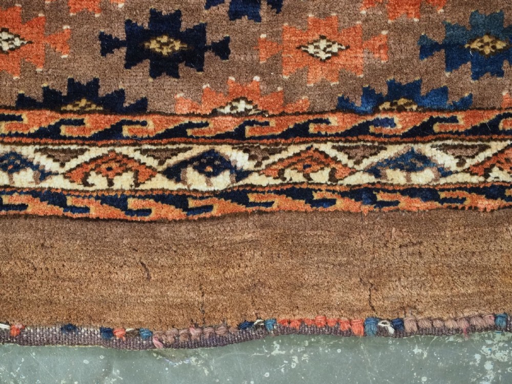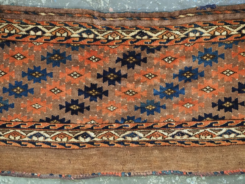 Size: 3ft 0in x 1ft 2in (92 x 35cm) face size. Antique Yomut Turkmen torba with well drawn 'ashik' gul design. Circa 1880. A good Yomut torba with a soft colour palette and good soft wool. The torba has diagonal rows of aishk guls to the face, on a soft brown ground. The torba retains its original plain weave back which has been opened for display. The torba is in excellent condition with slight wear and good pile. Stock Number: D-0076. All of our prices include FREE WORLD WIDE EXPRESS DELIVERY by DHL. To purchase any item please click on the payment link. We are also happy to accept most payment methods including American Express, bank transfers, debit & credit cards. To purchase by card over the telephone, please contact us on 01608 652111 or 0044 1608 652111 from outside the UK. Internal Ref: D-0076