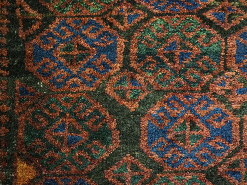This example has a repeat octagon design to the face with a decorative closing panel at the top in weft work. The original tassels are on the sides. The bag has a overall dark colour palette that shines when caught in sunlight.
