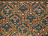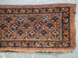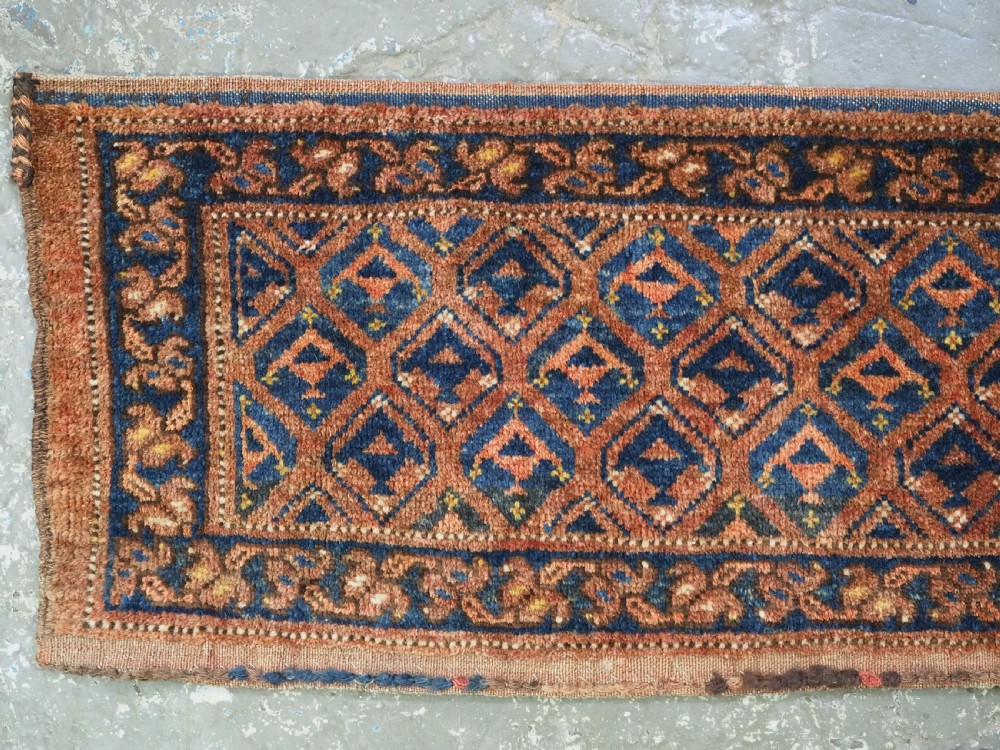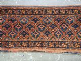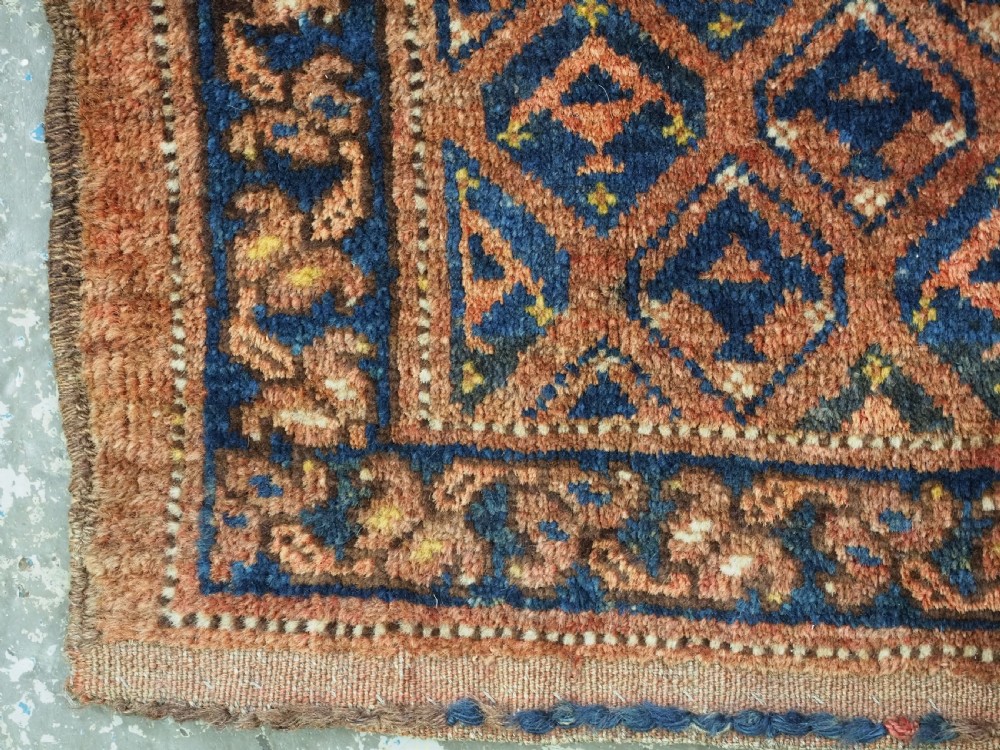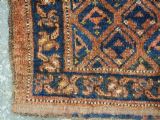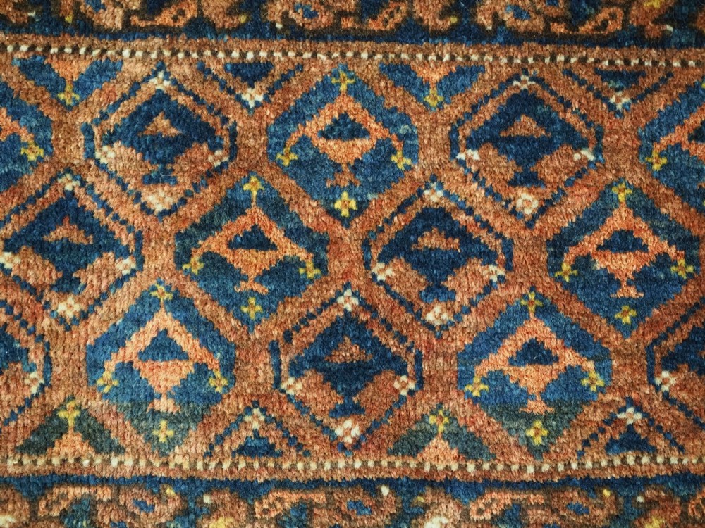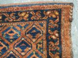 This example has a repeat shemle gul design that is also found on weavings by the Saryk Turkmen. The colour is soft earth tones with browns, blues and pink. The torba has good wool with a very soft floppy handle.