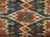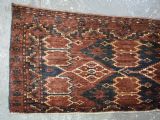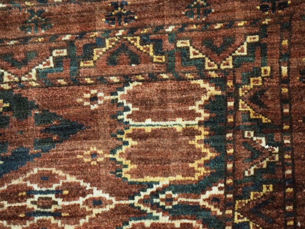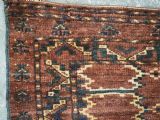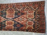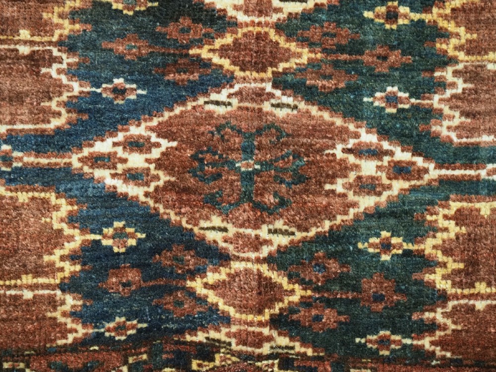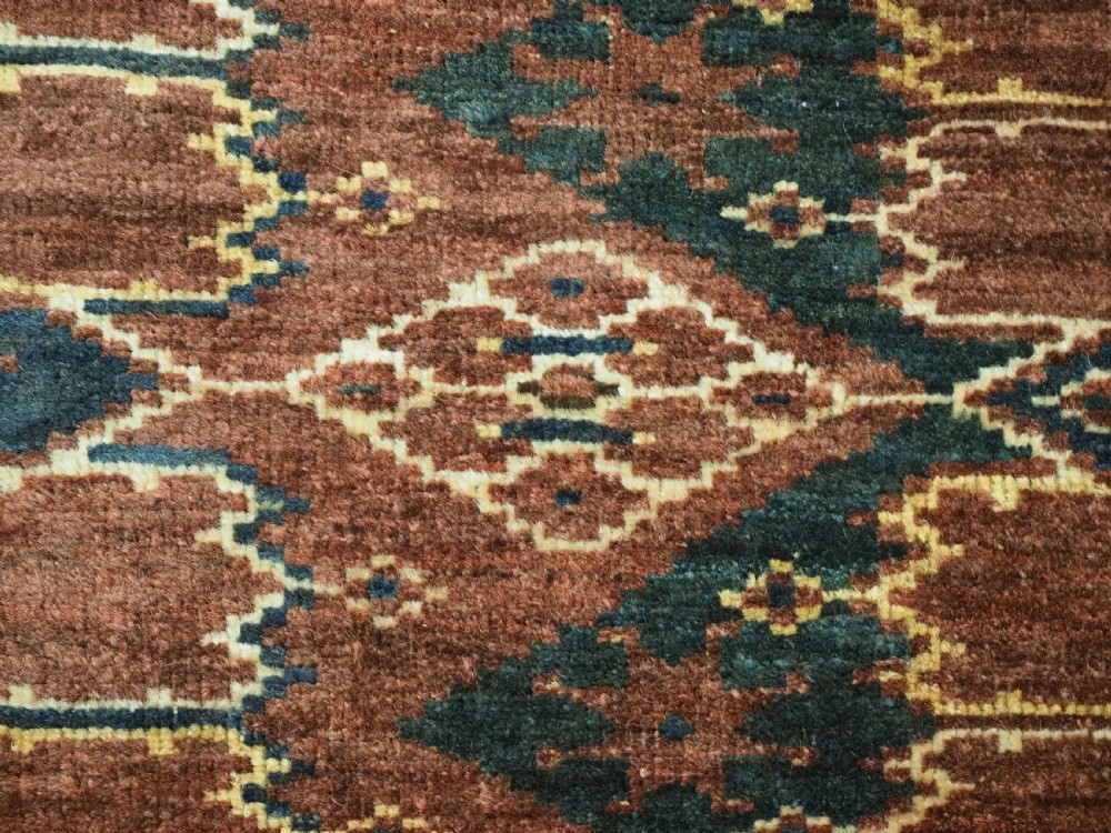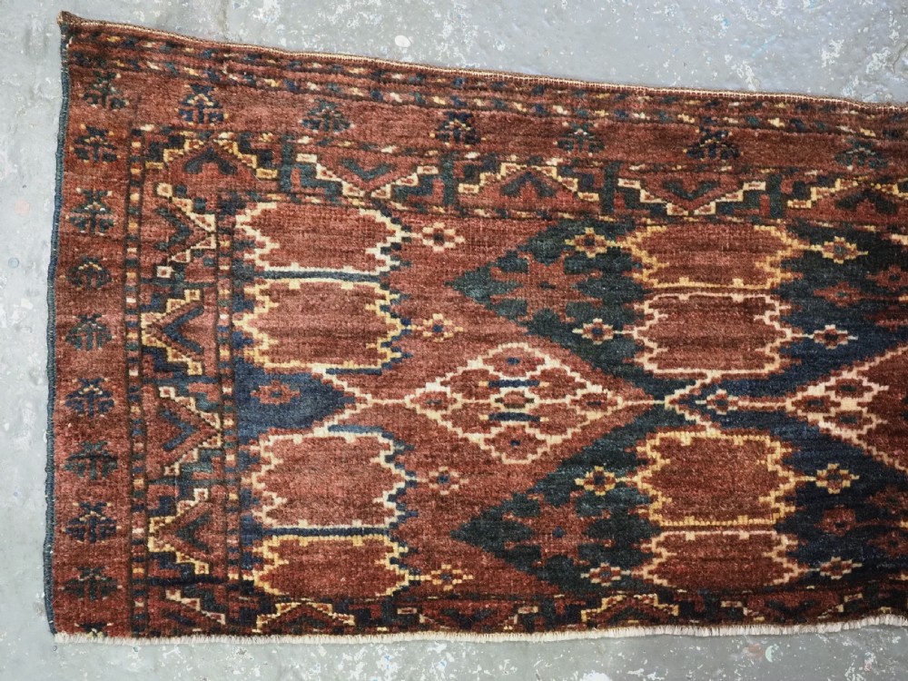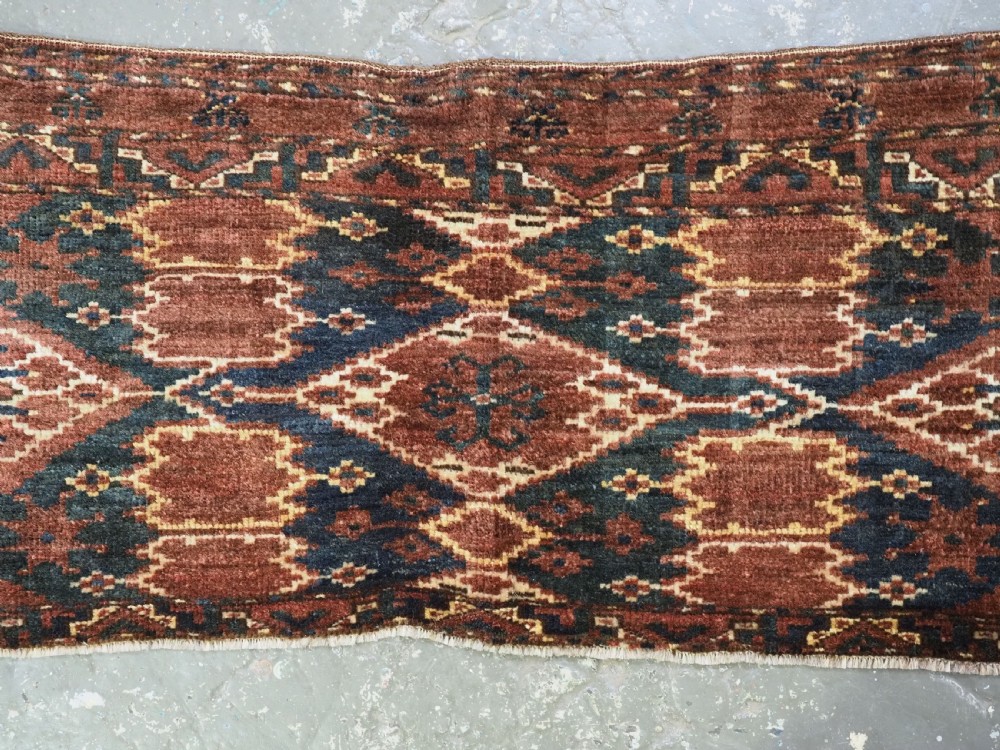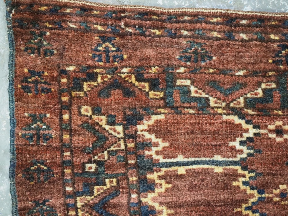 Size: 4ft 6in x 1ft 6in (137 x 46cm) Antique Ersari Beshir Turkmen torba of classic ikat design. Circa 1890. A good example of Beshir weaving, a classic Beshir ikat design with soft smoked earth colour. Note the stars to the central field and the small flowers all around the outside edges. These weavings are often considered to be dowry weavings as they were used to decorate the camel during the wedding procession. The torba face is bowed in shape due to years of hanging in a yurt The torba is in excellent condition with very slight wear and full pile, it has a very soft floppy handle. Stock Number: D-0540. All of our prices include FREE WORLD WIDE EXPRESS DELIVERY by DHL. To purchase any item please click on the payment link. We are also happy to accept most payment methods including American Express, bank transfers, debit & credit cards. To purchase by card over the telephone, please contact us on 01608 652111 or 0044 1608 652111 from outside the UK. Internal Ref: D-0540