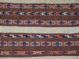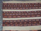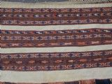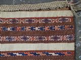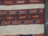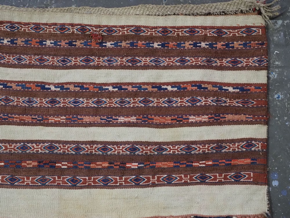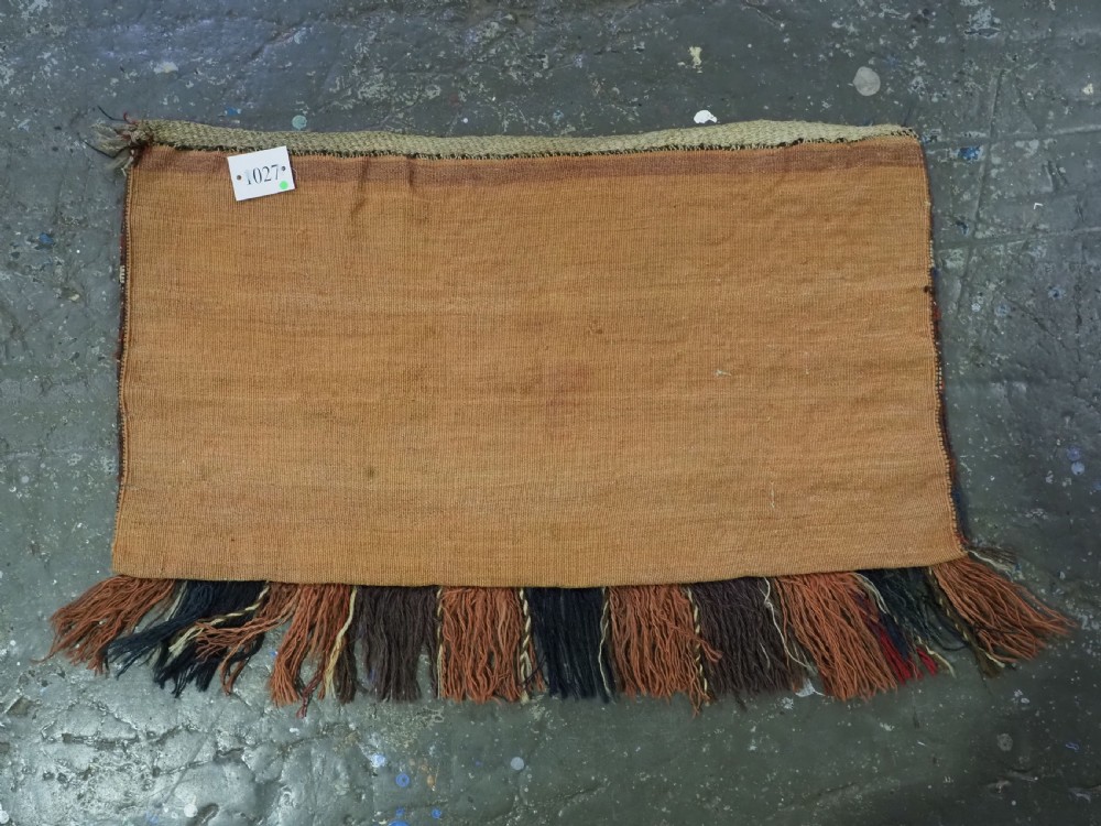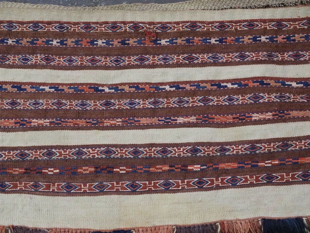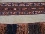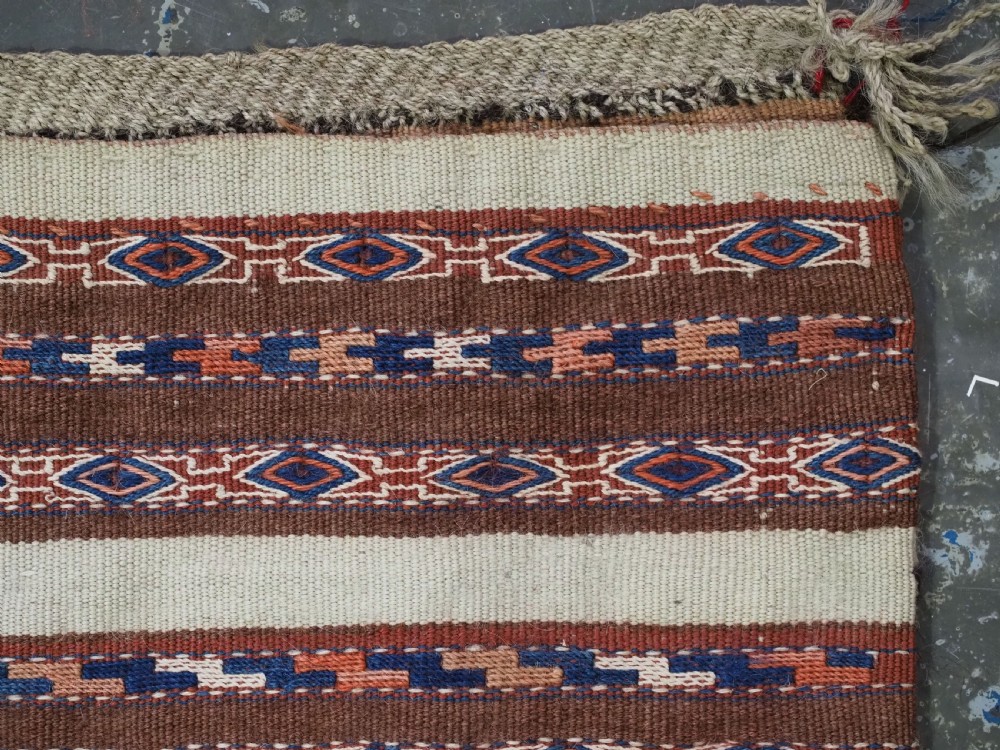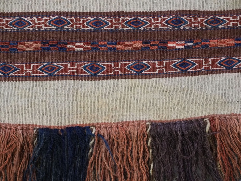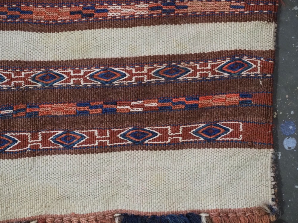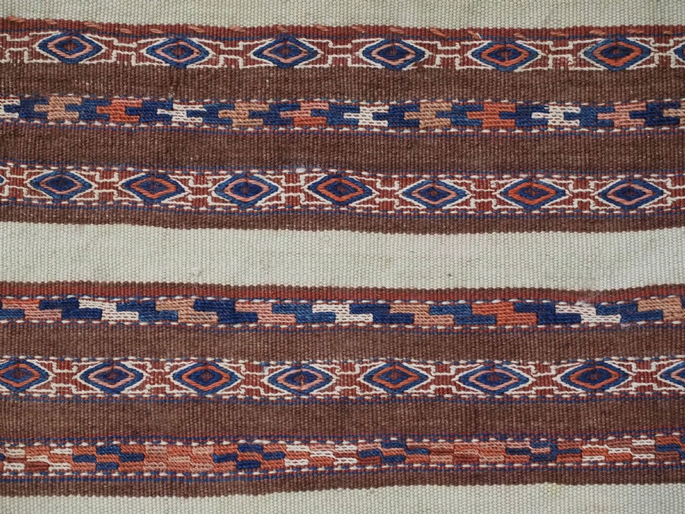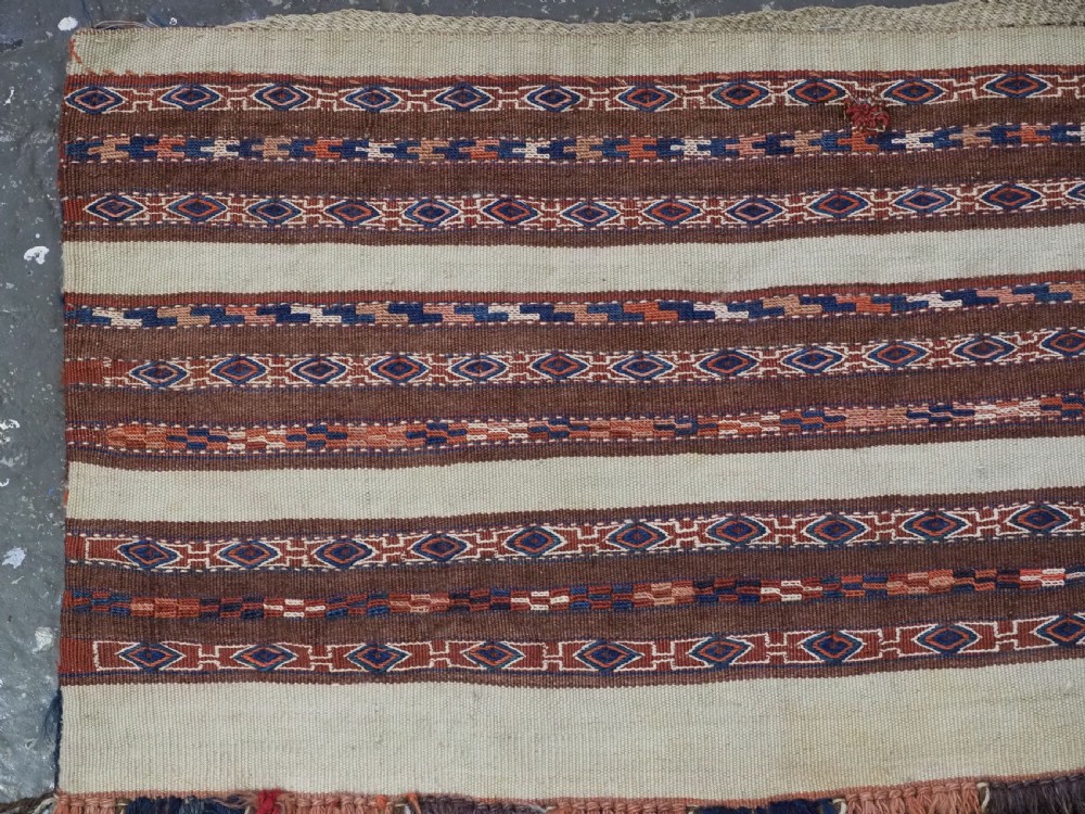 Size: 2ft 6in x 1ft 5in (75 x 42cm) face size. Antique Yomut Turkmen mafrash / torba in banded flatweave design. Circa 1900/20. This small bag would have been used for the storage of personal belongings. The bag has fine bands of flat woven designs on an soft brown and ivory ground. The bag is complete with its original plain weave back, hanging cords and the original tassels at the base. The bag is in excellent condition with some signs of tribal use. Stock Number: D-1027. All of our prices include FREE WORLD WIDE EXPRESS DELIVERY by DHL. To purchase any item please click on the payment link. We are also happy to accept most payment methods including American Express, bank transfers, debit & credit cards. To purchase by card over the telephone, please contact us on 01608 652111 or 0044 1608 652111 from outside the UK. Internal Ref: D-1027