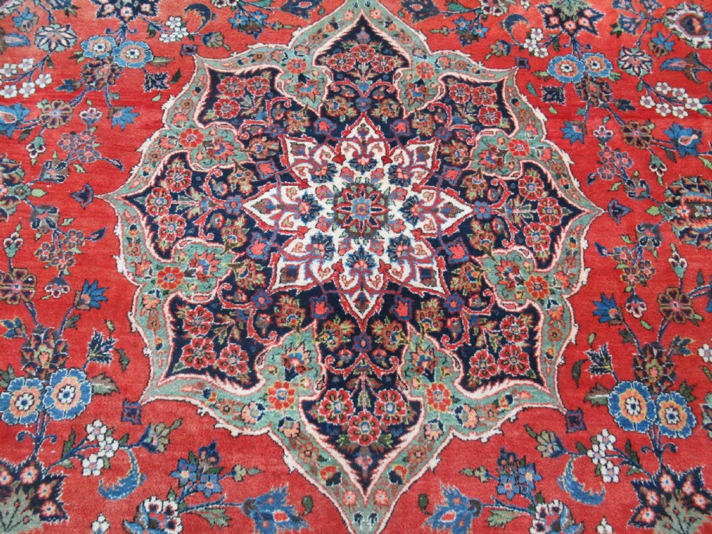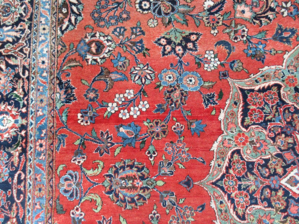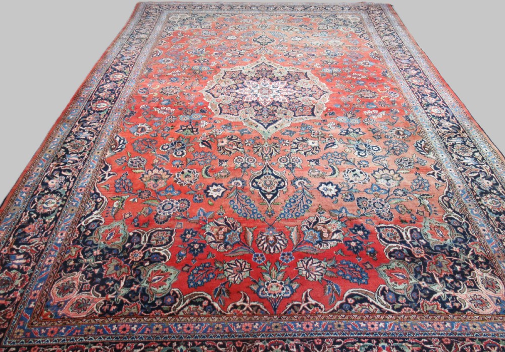 Size: 16ft 5in x 10ft 6in (500 x 320cm). Antique Kashan carpet of classic design and good colour. Circa 1930. The carpet has a small central medallion which is surrounded by a field of floral designs on a clear red ground. The border is of a classic Kashan design on a dark indigo blue ground, it contrasts well with the field of the carpet. The carpet is in good condition with slight wear and good pile, the carpet has slight fading in places as can bee seen in the images. The carpet is suitable for heavy domestic use such as a dining or living room. The carpet has been hand washed and is ready for use. Stock Number: R-2332. All of our prices include FREE WORLD WIDE EXPRESS DELIVERY by DHL. To purchase any item please click on the payment link. We are also happy to accept most payment methods including American Express, bank transfers, debit & credit cards. To purchase by card over the telephone, please contact us on 01608 652111 or 0044 1608 652111 from outside the UK. Internal Ref: R-2332