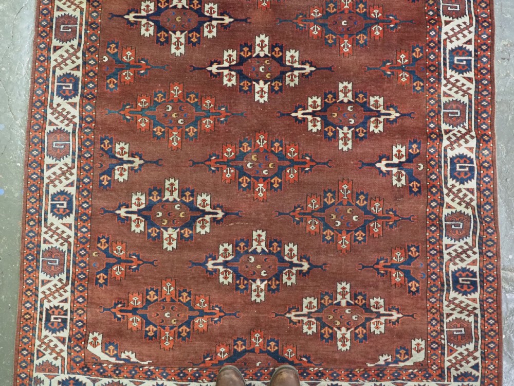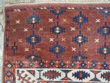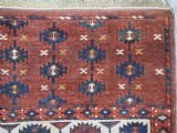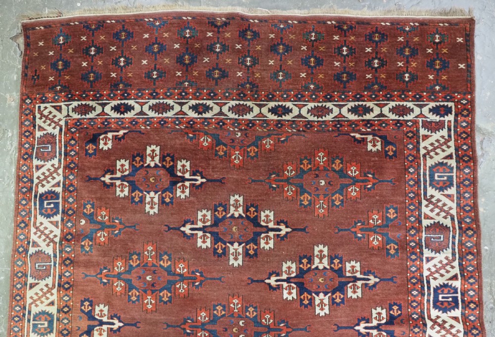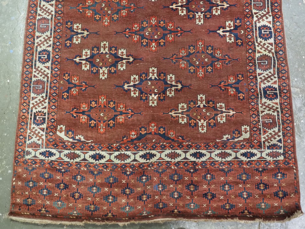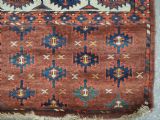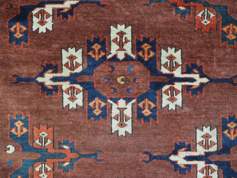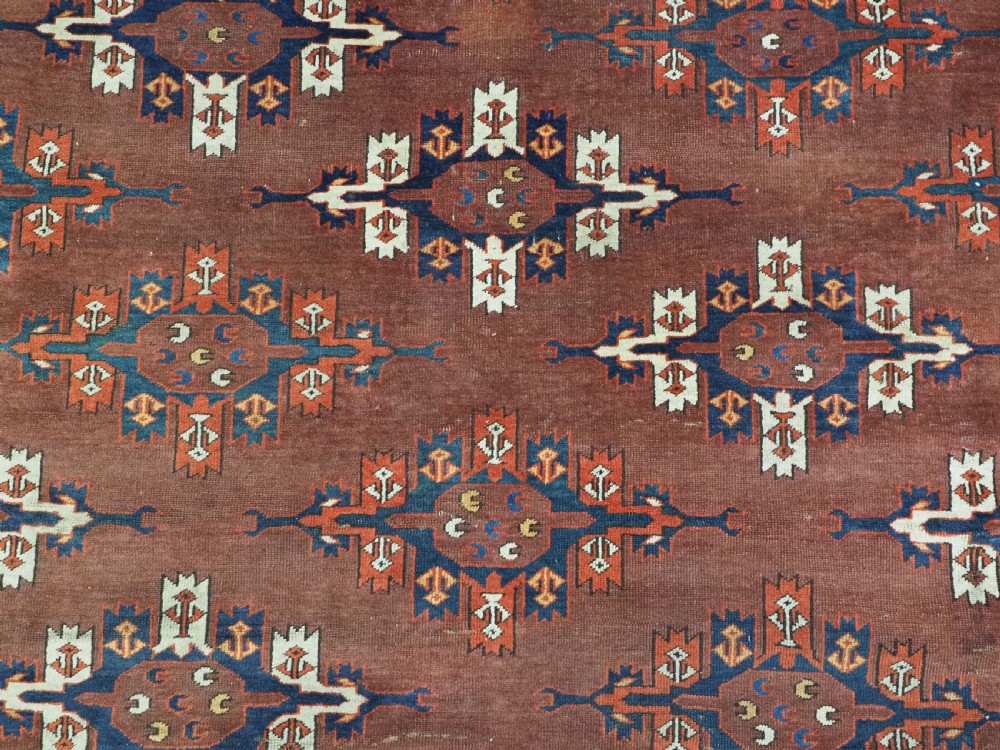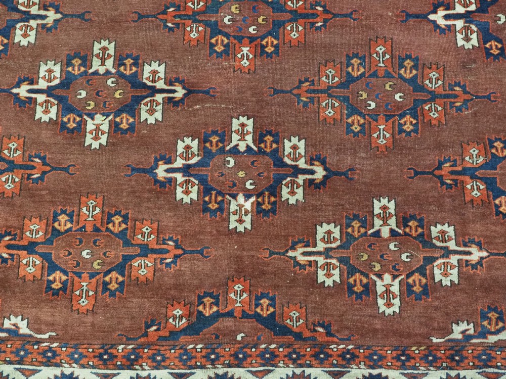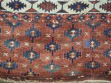 The carpet has a rich mahogany brown ground colour with diagonal rows of large kepse guls in alternating colours. The kepse guls all contain the c-centres; which is an unusual feature and often points to an early date. The main vertical border is a variation of the Yomut 'curled leaf' design, on an ivory coloured ground. The kepse guls are very large and well drawn with a very spacious feel. The large elem end panels are a feature of the carpet, they also point towards an early date. The elems are complete with no losses and retain a small kilim end finish.