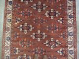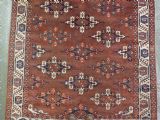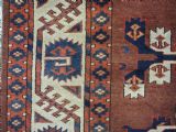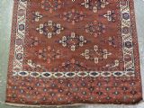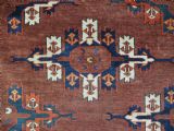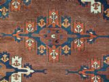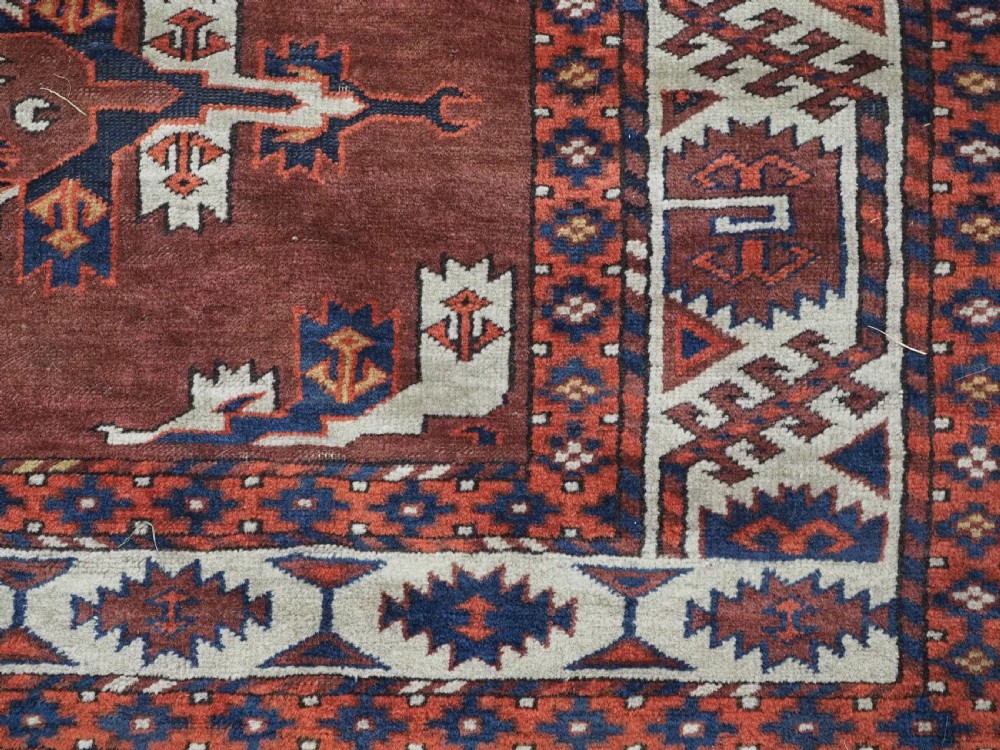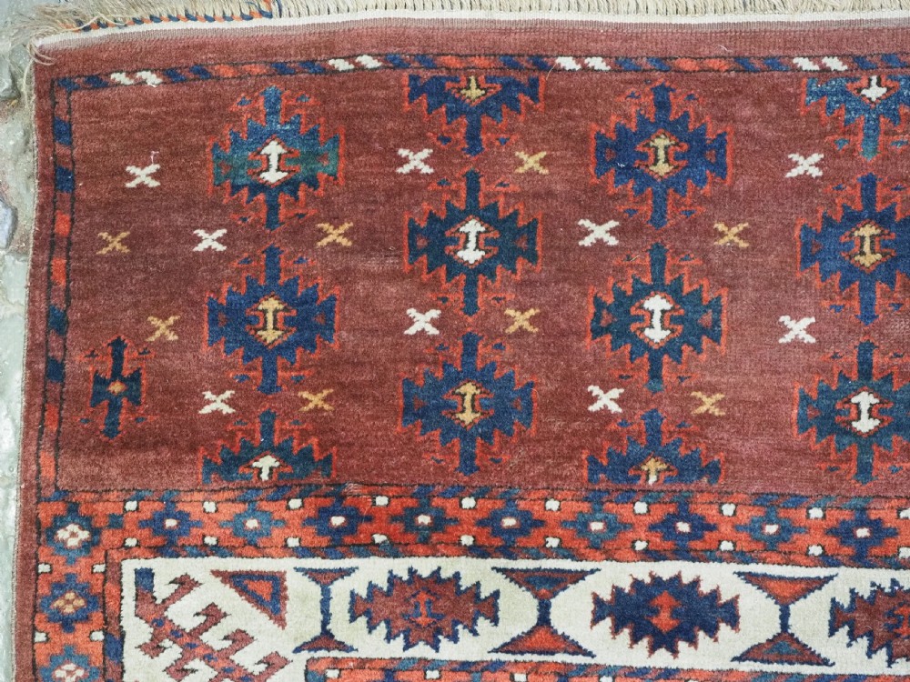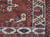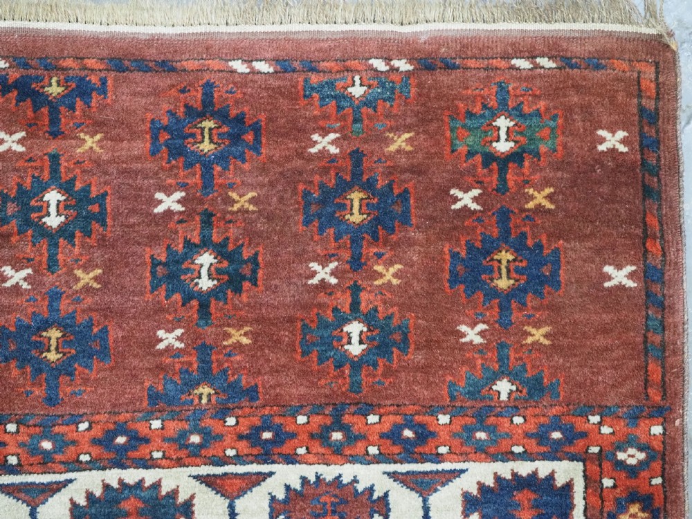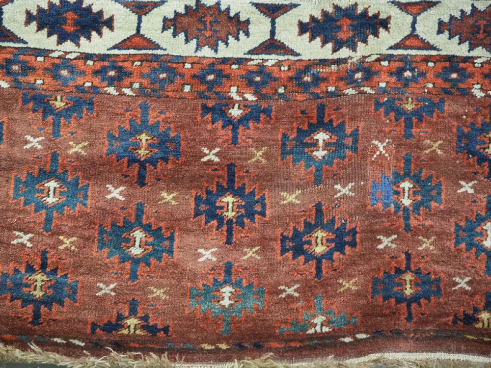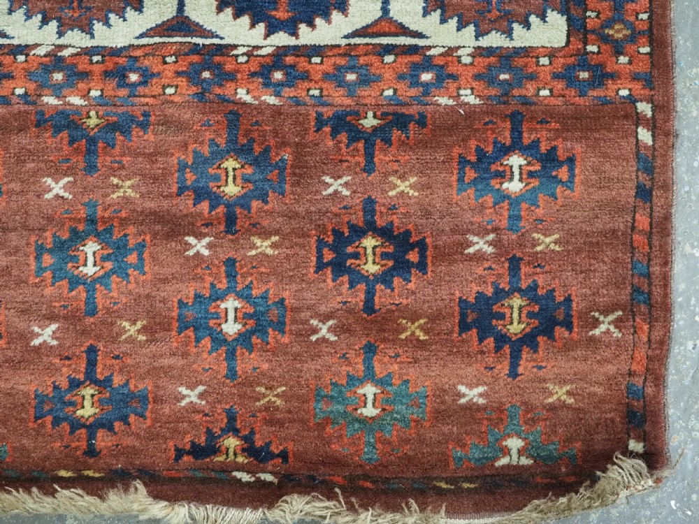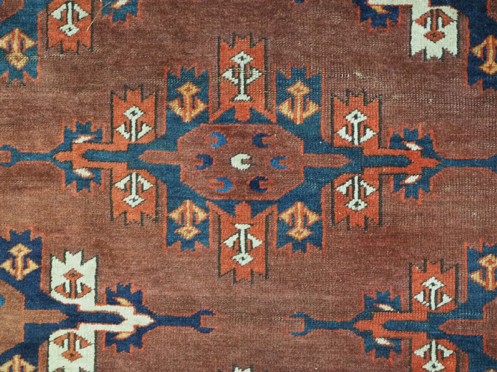 The carpet has a rich mahogany brown ground colour with diagonal rows of large kepse guls in alternating colours. The kepse guls all contain the c-centres; which is an unusual feature and often points to an early date. The main vertical border is a variation of the Yomut 'curled leaf' design, on an ivory coloured ground. The kepse guls are very large and well drawn with a very spacious feel. The large elem end panels are a feature of the carpet, they also point towards an early date. The elems are complete with no losses and retain a small kilim end finish.